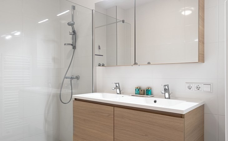 There are 2 bedrooms, each with 2 single beds, a smart TV with streaming capability and an en suite bathroom. One en suite bathroom is equipped with a walk-in shower, a double washbasin, and a toilet. The other en suite bathroom has a shower and washbasin. A separate toilet is available in the apartment too.