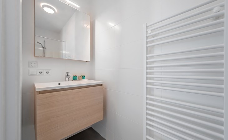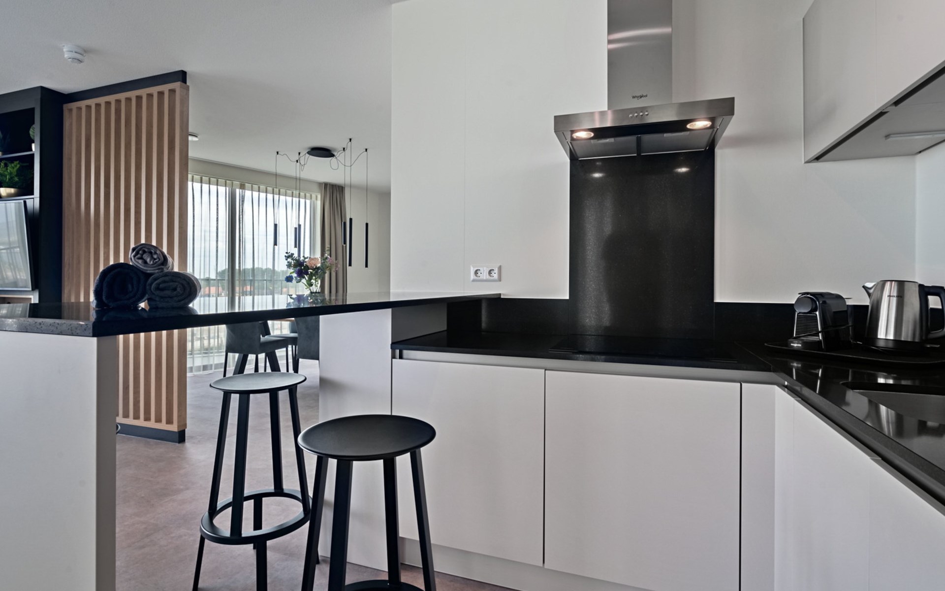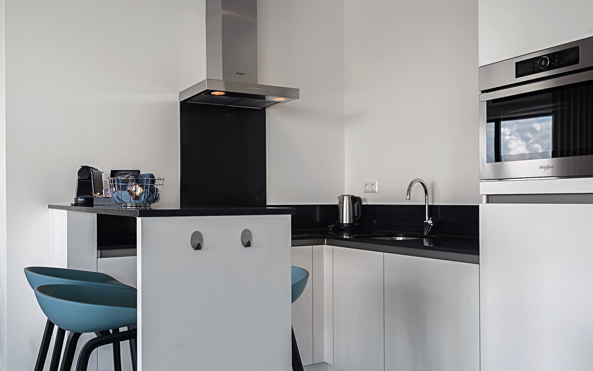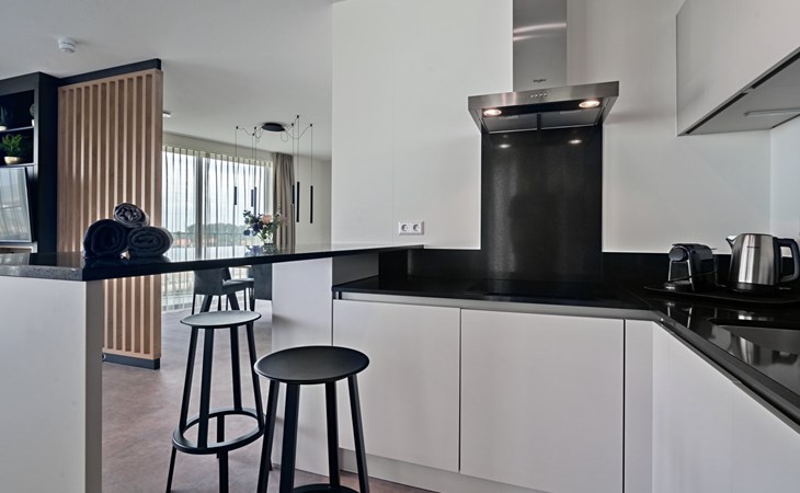 The spacious living room offers a charming seating area with a smart TV with streaming capability. There is also a dining area and a modern kitchen. The open kitchen is equipped with all modern conveniences, including a fridge and freezer, a combi oven, a Nespresso coffee machine, and a dishwasher. You won’t want for anything during your stay at Dormio Breskens Apartments & Penthouses!