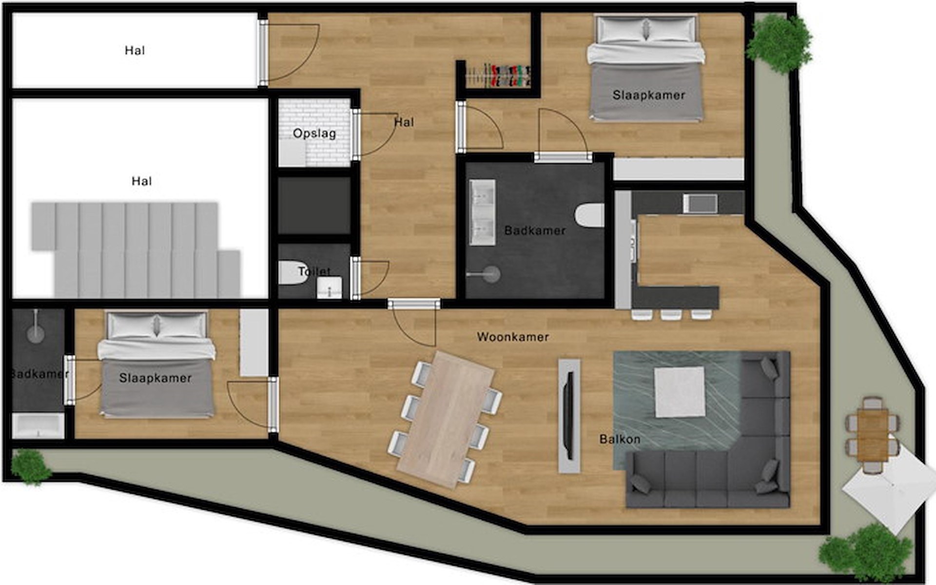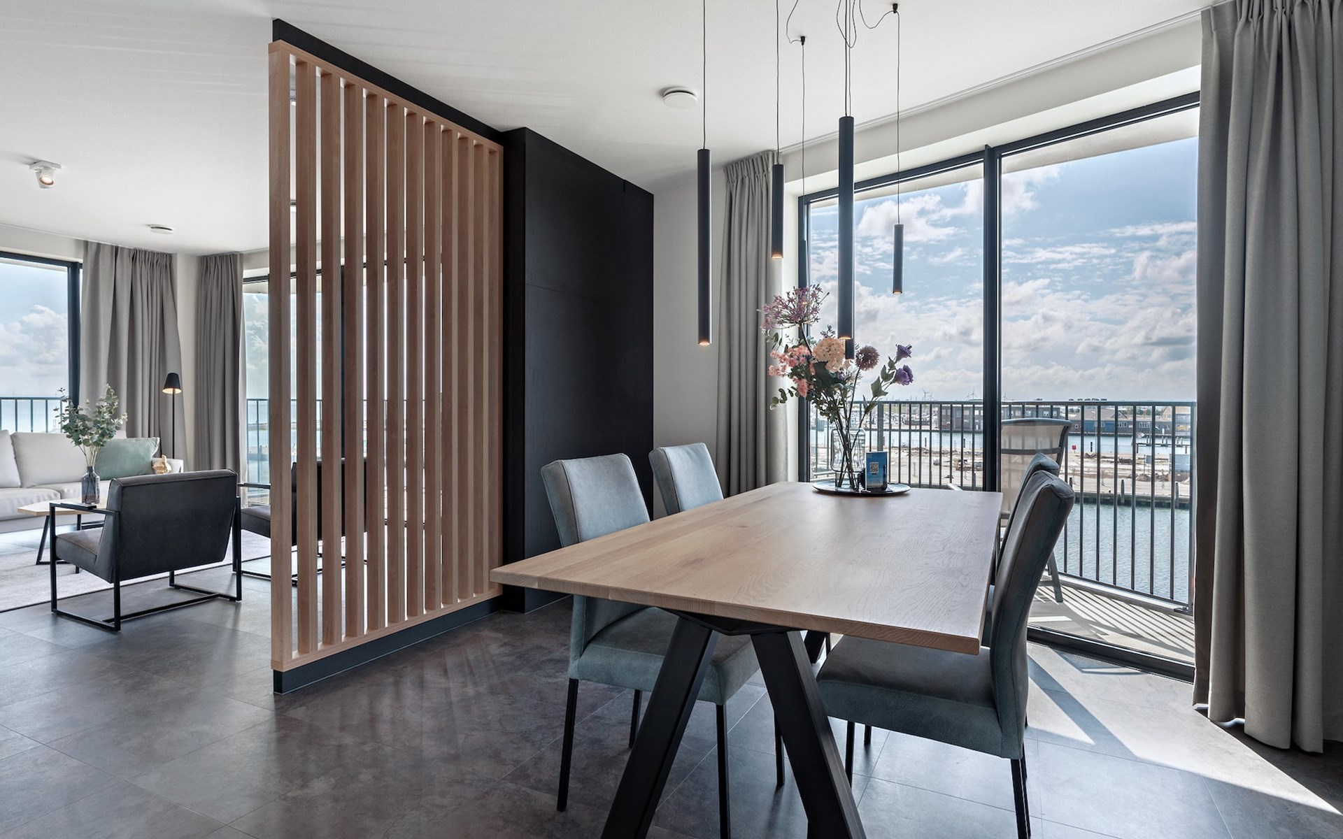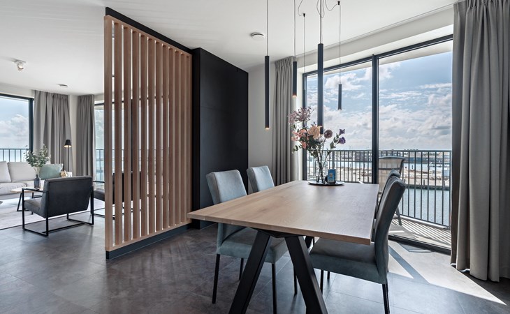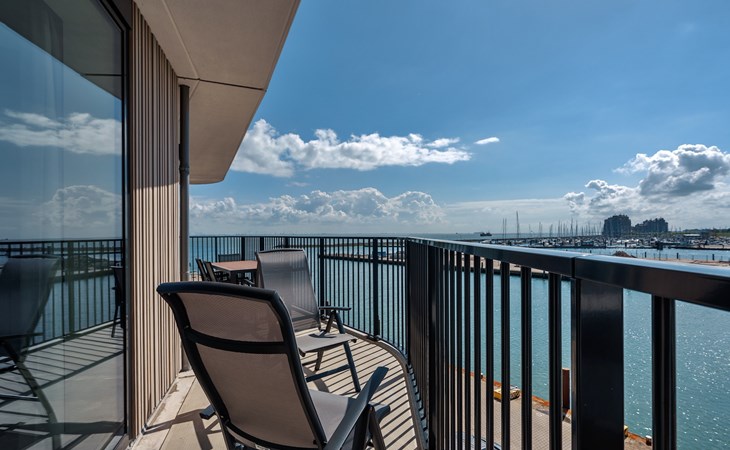 From the sliding door in the living room, you can access the furnished balcony that continues to the side of the apartment. From the balcony you have a beautiful view over the marina of Breskens and the Westerschelde.