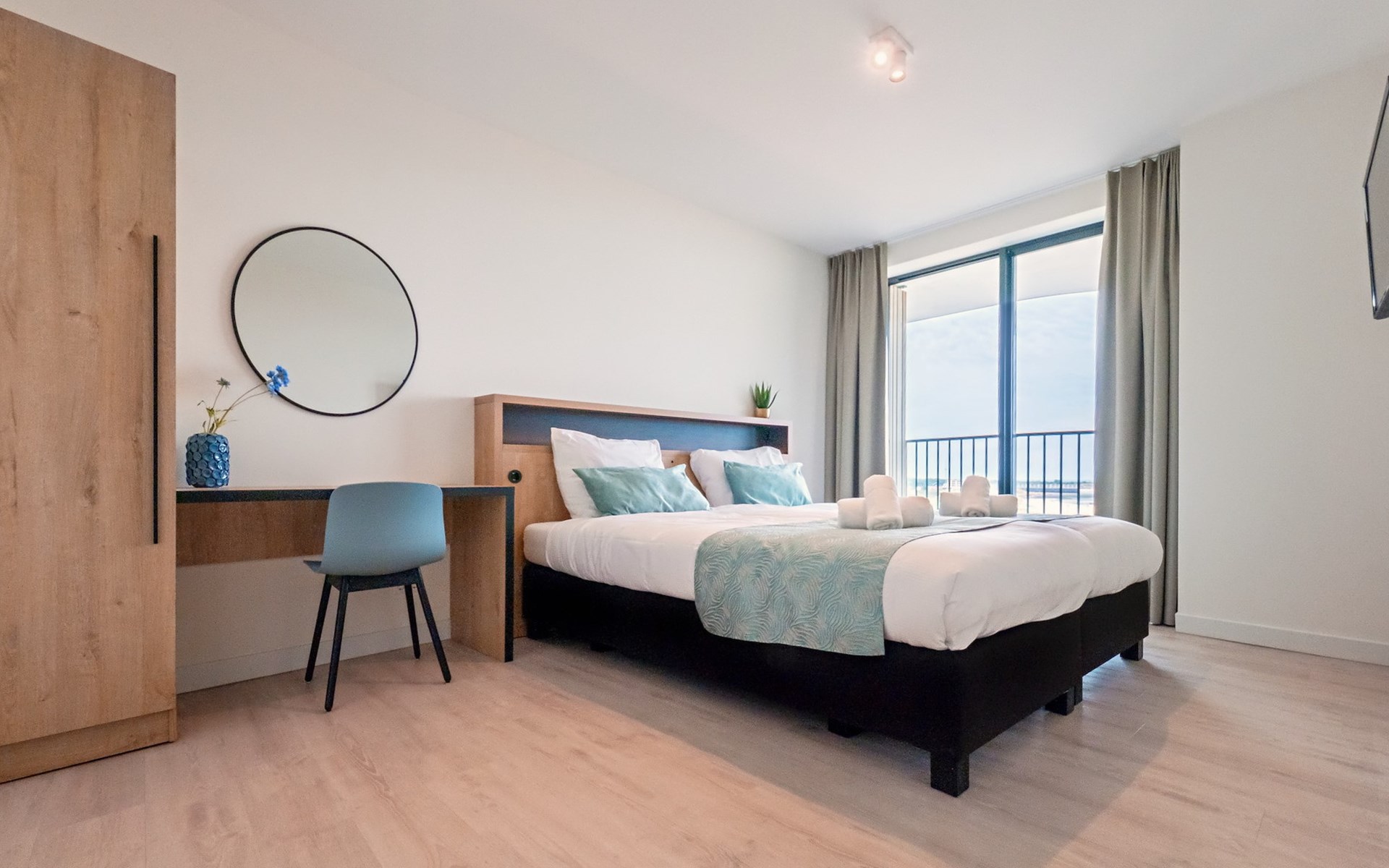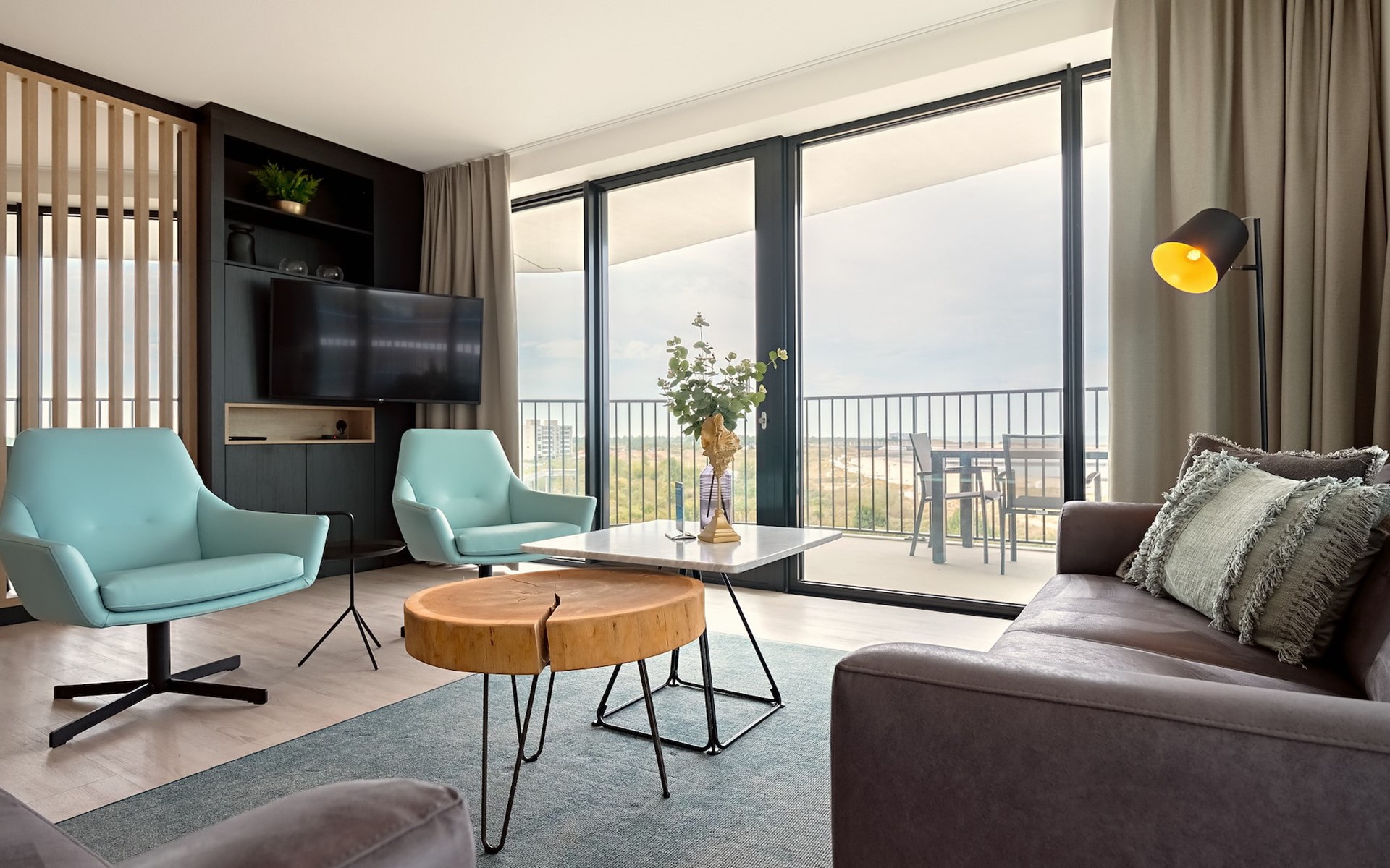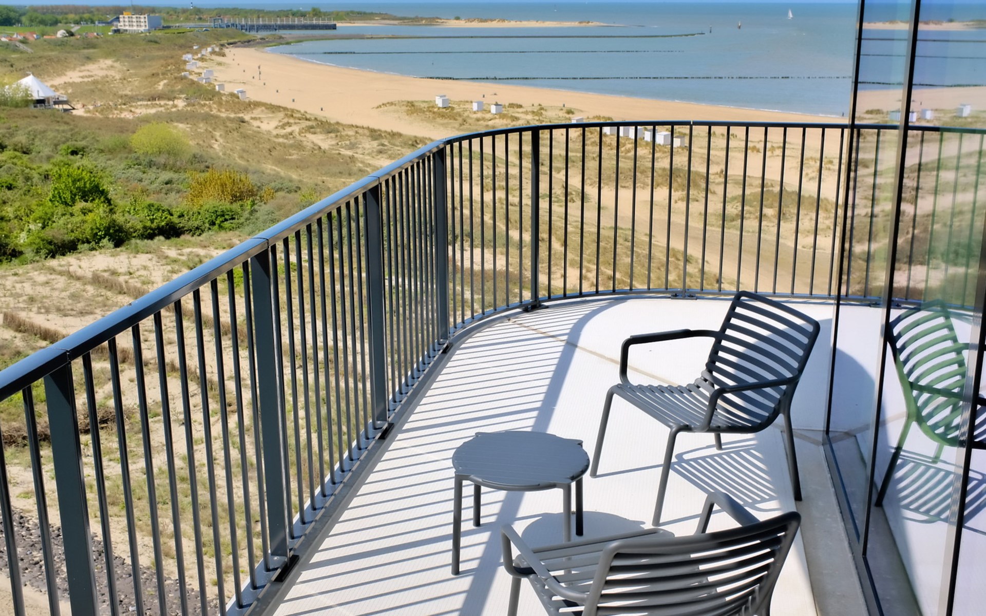 The spacious balcony is located all around the apartment and offers multiple viewpoints over the surrounding area, including the North Sea. A wonderful place to get together with the whole travel party and enjoy a delicious bite or drink! The balcony is accessible from the living room and all bedrooms.