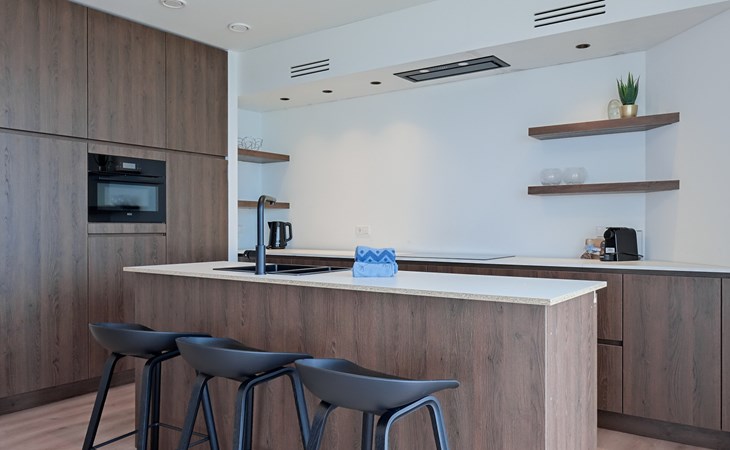 The spacious living room features a comfortable seating area with a smart TV with streaming capability. There is also a dining area, where you can enjoy a delicious meal with your whole travel party. The open kitchen is equipped with all modern conveniences, including a fridge and freezer, a combi oven, a Nespresso coffee machine, and a dishwasher.