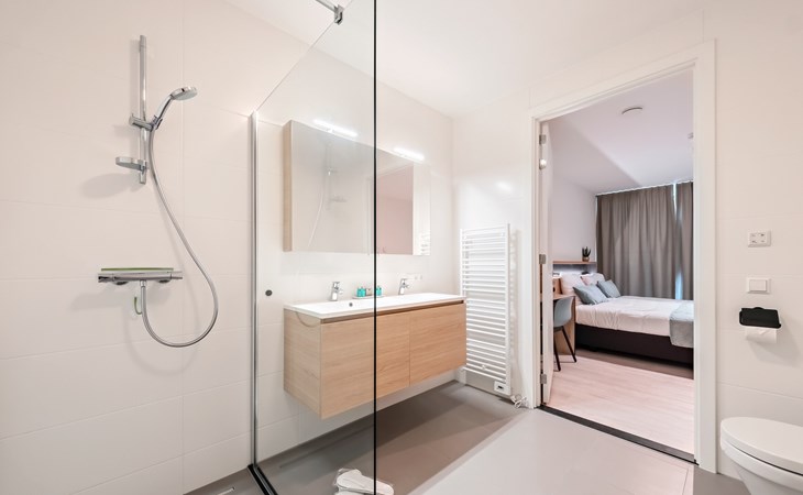 The Ocean Panorama apartment offers 3 bedrooms with a two single beds. One bedroom has an en suite bathroom, with a walk-in shower, a double washbasin, and a toilet. The other bathroom is accessible via the hallway. This bathroom offers a shower and a double washbasin. There also is a separate toilet.