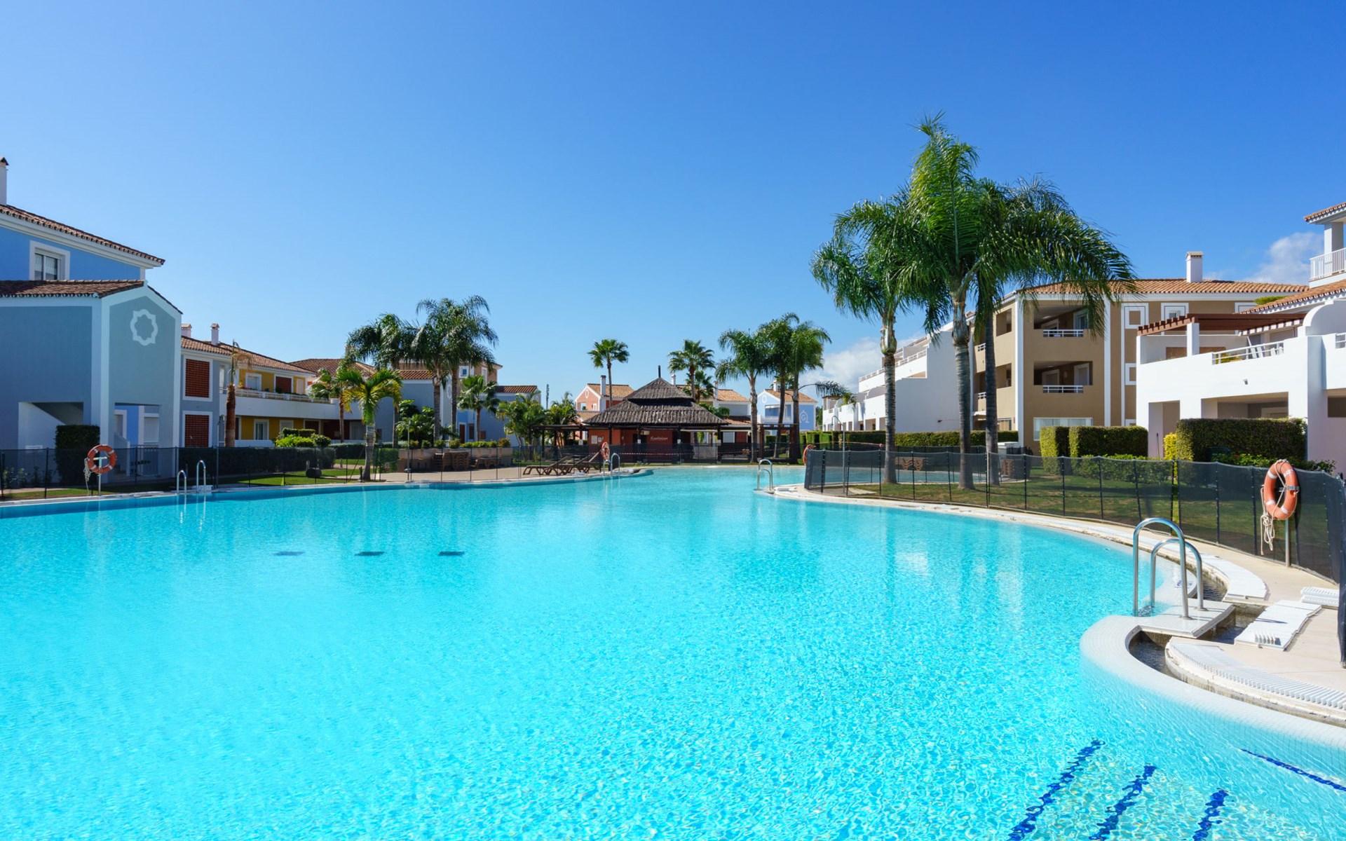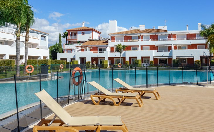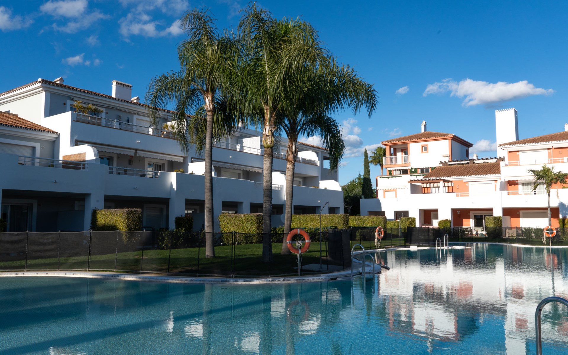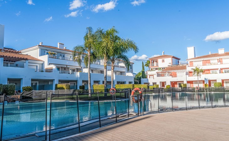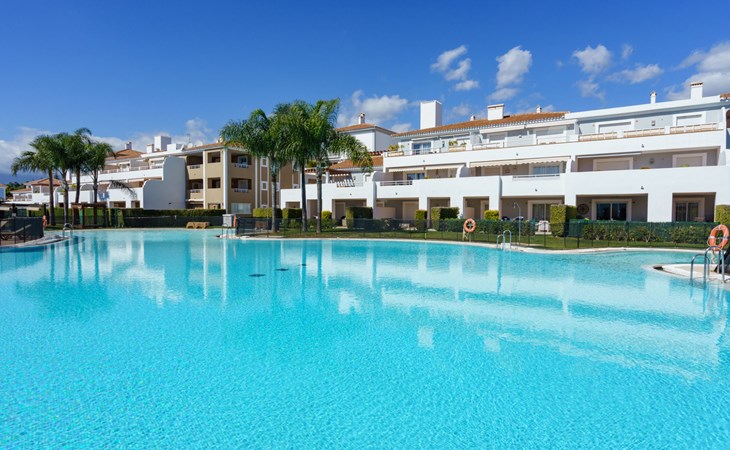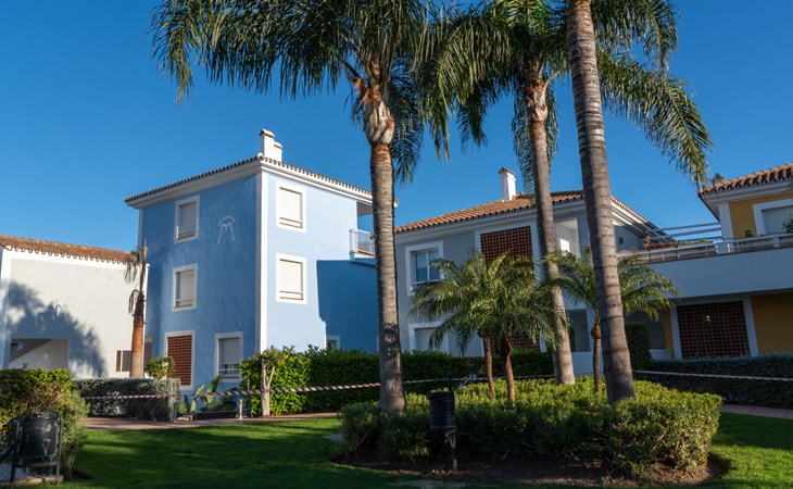 Very beautiful, cosy, very comfortable resort "Cortijo del Mar", built in 2011, surrounded by trees. 5 km from the centre of San Pedro de Alcantara, 14 km from the centre of Estepona, outside the resort, 16 km from the centre of Marbella, in the district El Paraiso, in a quiet, sunny position, traffic calmed area, 1.6 km from the sea, 2.6 km from the beach. For shared use: garden with lawn, natural garden, lawn for sunbathing, swimming pool kidney-shaped (43 x 23 m, depth 100 - 210 cm, seasonal availability: 01.Apr. - 15.Oct. pool opening hours: 11:00-18:00 and 11:00-20:00). Shower/WC in the pool area, children's pool, outdoor shower. Shop, supermarket, restaurant 500 m, bus stop "El Pilar" 800 m, sandy beach "Playa Salduna" 2.6 km. Sports harbour 9 km, marina 9 km, golf course (18 hole) 2.4 km. The owner does not accept any youth groups. Please note: guarded residence. Additional accommodations can be booked.