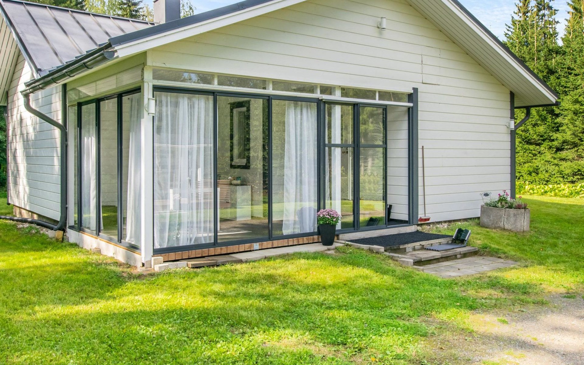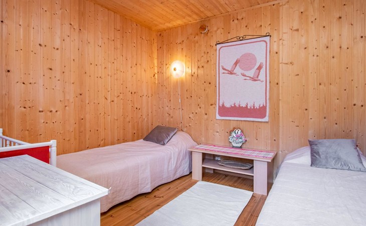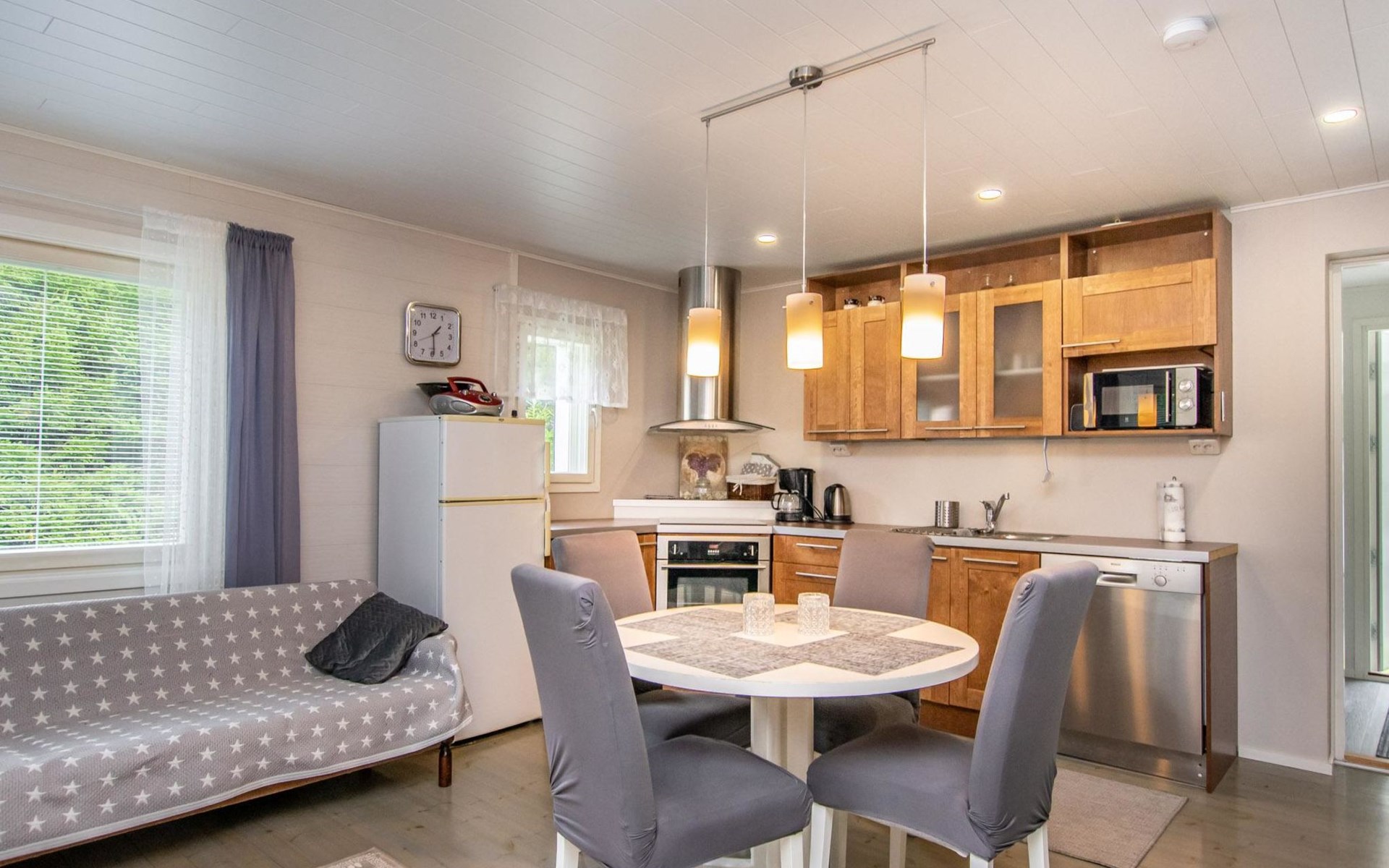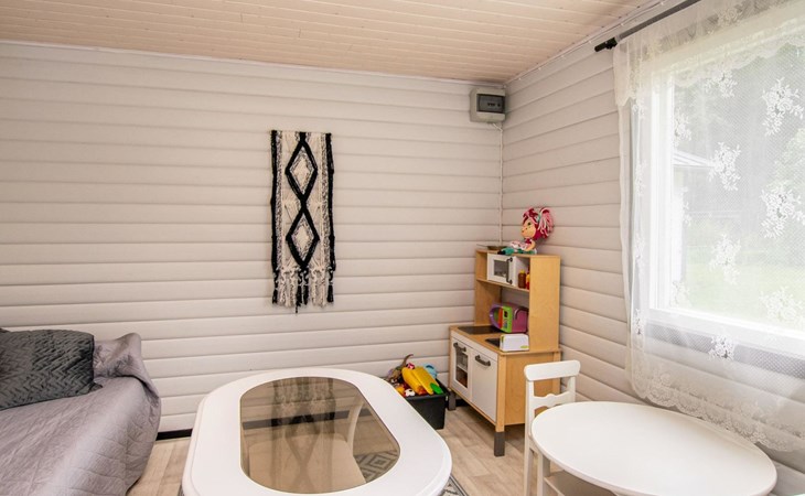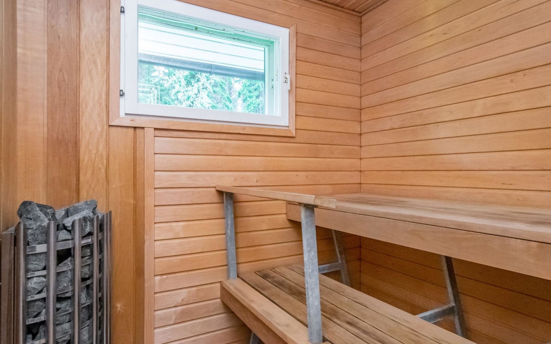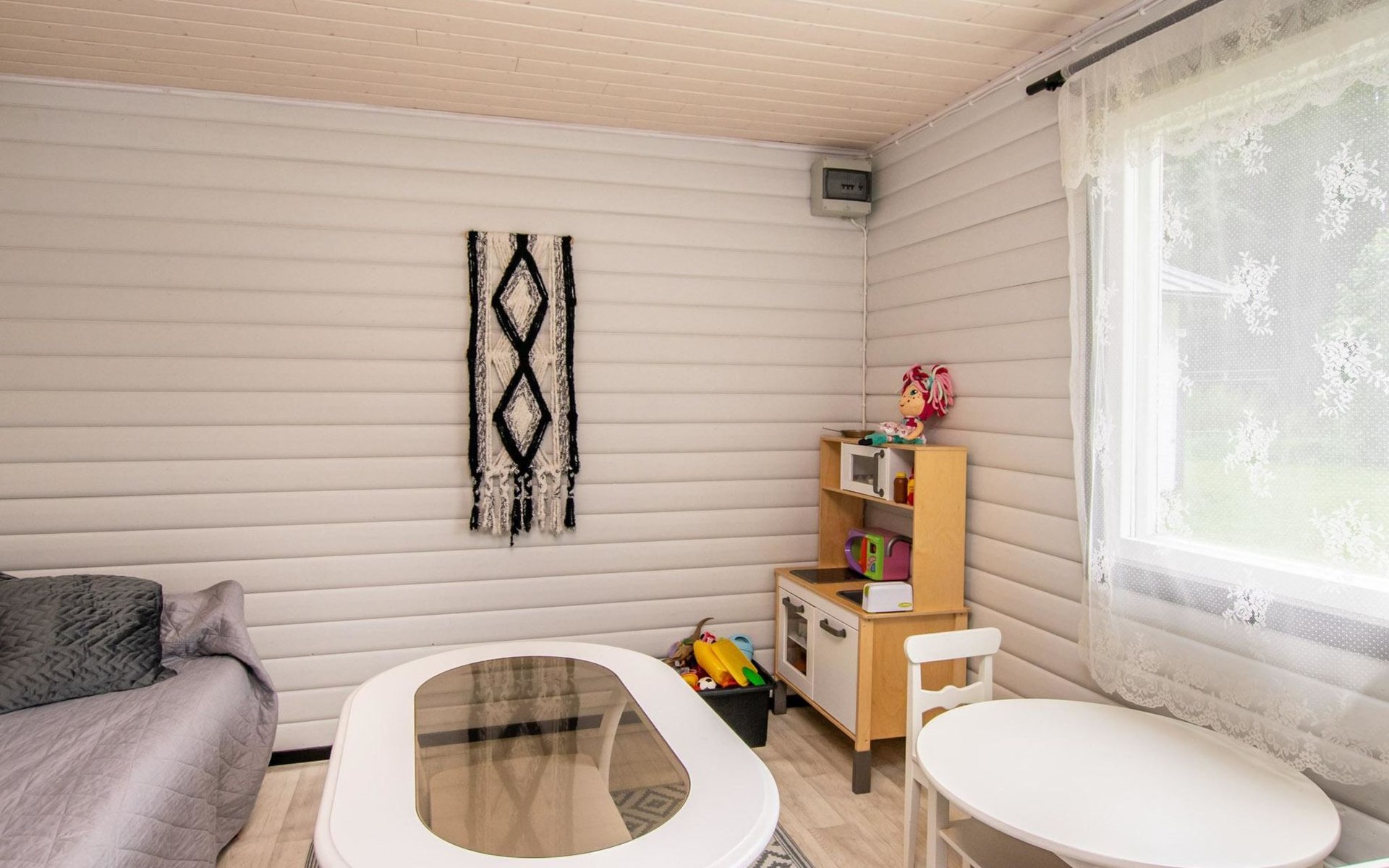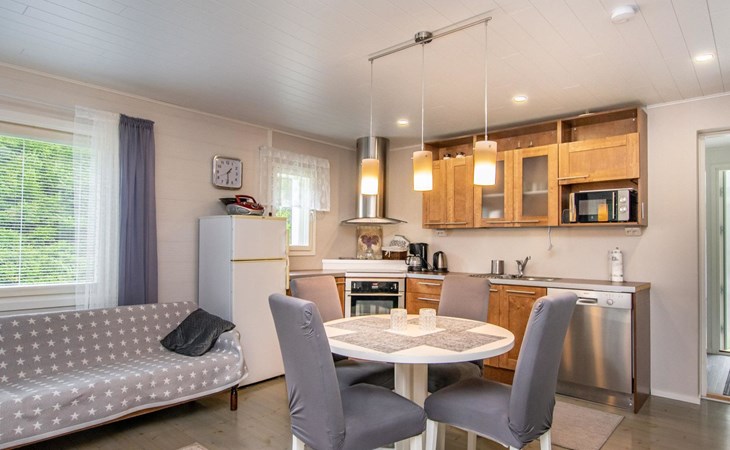 Wooden cottage 1958, renovated 2019, kitchen/living room convertible sofa bed and SMART TV, bedroom with 120 cm wide bed, bedroom with double bed (width 160 cm), hall, porch. Sauna (electric stove), bathroom with shower, WC and dressing room.