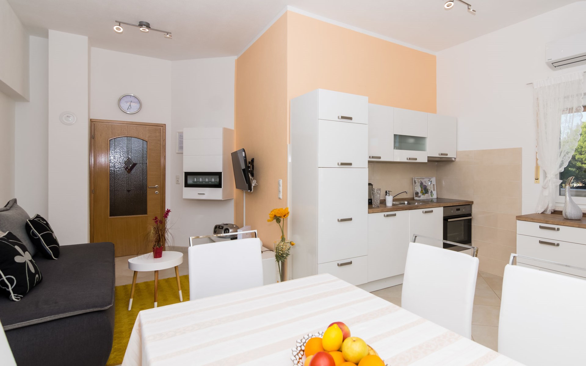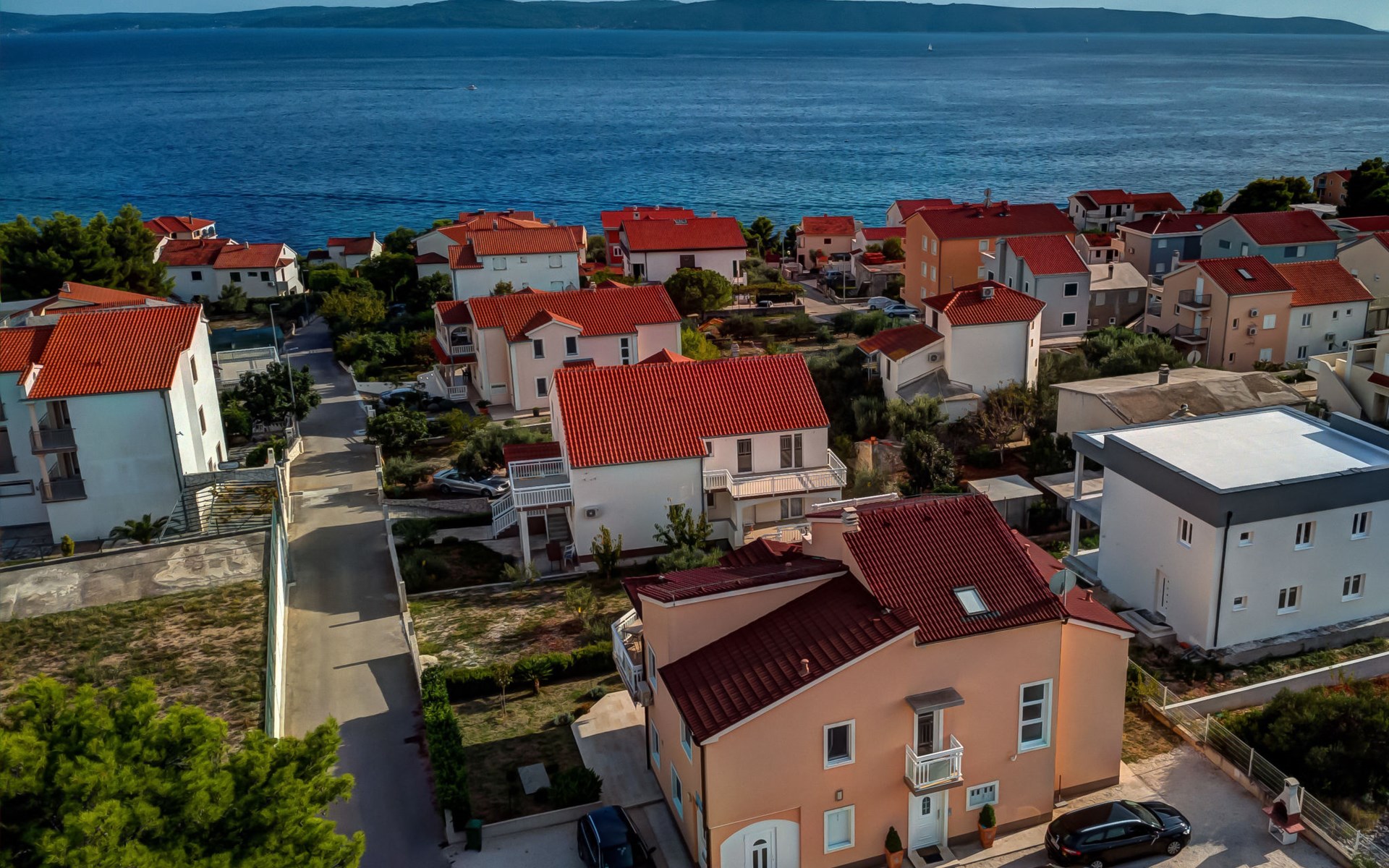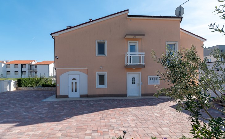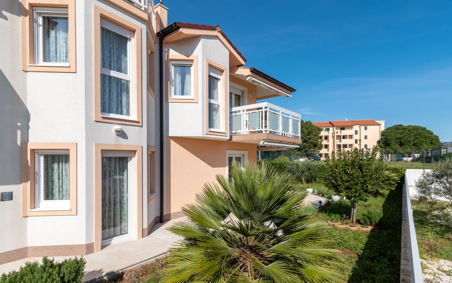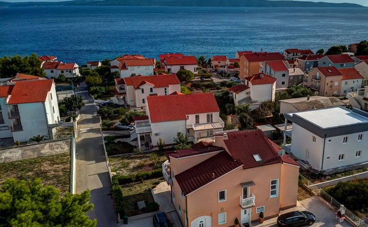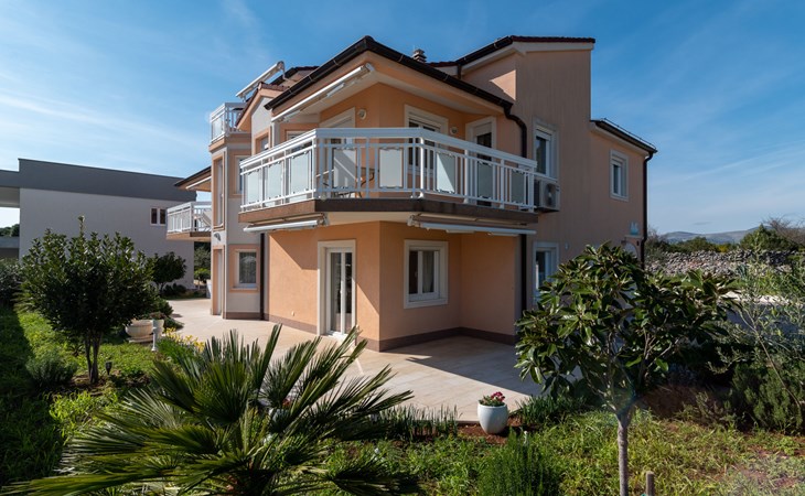 Okrug Gornji (Čiovo) 6 km from Trogir: Beautiful apartment house "Villa Nikaroni". 1.5 km from the centre of Okrug Gornji, in a quiet, sunny position, 250 m from the sea, 250 m from the beach. For shared use: property 1'000 m2, garden with lawn. Barbecue. In the house: internet access. Parking at the house on the premises. Shop, restaurant 650 m, bus stop 2 km, rocky beach 250 m.