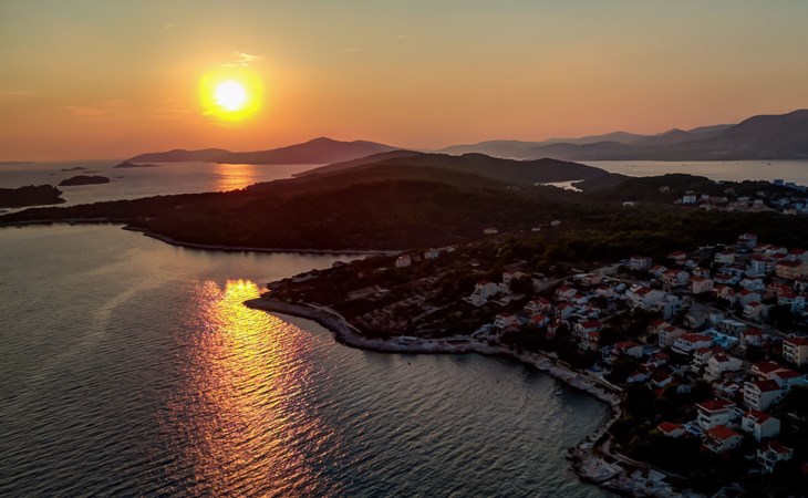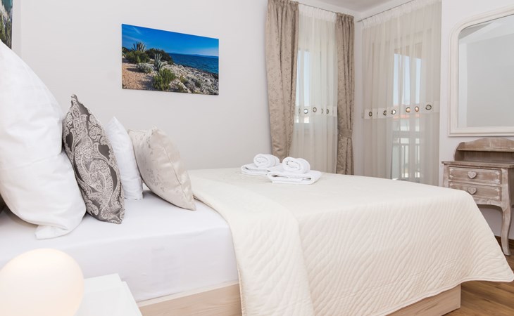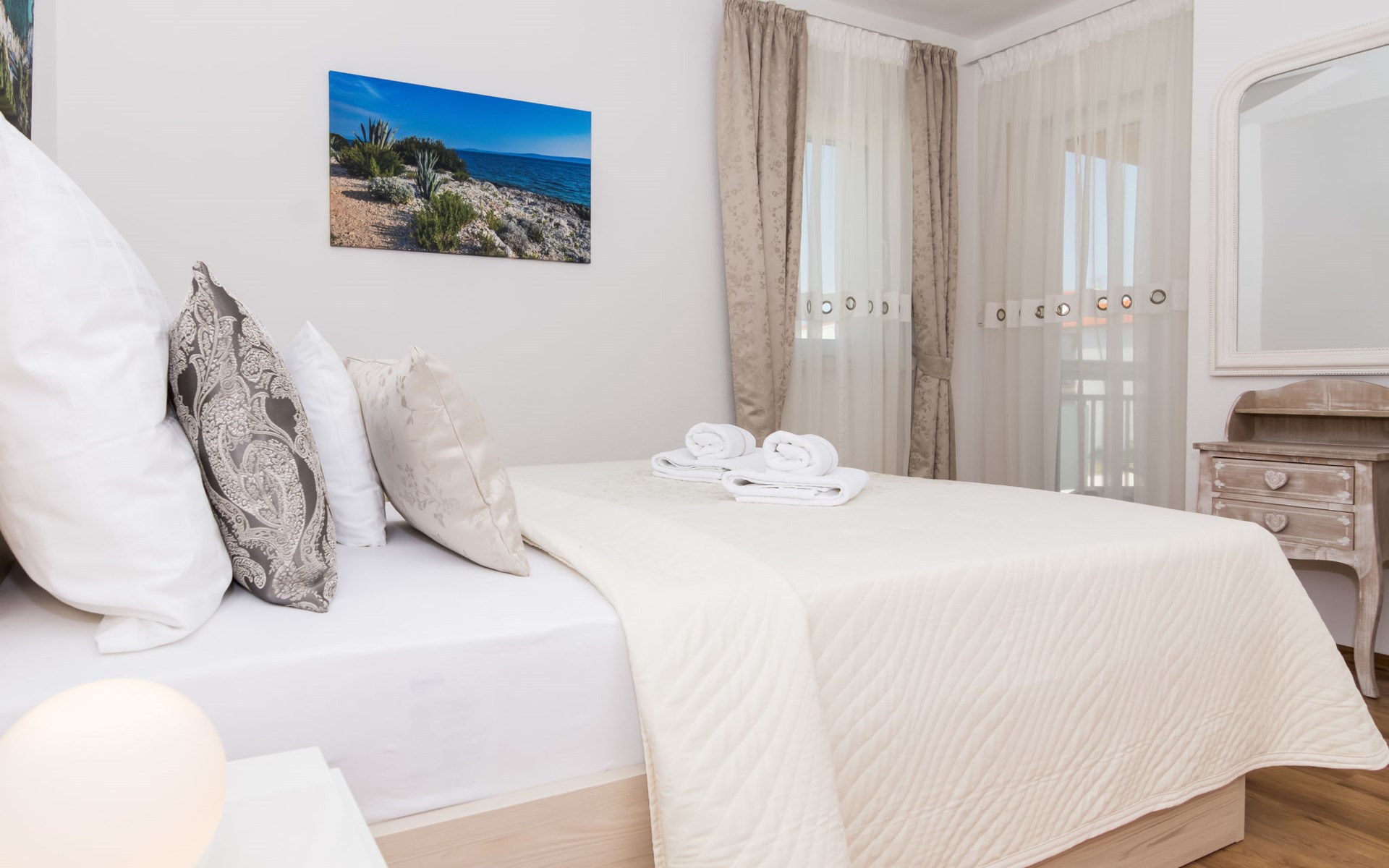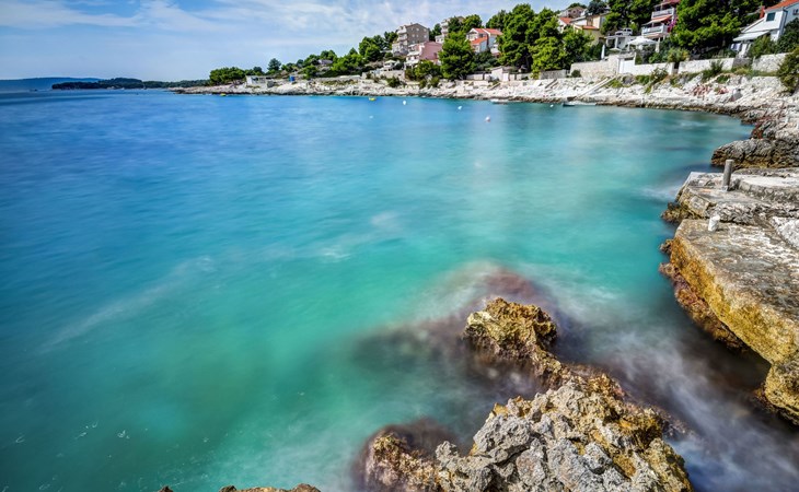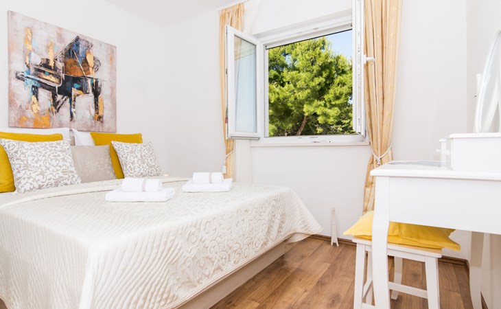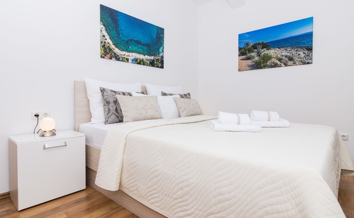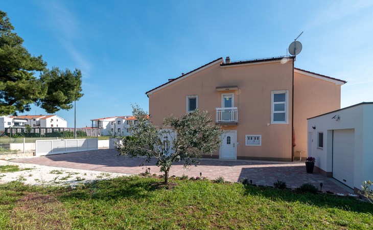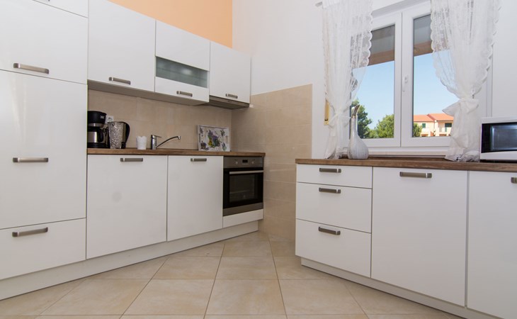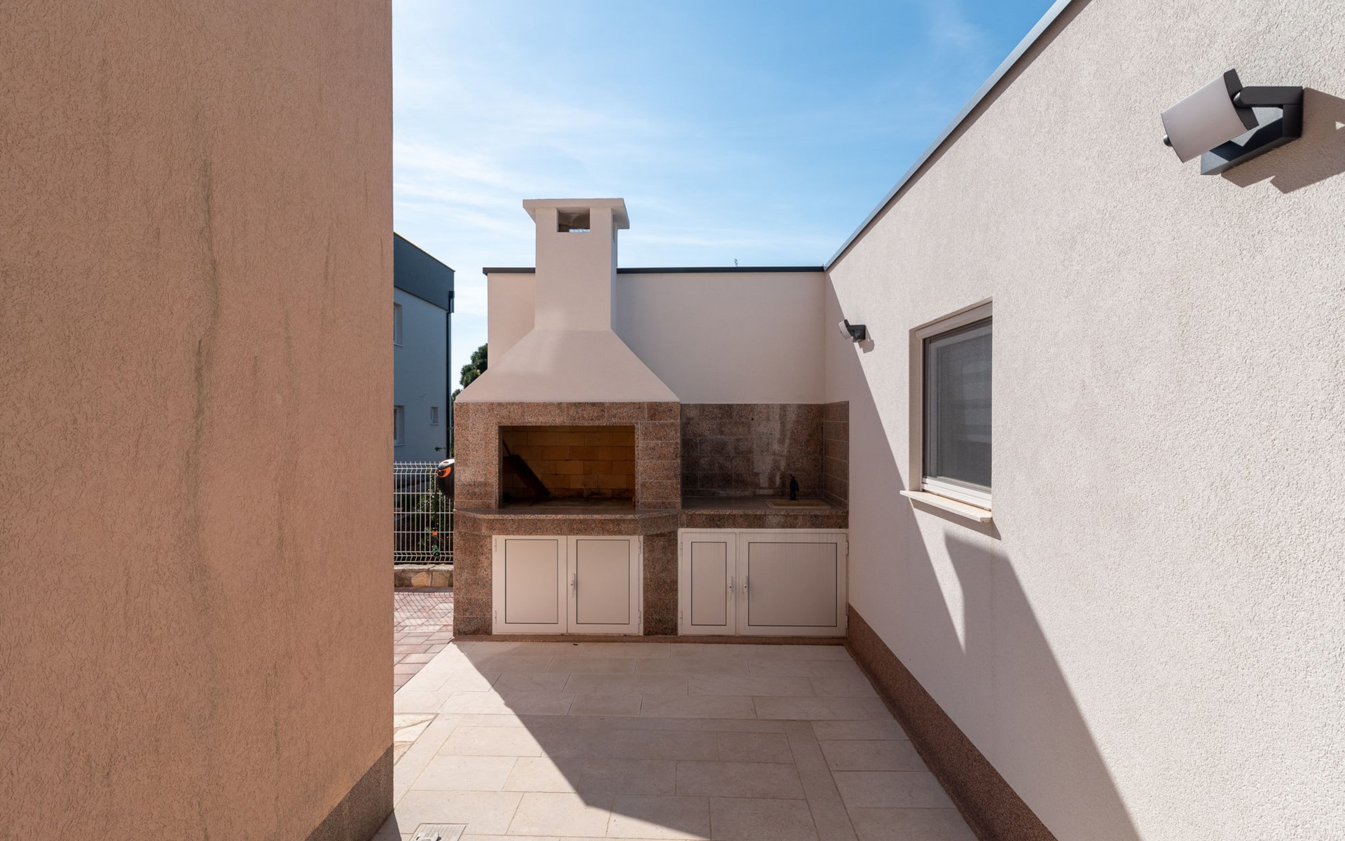 Okrug Gornji (Čiovo) 6 km from Trogir: Beautiful apartment house "Villa Nikaroni". 1.5 km from the centre of Okrug Gornji, in a quiet, sunny position, 250 m from the sea, 250 m from the beach. For shared use: property 1'000 m2, garden with lawn. Barbecue. In the house: internet access. Parking at the house on the premises. Shop, restaurant 650 m, bus stop 2 km, rocky beach 250 m.
