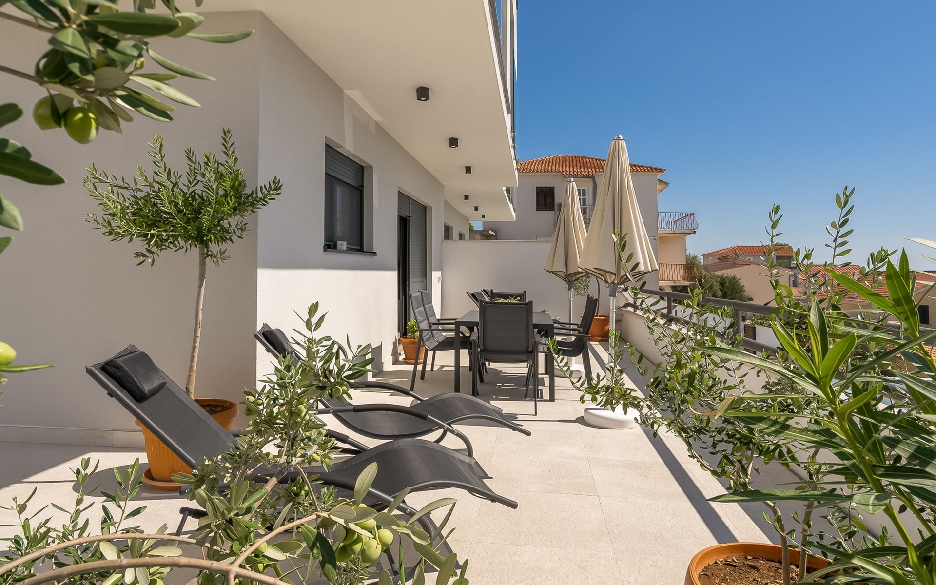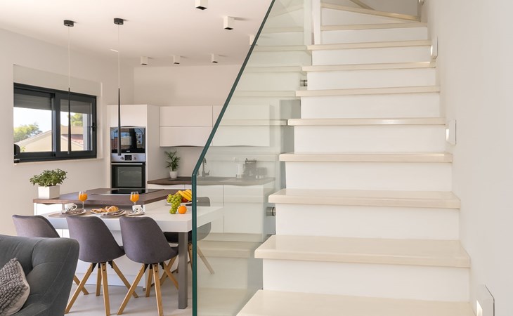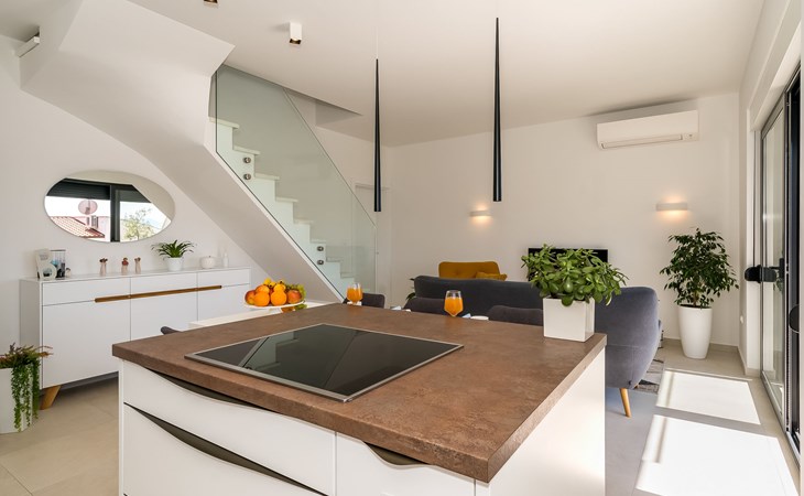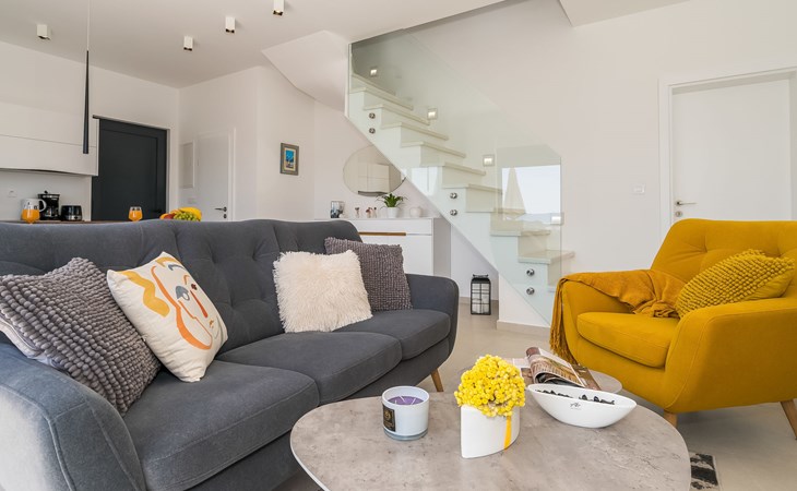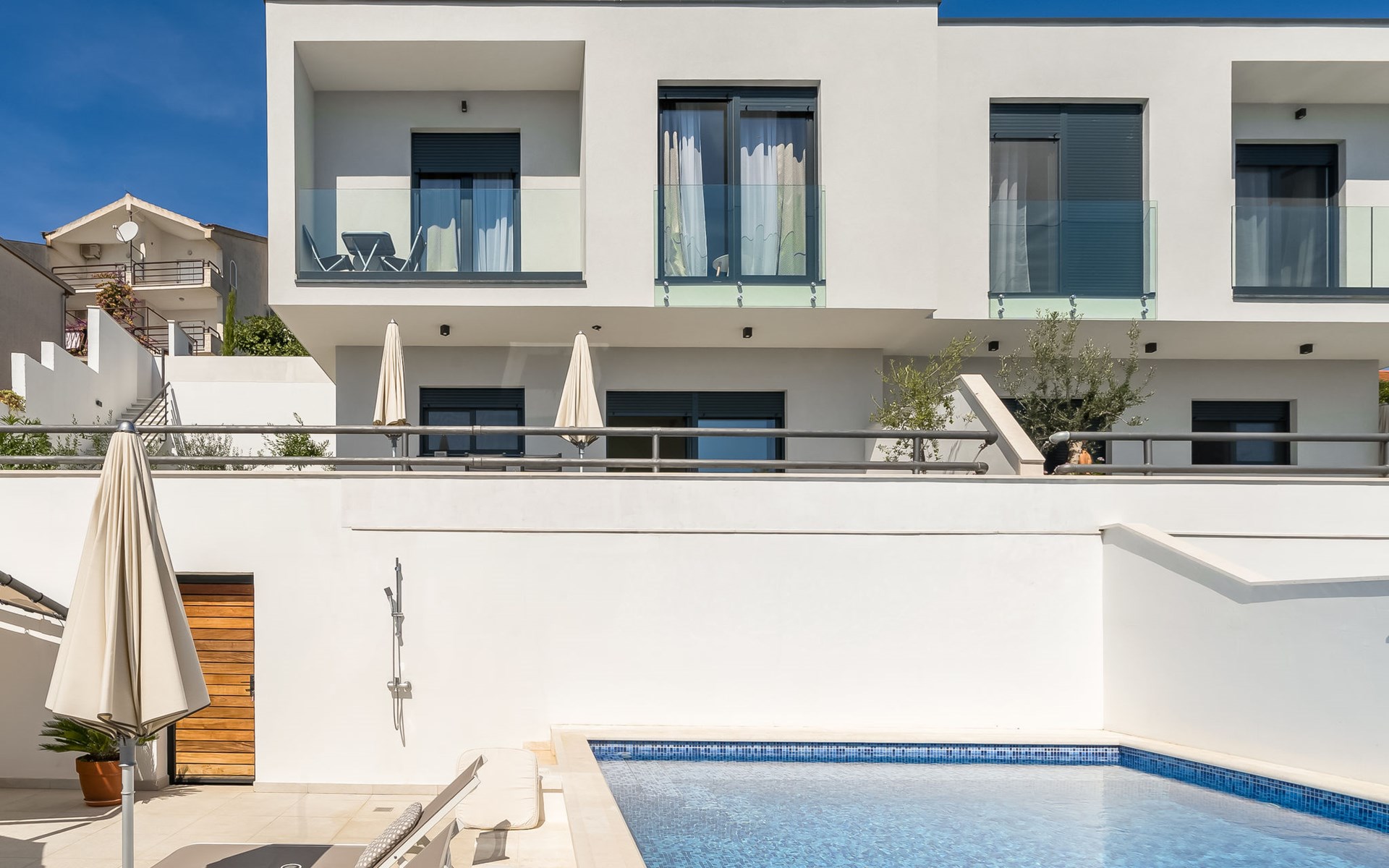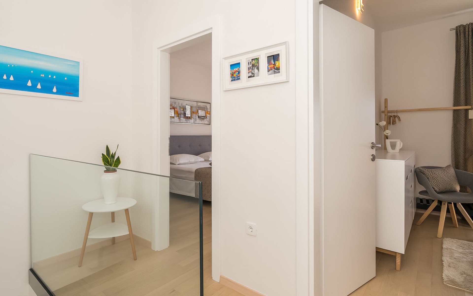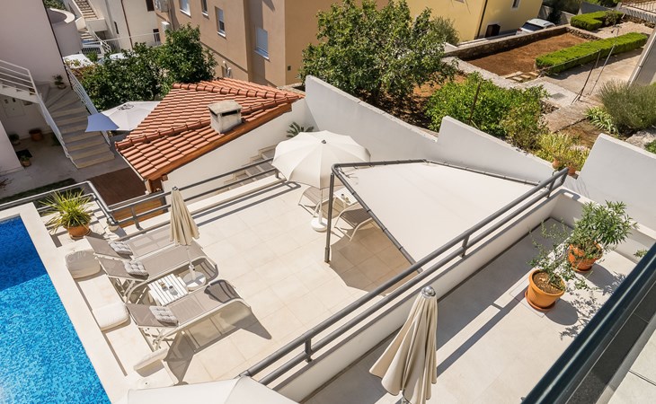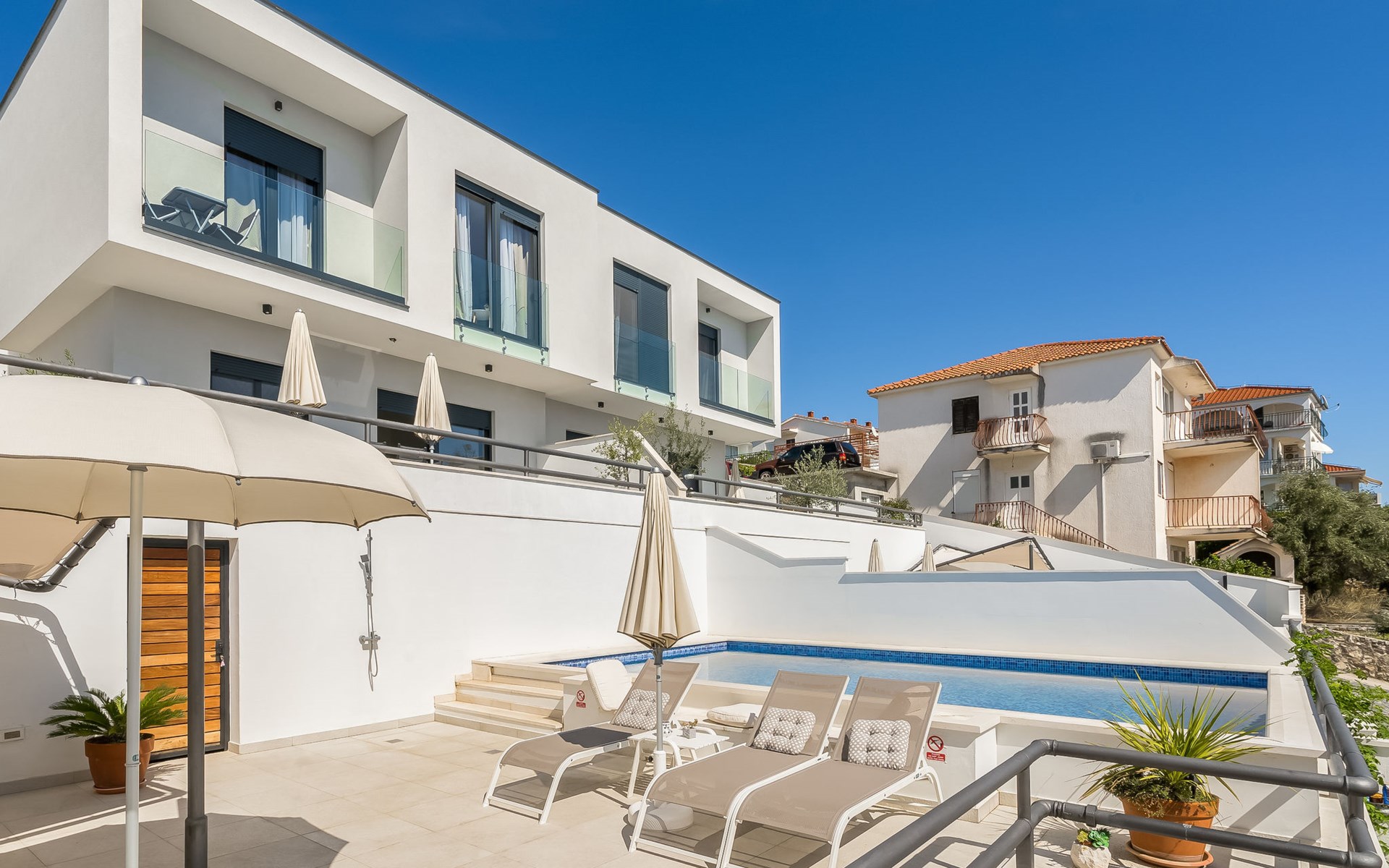 Okrug Gornji (Čiovo) 6 km from Trogir: Open staircase. Semi-detached house "Villa Meri 2", 2 storeys, built in 2019. 1.5 km from the centre of Okrug Gornji, in a quiet, sunny, elevated position, 60 m from the sea, 60 m from the beach. For shared use: swimming pool angular (7 x 4 m, 30 m2, depth 140 cm, seasonal availability: 01.May. - 15.Oct.) with internal staircase. Terrace (60 m2), garden furniture, barbecue. Private: outdoor shower. In the house: internet access, washing machine. Parking (for 2 cars) at the house on the premises. Shop 250 m, restaurant 200 m, bus stop 1.8 km, pebble beach 150 m, rocky beach 60 m. Please note: airfield 6 km from the property. Property ref. HR4910.304 is situated on the same property.