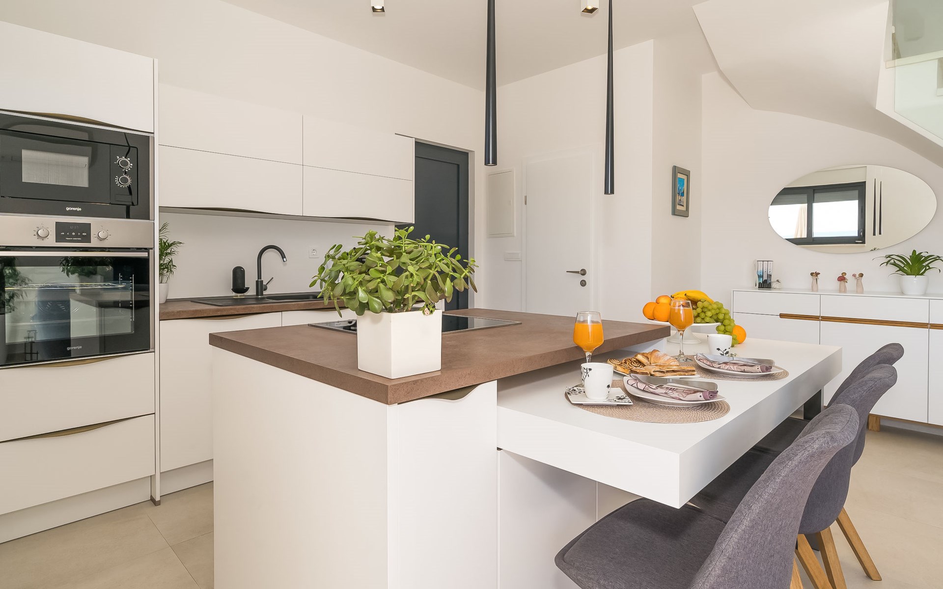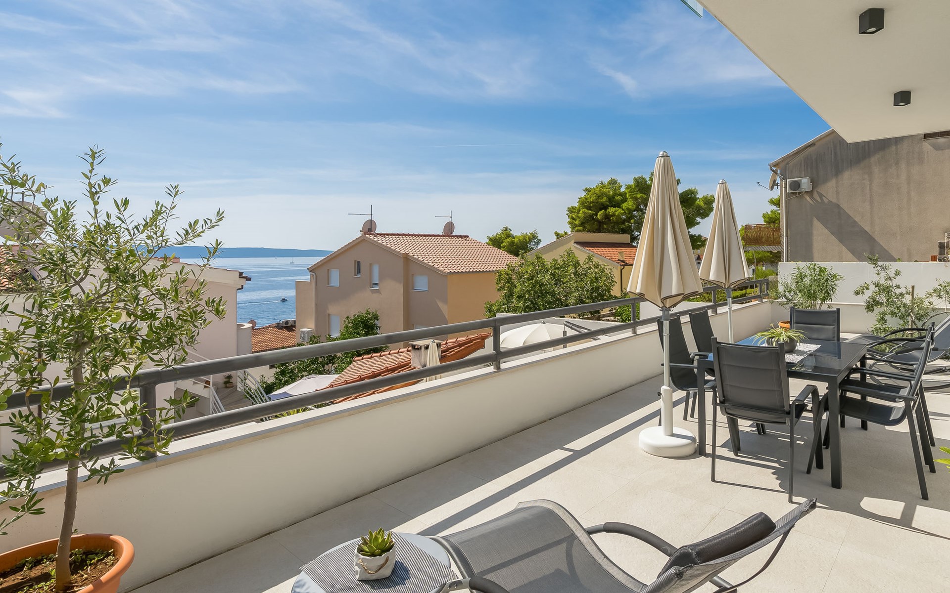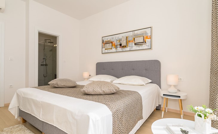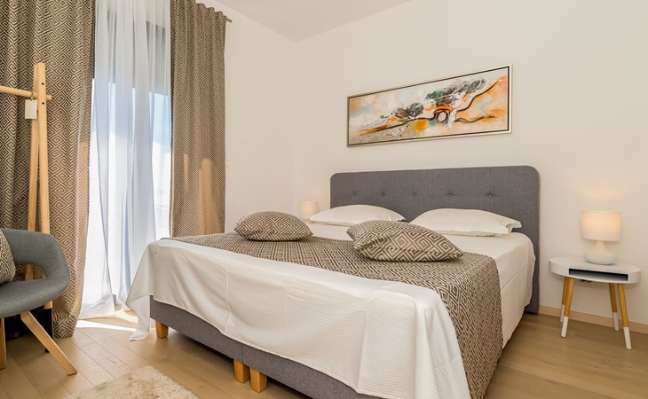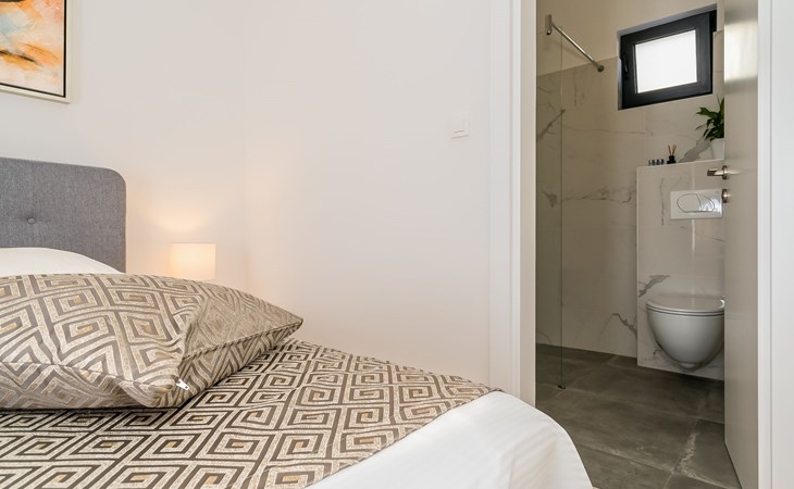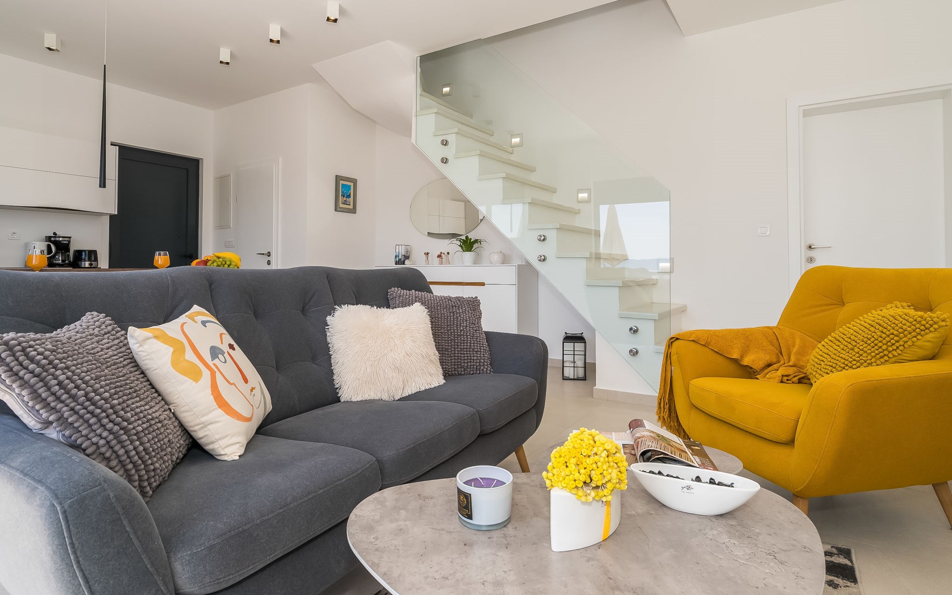 Okrug Gornji (Čiovo) 6 km from Trogir: Open staircase. Semi-detached house "Villa Meri 2", 2 storeys, built in 2019. 1.5 km from the centre of Okrug Gornji, in a quiet, sunny, elevated position, 60 m from the sea, 60 m from the beach. For shared use: swimming pool angular (7 x 4 m, 30 m2, depth 140 cm, seasonal availability: 01.May. - 15.Oct.) with internal staircase. Terrace (60 m2), garden furniture, barbecue. Private: outdoor shower. In the house: internet access, washing machine. Parking (for 2 cars) at the house on the premises. Shop 250 m, restaurant 200 m, bus stop 1.8 km, pebble beach 150 m, rocky beach 60 m. Please note: airfield 6 km from the property. Property ref. HR4910.304 is situated on the same property.