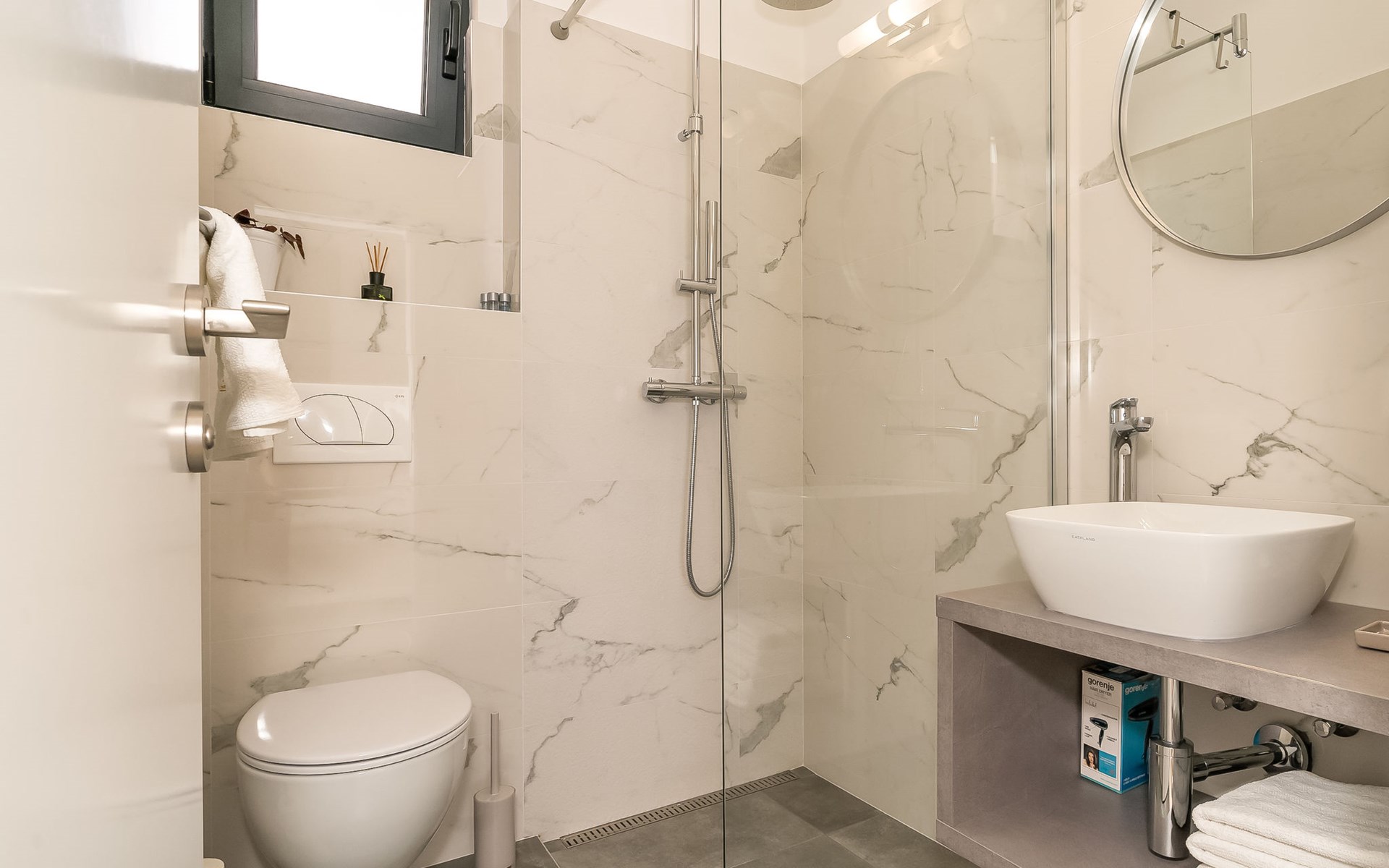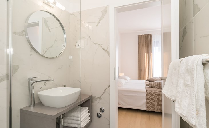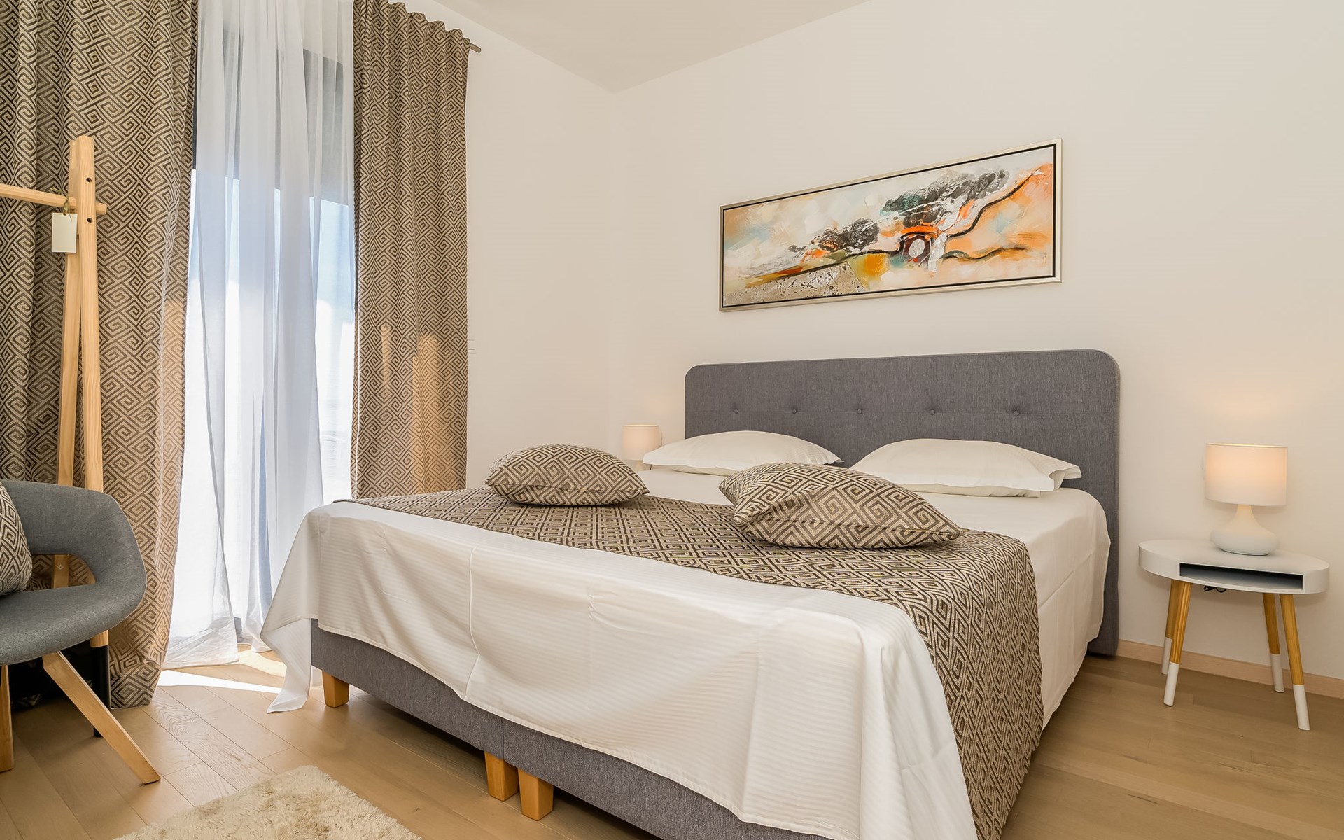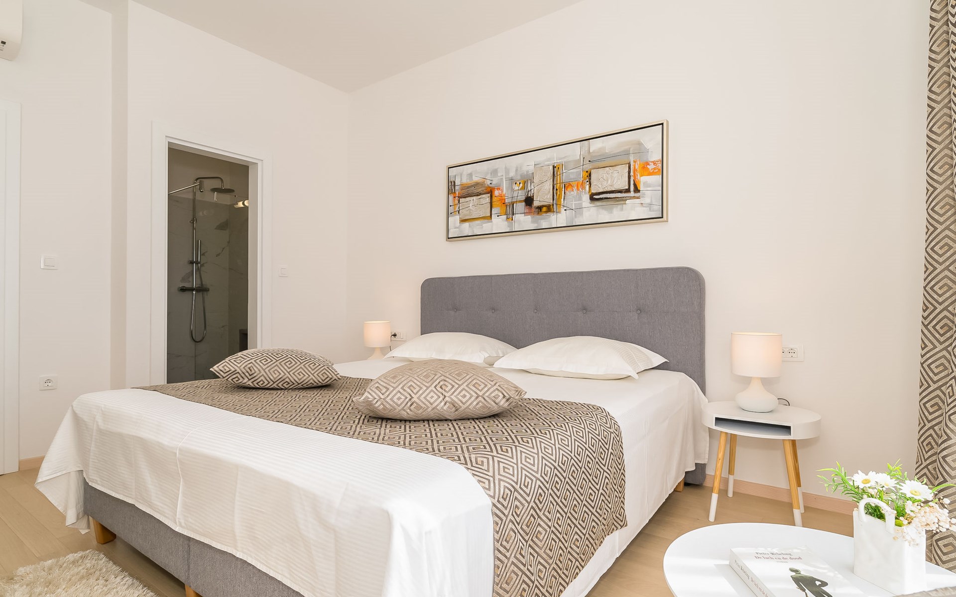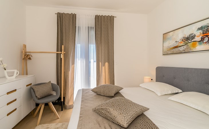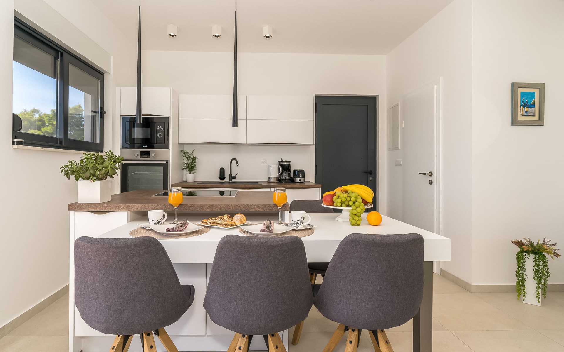 Okrug Gornji (Čiovo) 6 km from Trogir: Open staircase. Semi-detached house "Villa Meri 2", 2 storeys, built in 2019. 1.5 km from the centre of Okrug Gornji, in a quiet, sunny, elevated position, 60 m from the sea, 60 m from the beach. For shared use: swimming pool angular (7 x 4 m, 30 m2, depth 140 cm, seasonal availability: 01.May. - 15.Oct.) with internal staircase. Terrace (60 m2), garden furniture, barbecue. Private: outdoor shower. In the house: internet access, washing machine. Parking (for 2 cars) at the house on the premises. Shop 250 m, restaurant 200 m, bus stop 1.8 km, pebble beach 150 m, rocky beach 60 m. Please note: airfield 6 km from the property. Property ref. HR4910.304 is situated on the same property.