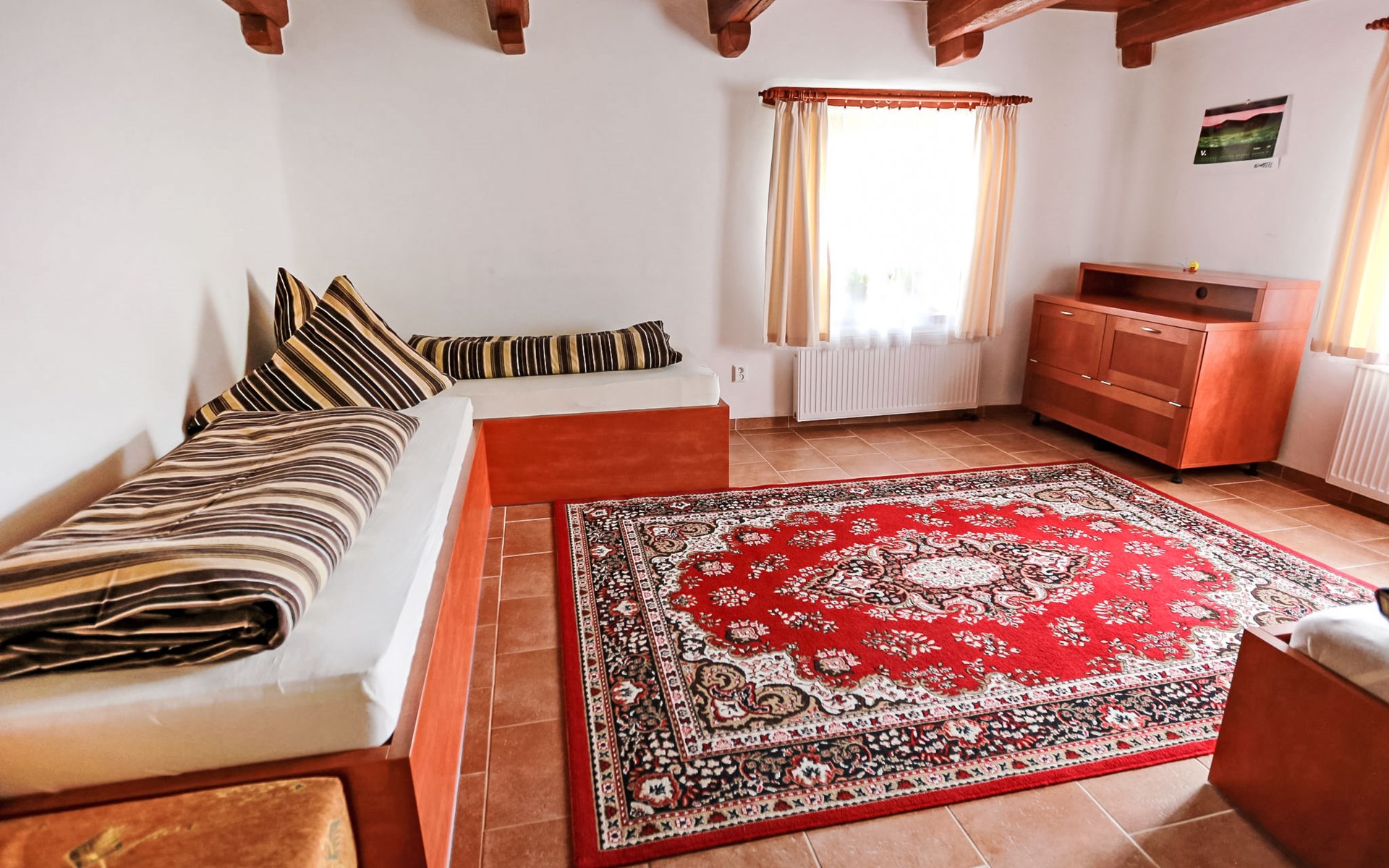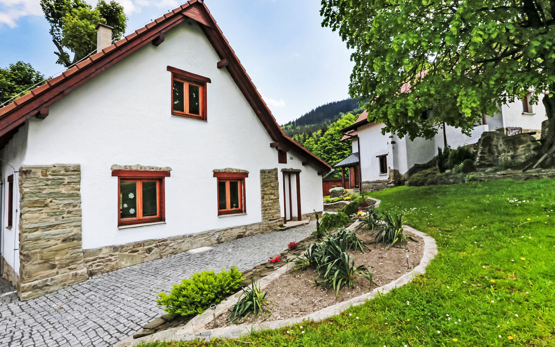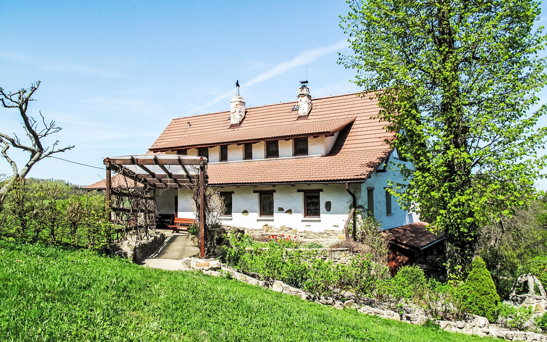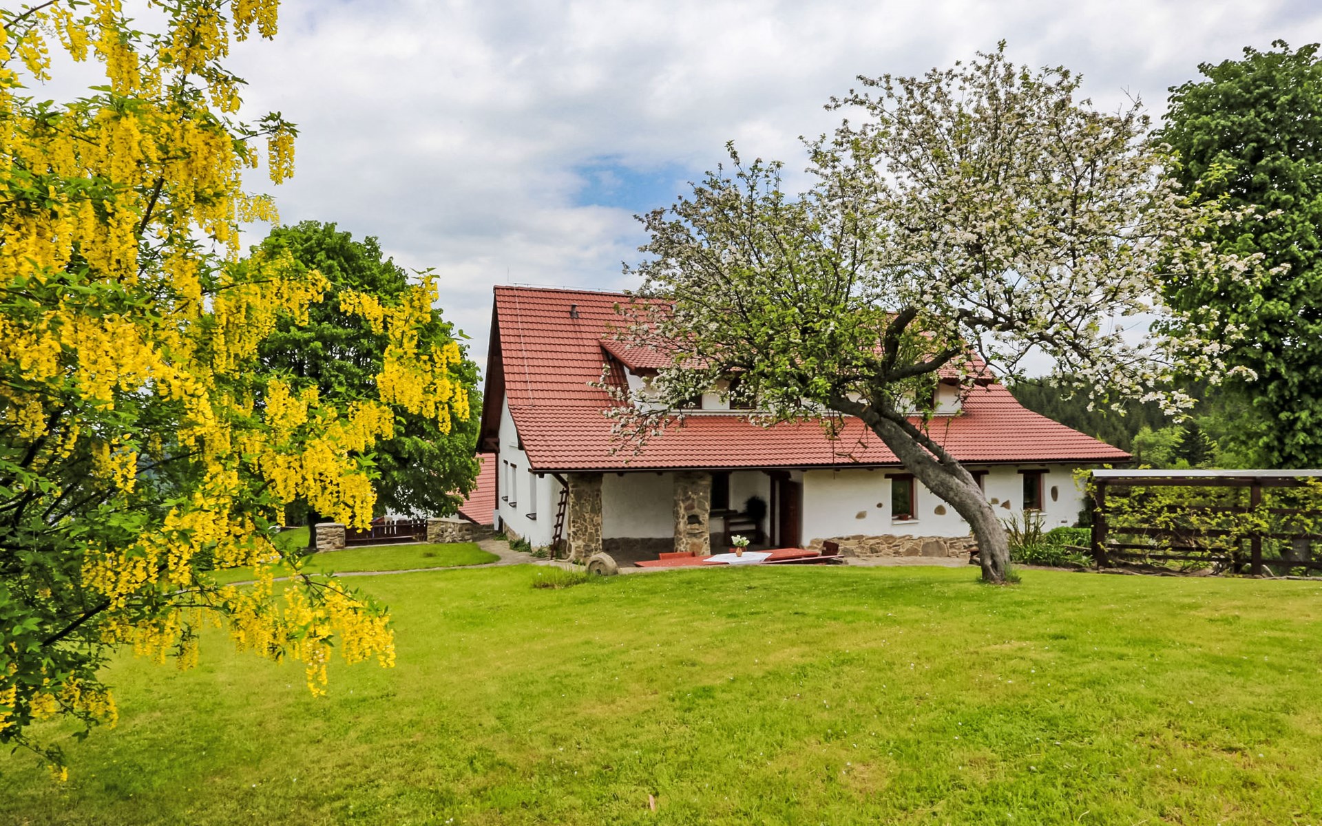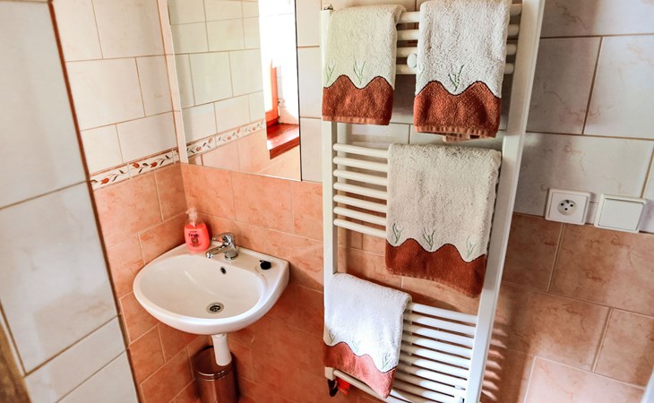 Lhotka 12 km from Ostravice: Large, child friendly, comfortable chalet "Lhotka", built in 1774, renovated in 2015, surrounded by meadows. On the outskirts, in a quiet, sunny position on a slope, 200 m from the edge of the forest. Private: natural state property 12 ha, garden 600 m2, meadow. Terrace, garden furniture, barbecue, children's playground (slide, swing, sandbox). In the house: storage room for bicycles, storage room for skis, central heating system. Steep motor access (via unmade road). In Winter: please take snow chains. Parking (for 4 cars) at the house. Grocery 1.5 km, supermarket 6 km, restaurant 1.6 km, bus stop 1 km, railway station 6 km, outdoor swimming pool 6 km, indoor swimming pool 1.6 km. Golf course (18 hole) 12 km, tennis 6 km, riding stable 4 km, ski lift 5 km, ski school 9 km, cross country ski track 3 km. Nearby attractions: Tatra Kopřivnice Museum 16 km, Skanzen Rožnov pod Radhoštěm 24 km. Please note: car recommended. Suitable for families.