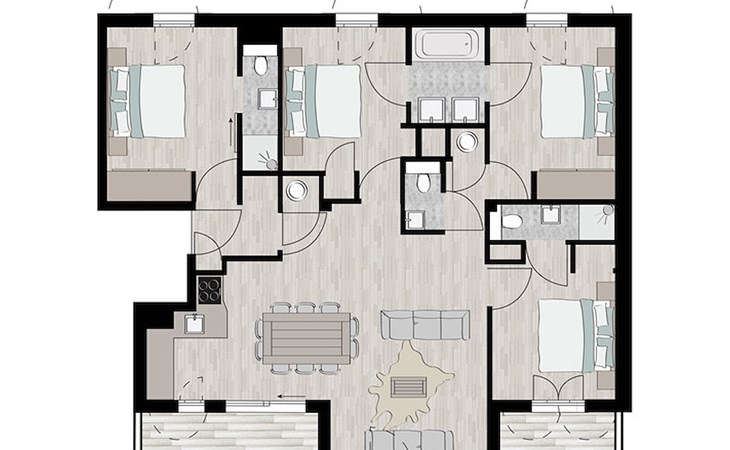 The apartment has 4 bedrooms: 2 bedrooms are singles and 2 bedrooms are twins. Additionally, there is a sofa bed for 2 people in the lounge. The accommodation also has 3 bathrooms, 1 with a bath, washbasin and toilet and 2 with a shower, washbasin and toilet. A separate toilet is available in the apartment too.