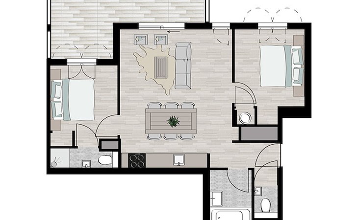There are 2 bedrooms; 1 of the bedrooms is a double and 1 of the bedrooms is a twin. Both bedrooms have a television. The apartment also has 2 bathrooms, 1 with shower, washbasin and toilet and 1 with a bath and/or shower and washbasin.