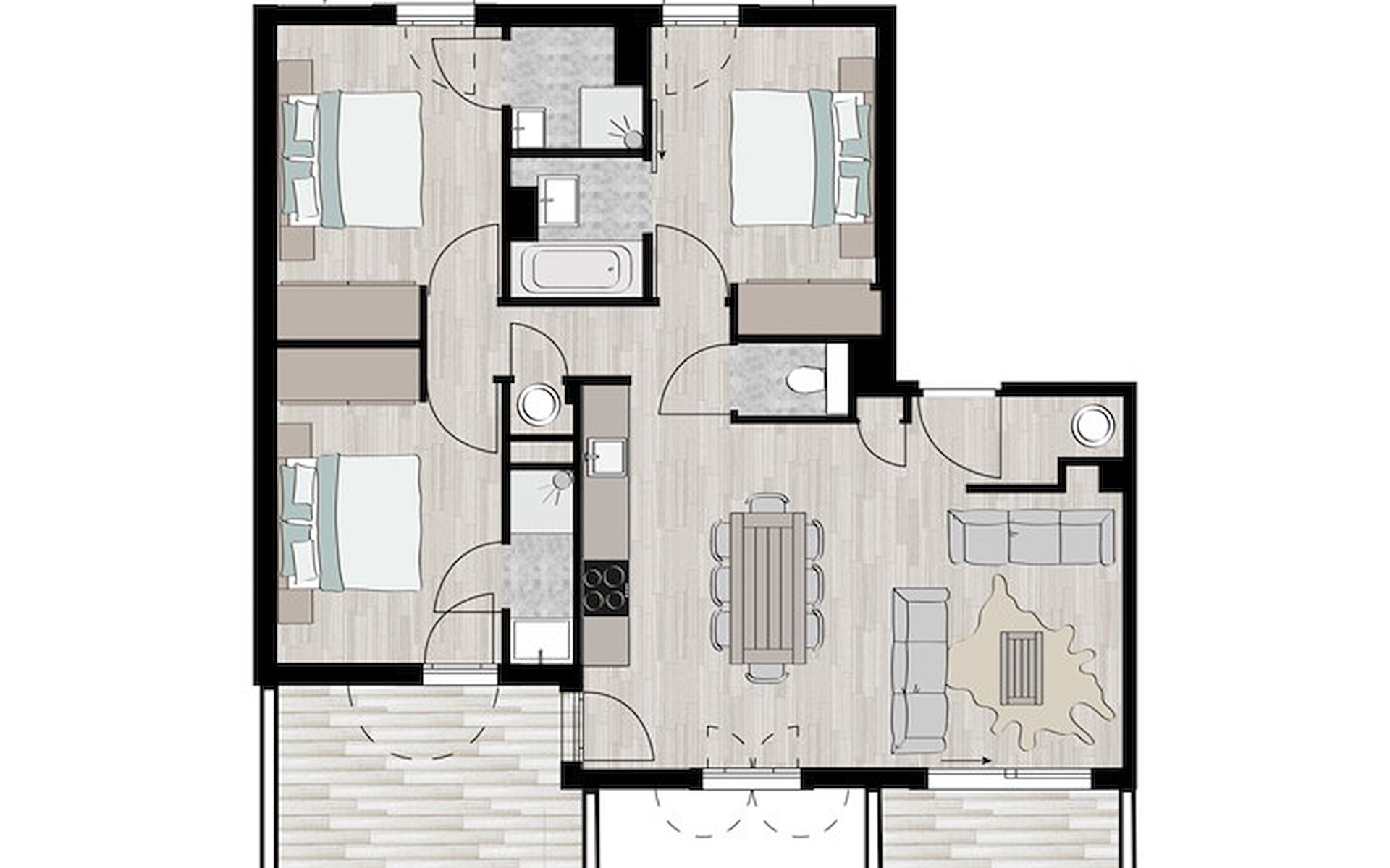 There are 3 separate bedrooms with television; 1 of the bedrooms is a twin, and 2 of the bedrooms are doubles. The apartment also has 2 bathrooms with a bath and/or shower, washbasin and toilet. There is also a separate toilet.