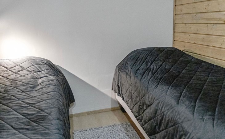 Sleeping arrangements on the ground floor: In the windowless bedroom, there are two beds combined (80x200 cm), and adjacent to the bedroom, there is a sliding-door alcove with two separate beds (80x200 cm).
