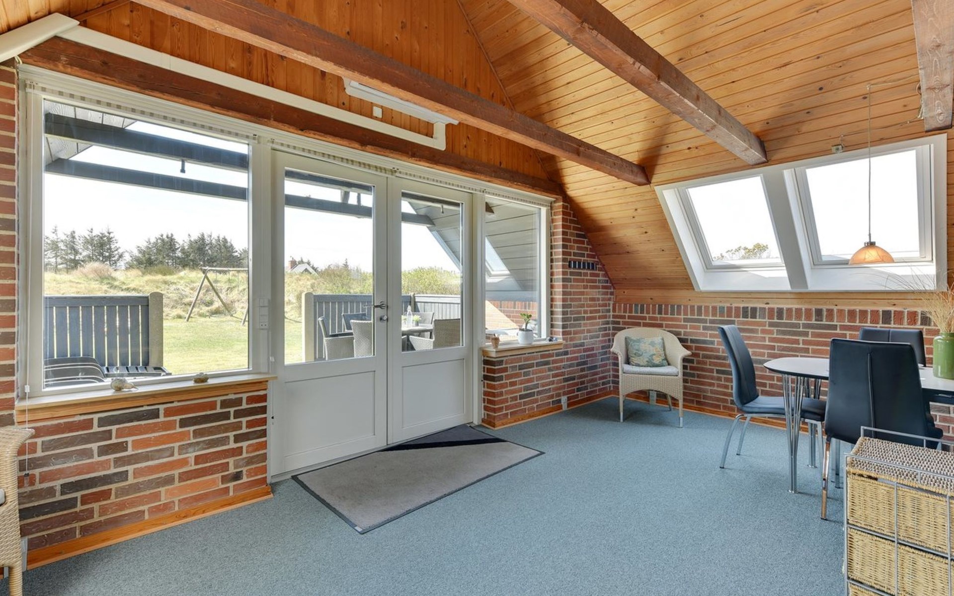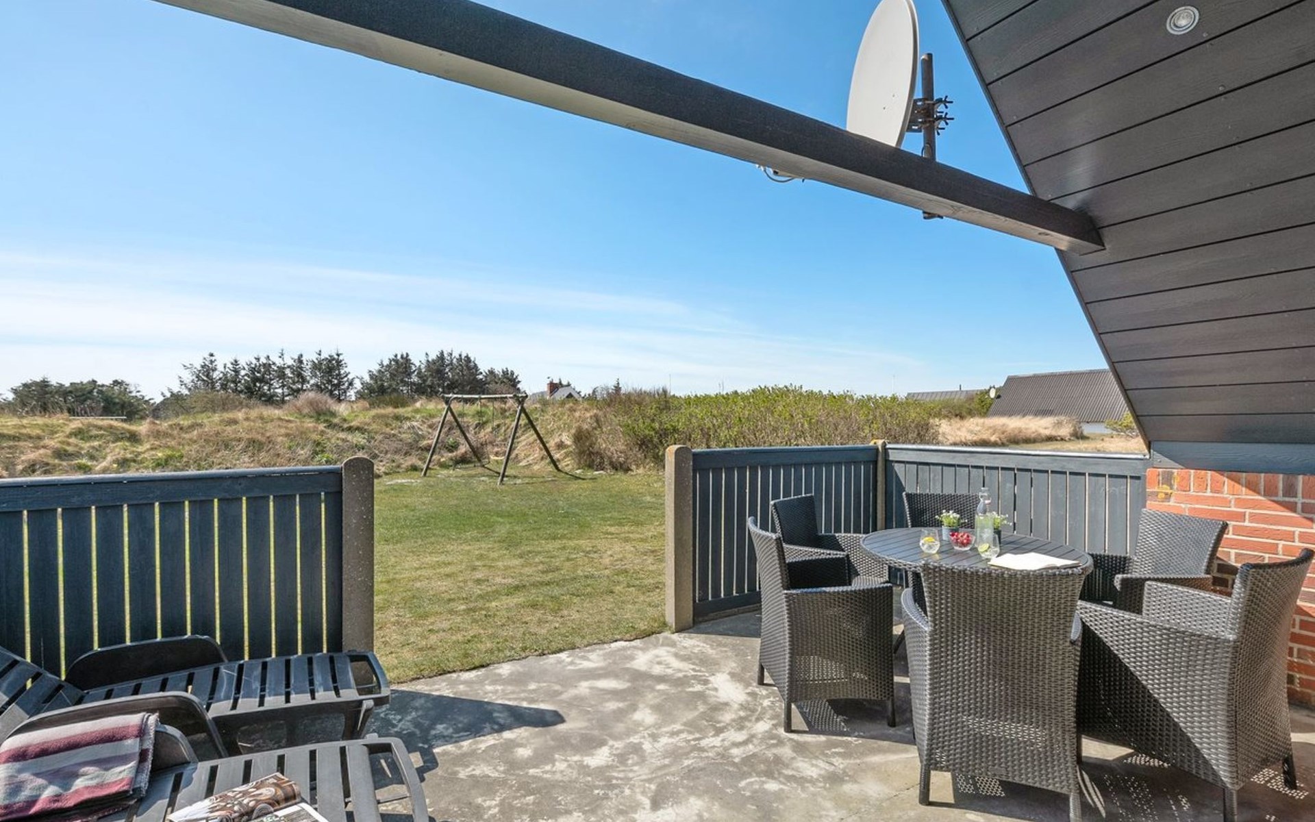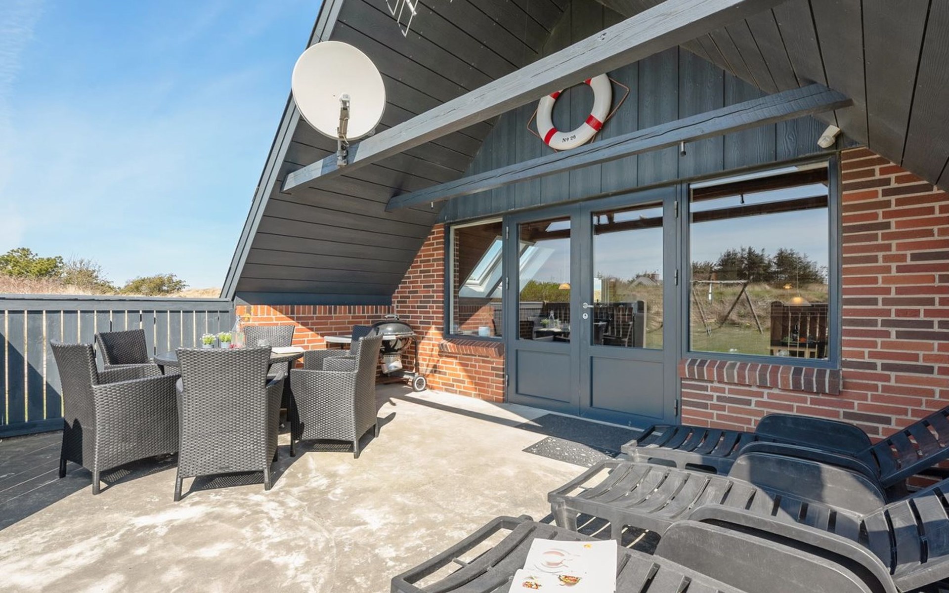Single-family house, built in 1981. 800 m from the sea. Private: natural state property 2'000 m2. Terrace (15 m2), children's playground (swing). In the house: sauna, washing machine. Parking at the house. E-charging station. Grocery 5.5 km. Golf course 6 km. The owner does not accept any youth groups.
