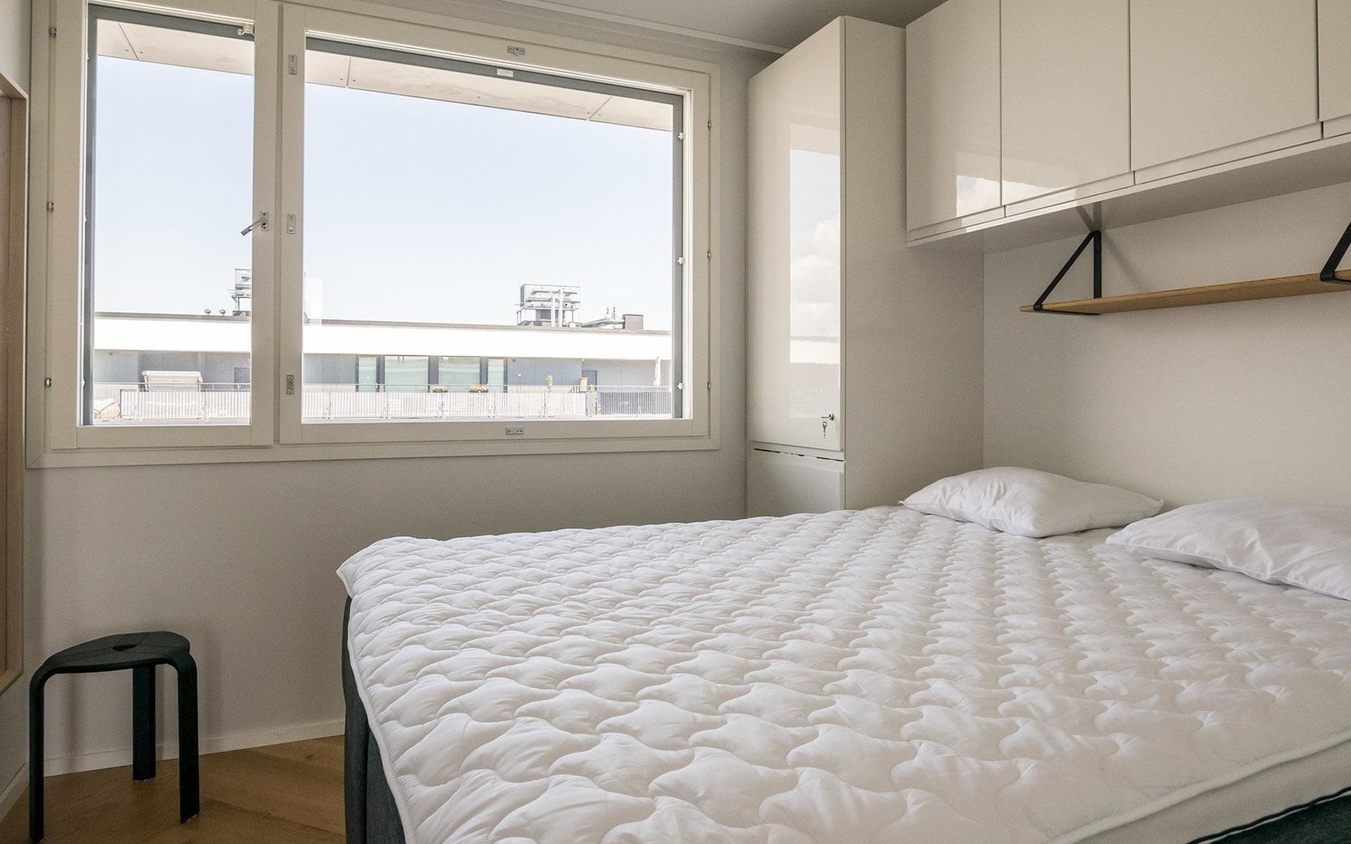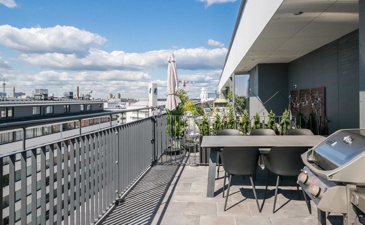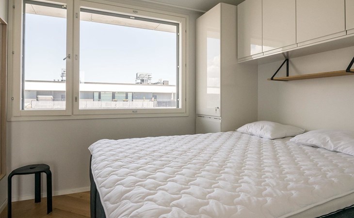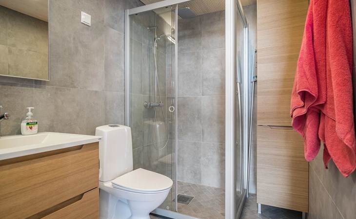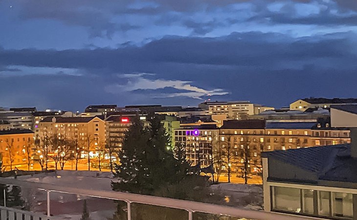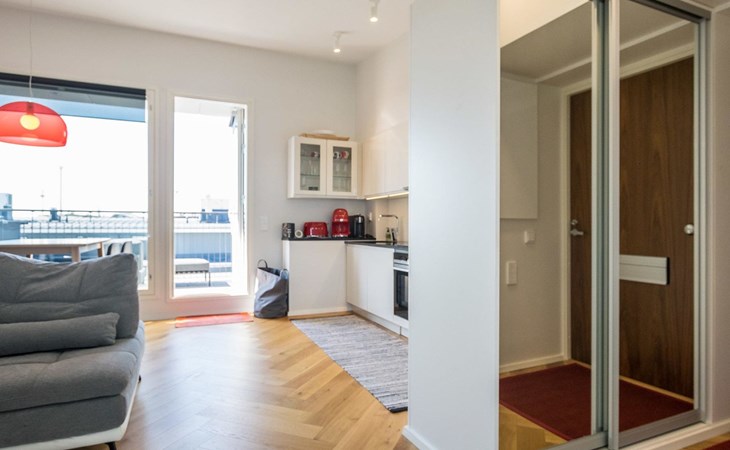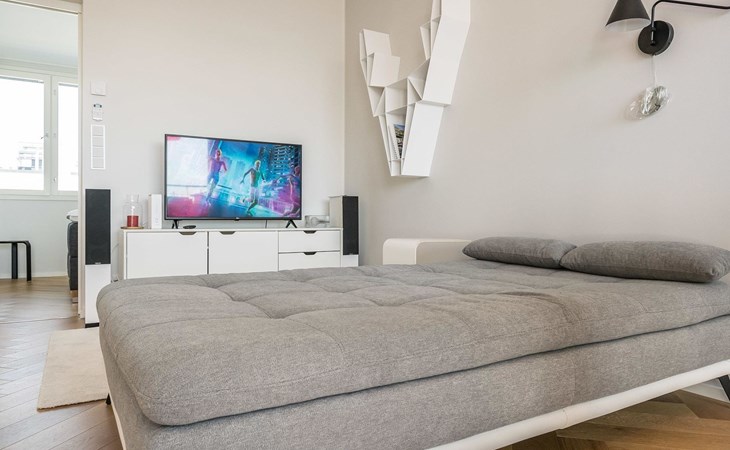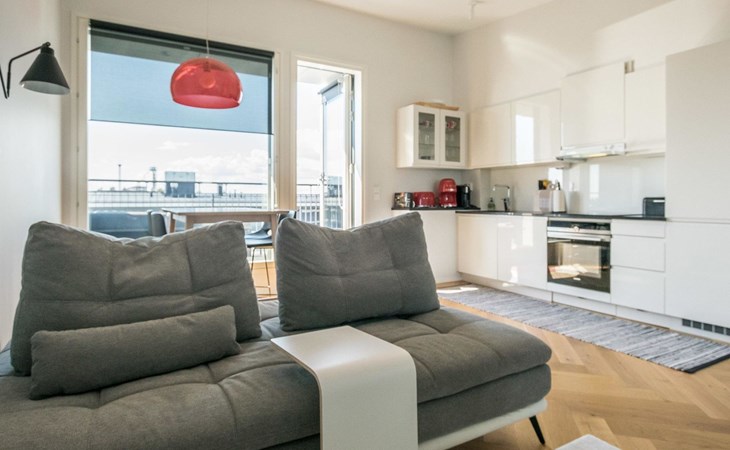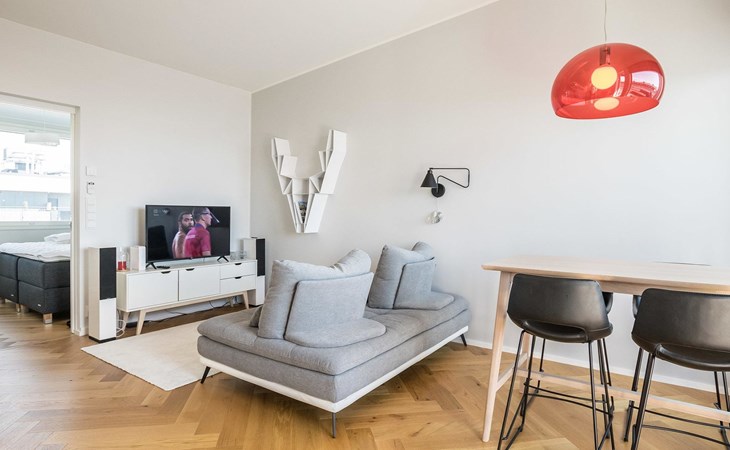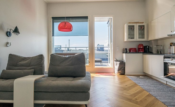 Living room, living room / kitchen, bedroom with double bed, sofa bed for one (120x180 cm) in the living room, washroom/WC, air source heat pump for cooling, full apartment wide terrace with a view over the city, spacious outdoor sofa, dining group and gas grill. . The elevator takes you to the second top floor, from where stairs to the tenth (the uppermost) floor.