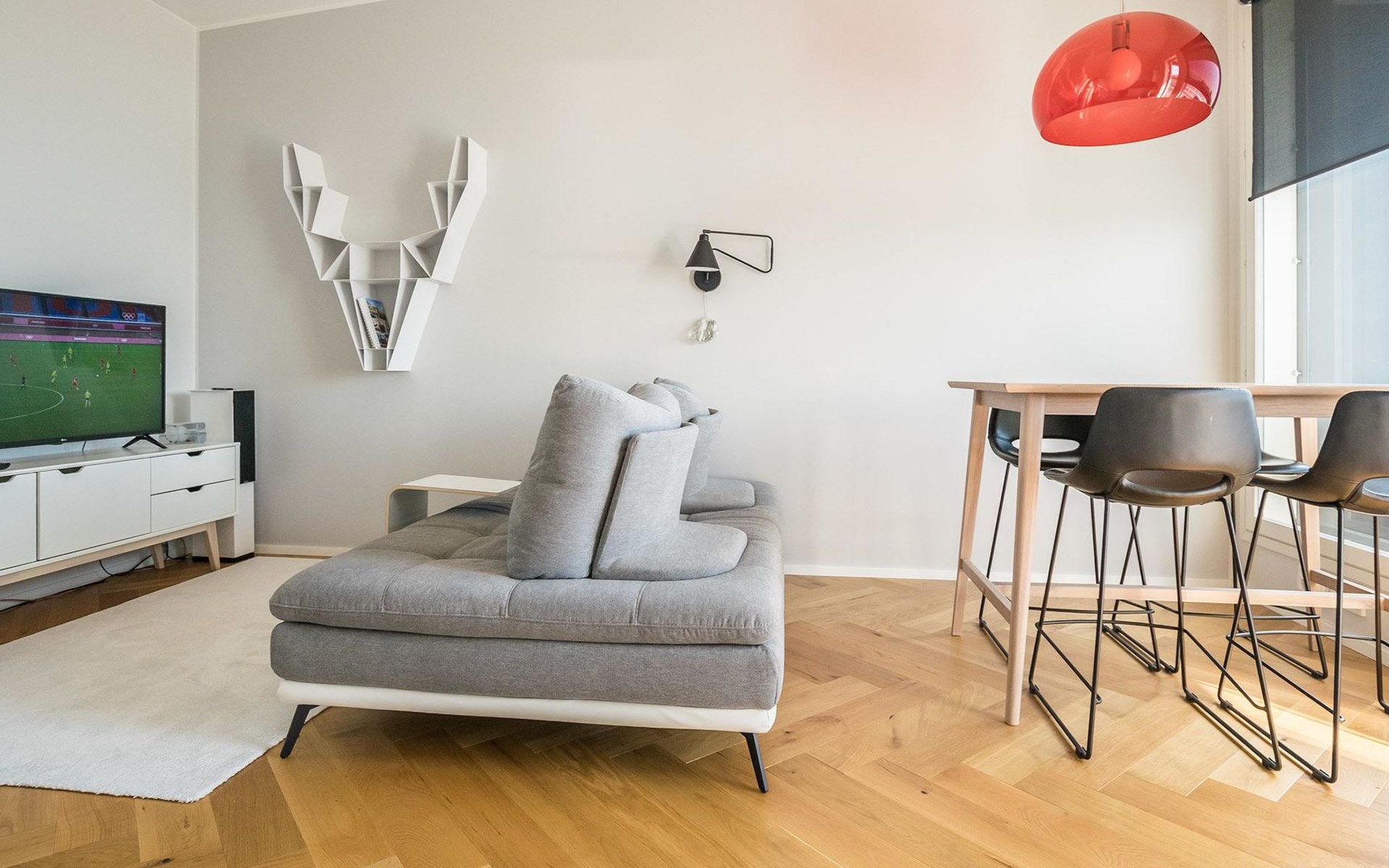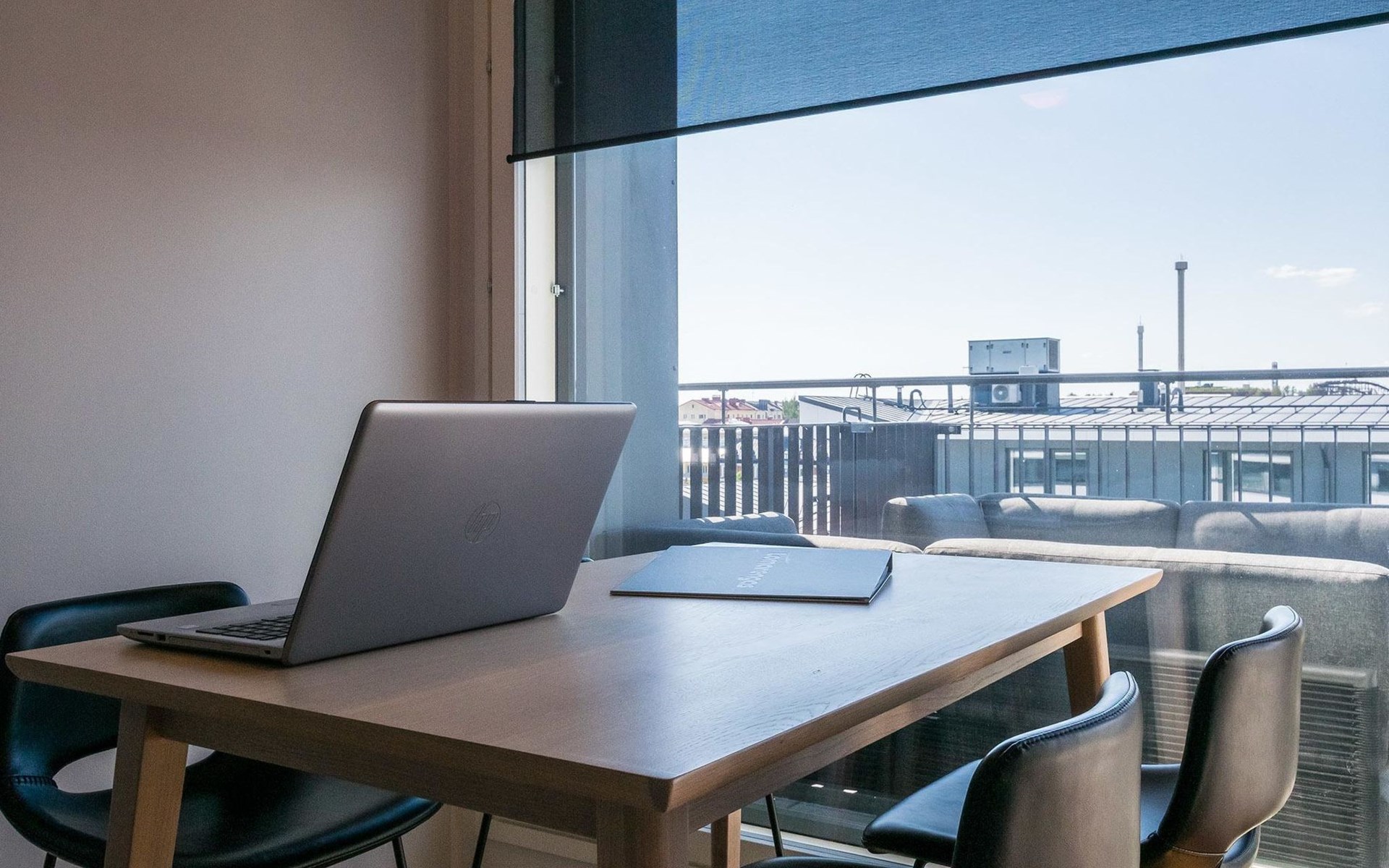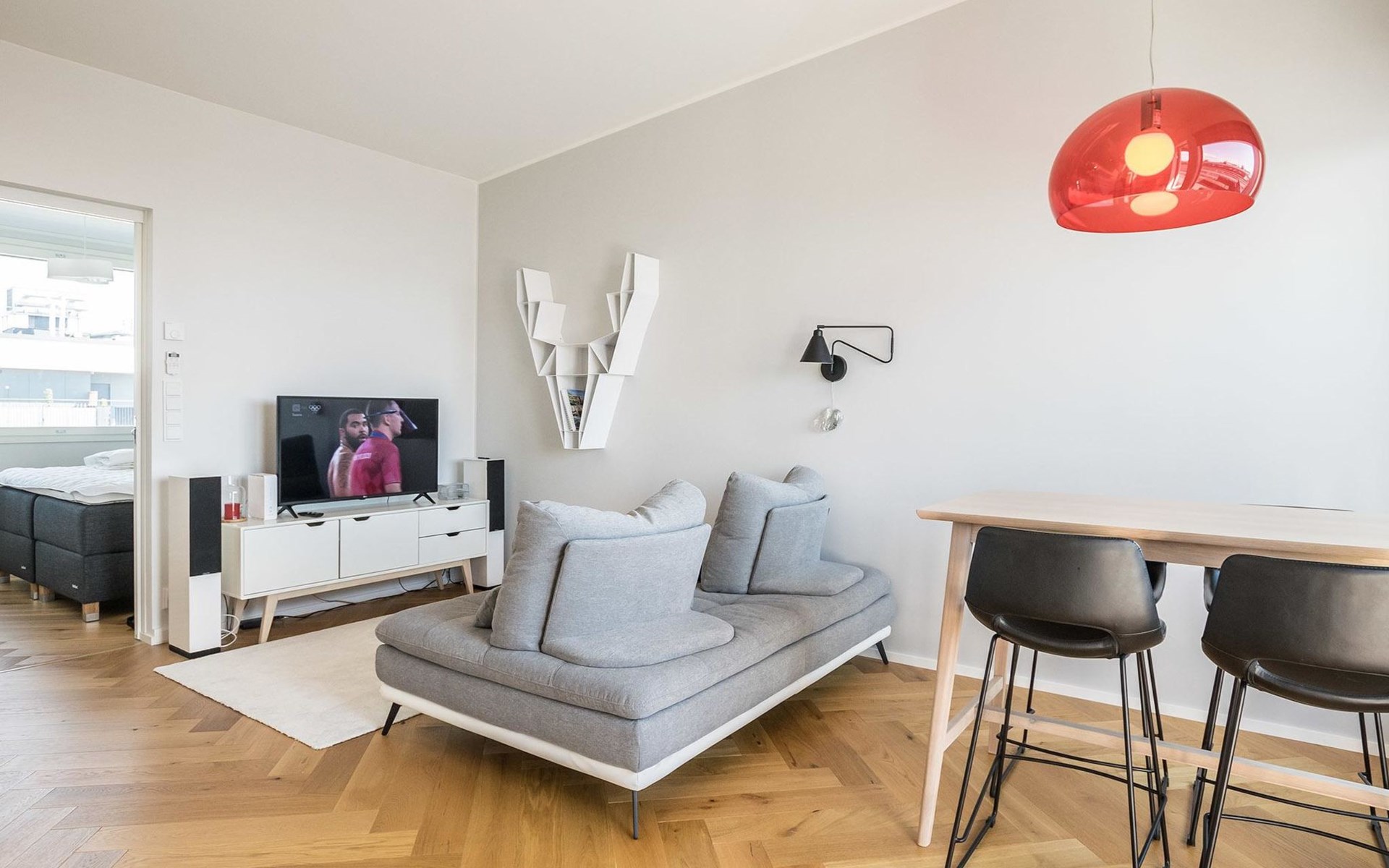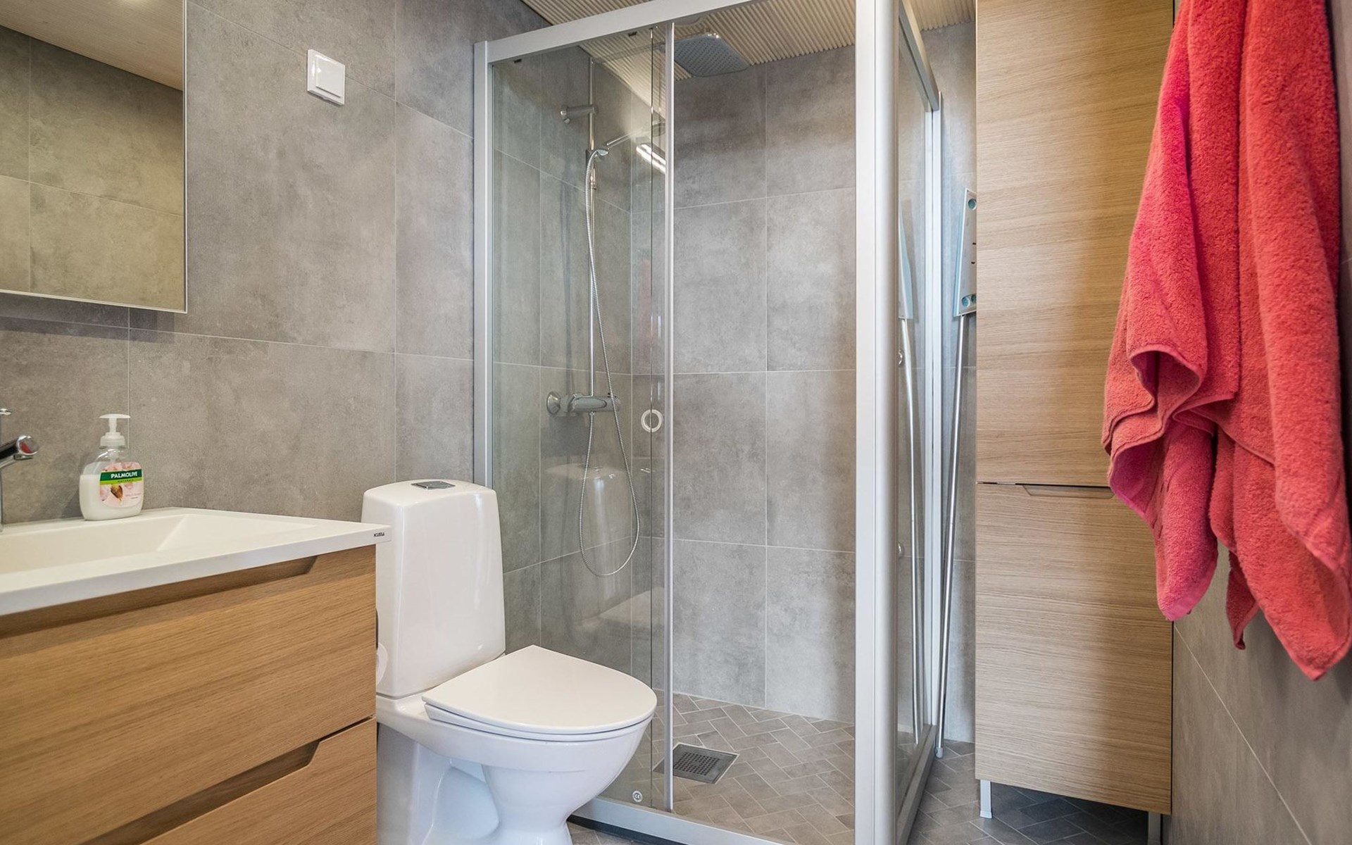 Living room, living room / kitchen, bedroom with double bed, sofa bed for one (120x180 cm) in the living room, washroom/WC, air source heat pump for cooling, full apartment wide terrace with a view over the city, spacious outdoor sofa, dining group and gas grill. . The elevator takes you to the second top floor, from where stairs to the tenth (the uppermost) floor.