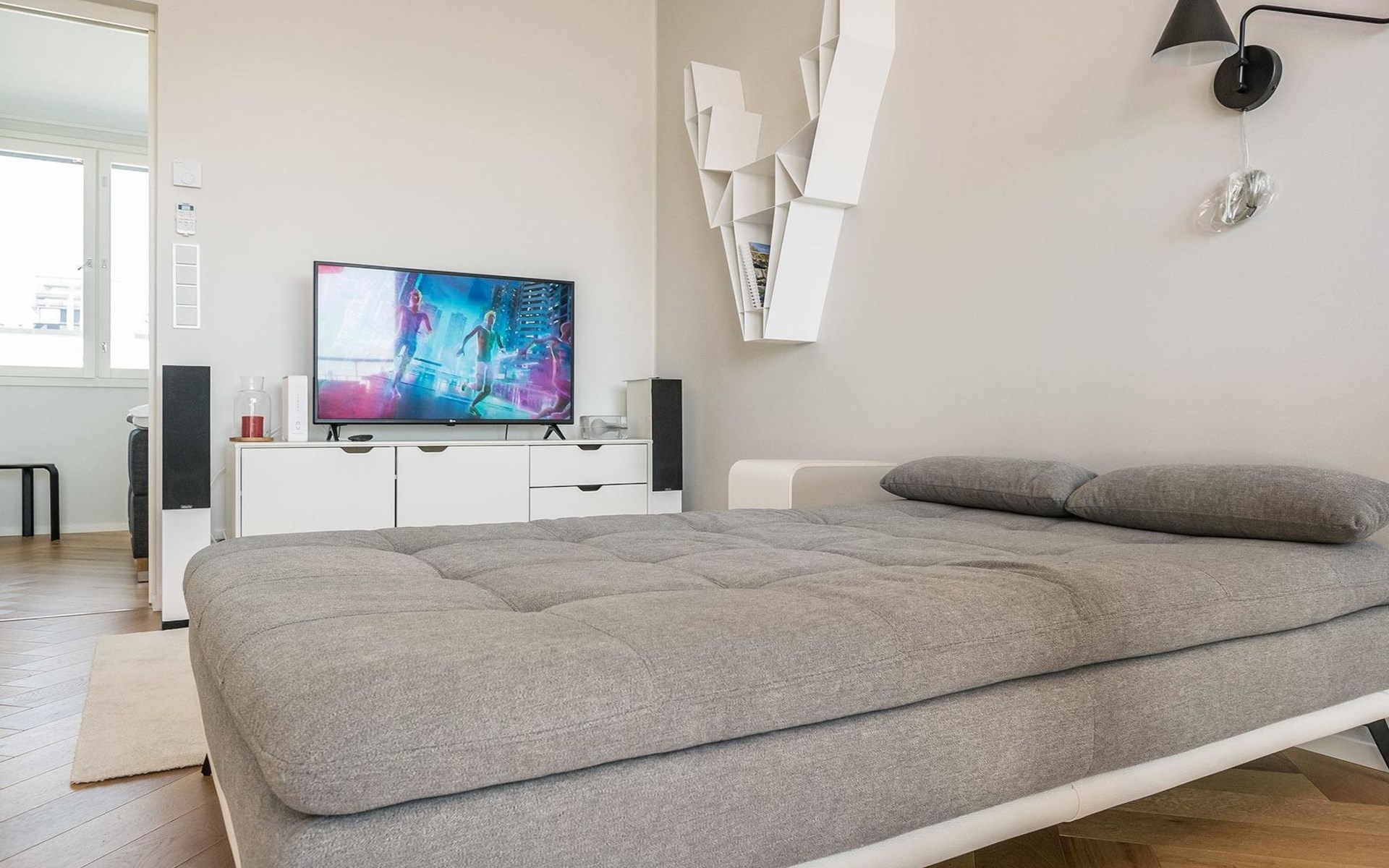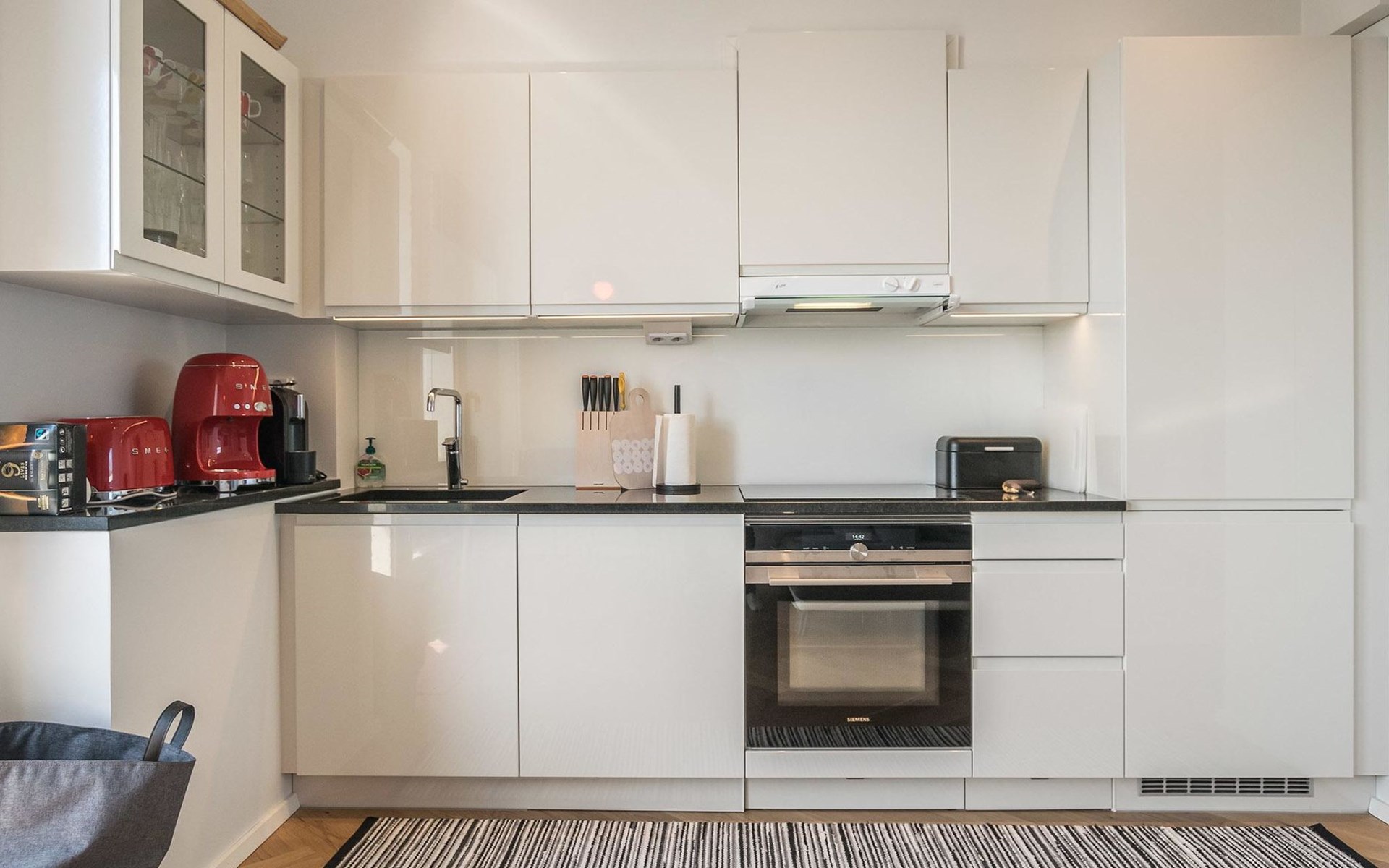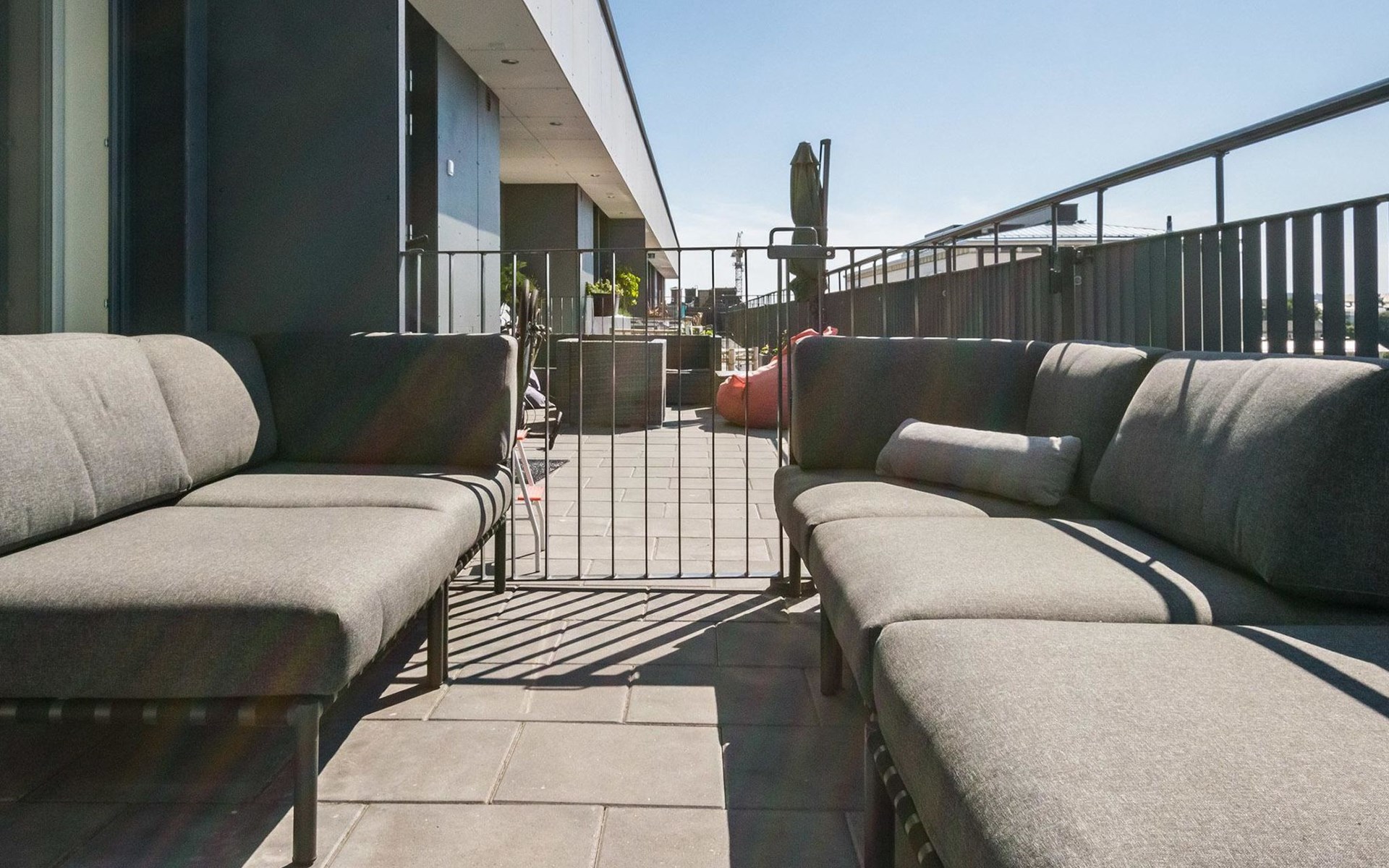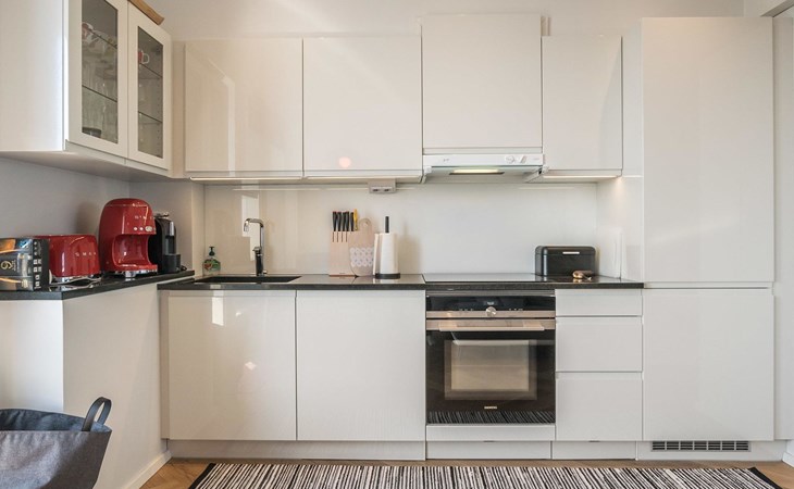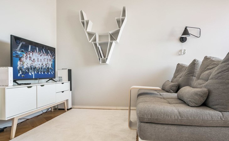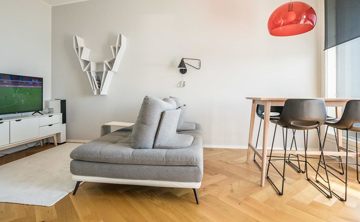 Living room, living room / kitchen, bedroom with double bed, sofa bed for one (120x180 cm) in the living room, washroom/WC, air source heat pump for cooling, full apartment wide terrace with a view over the city, spacious outdoor sofa, dining group and gas grill. . The elevator takes you to the second top floor, from where stairs to the tenth (the uppermost) floor.
