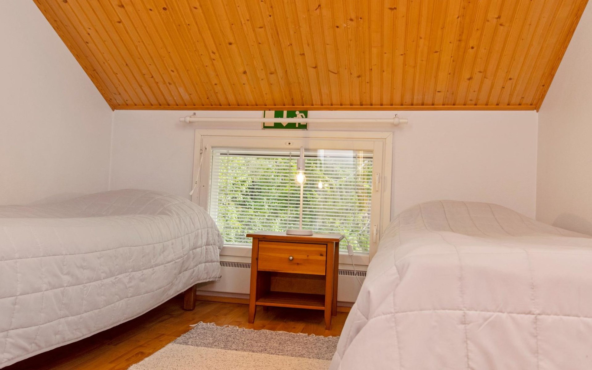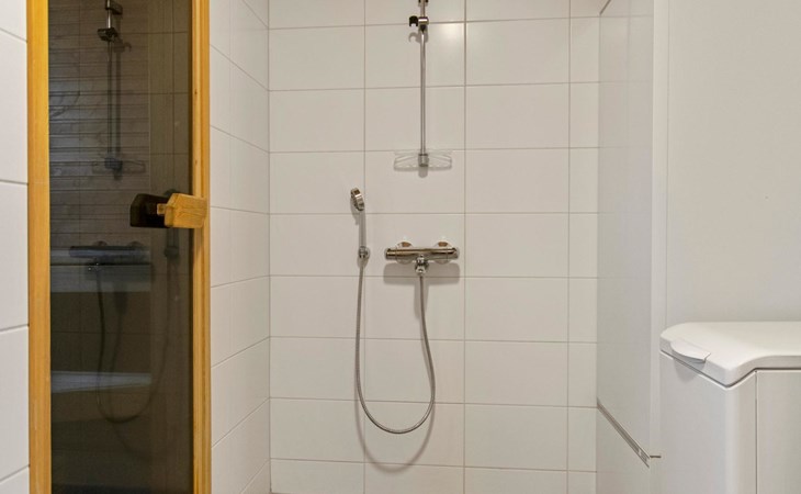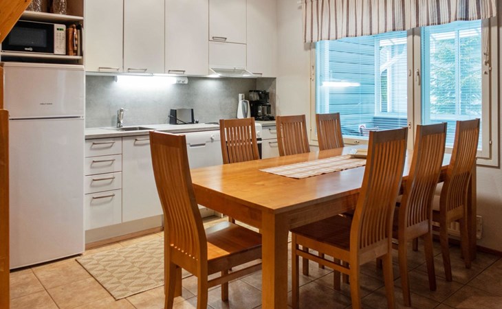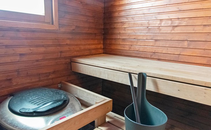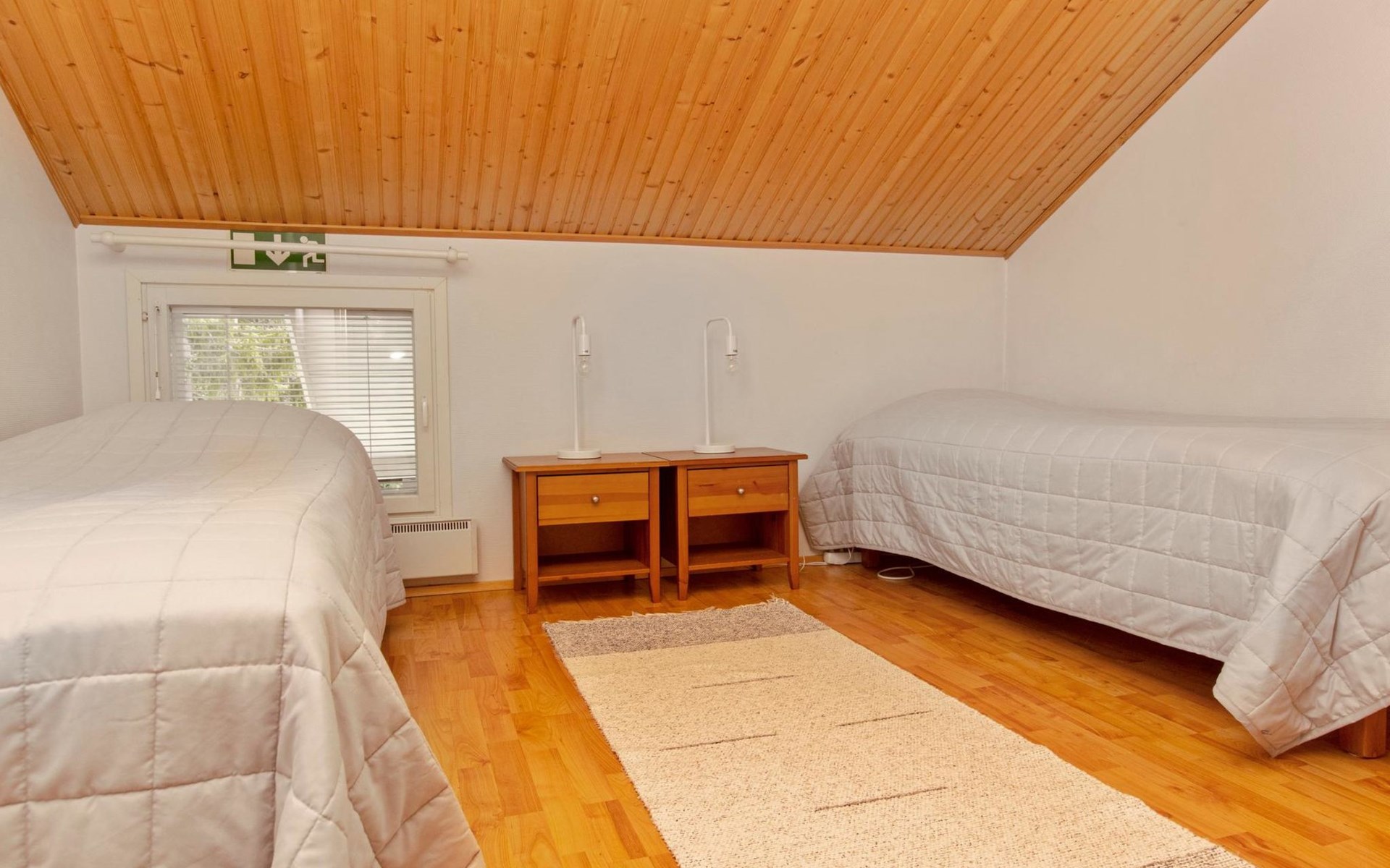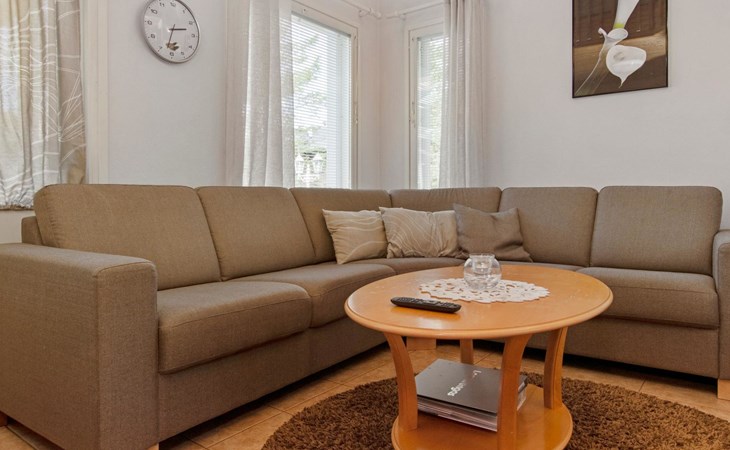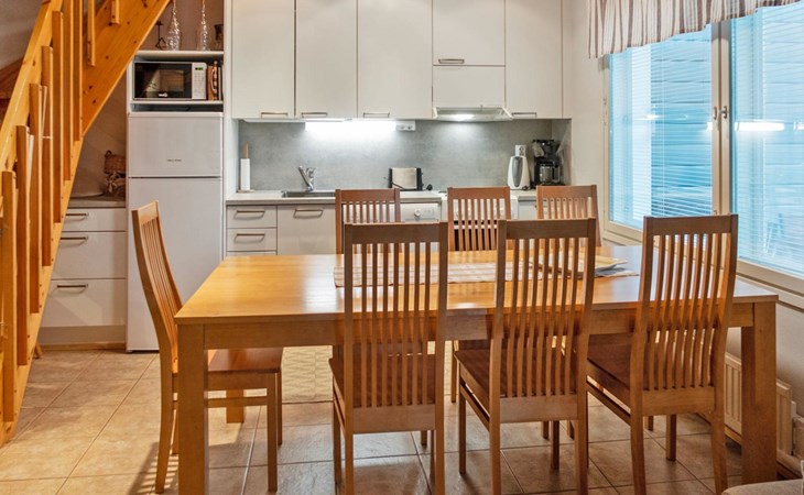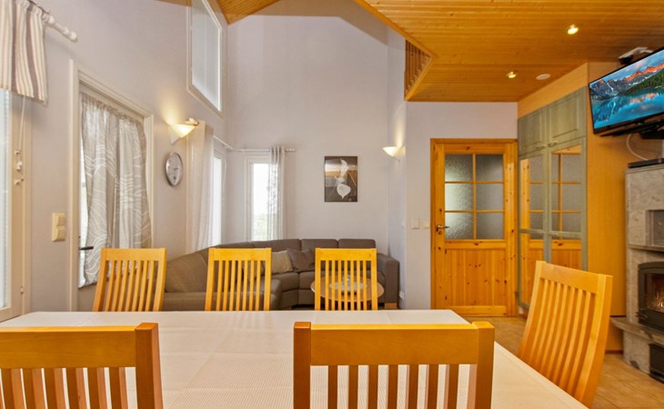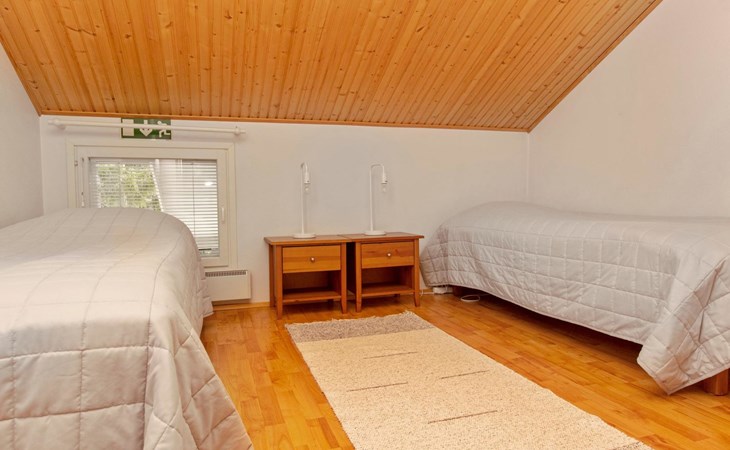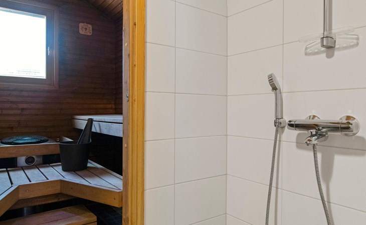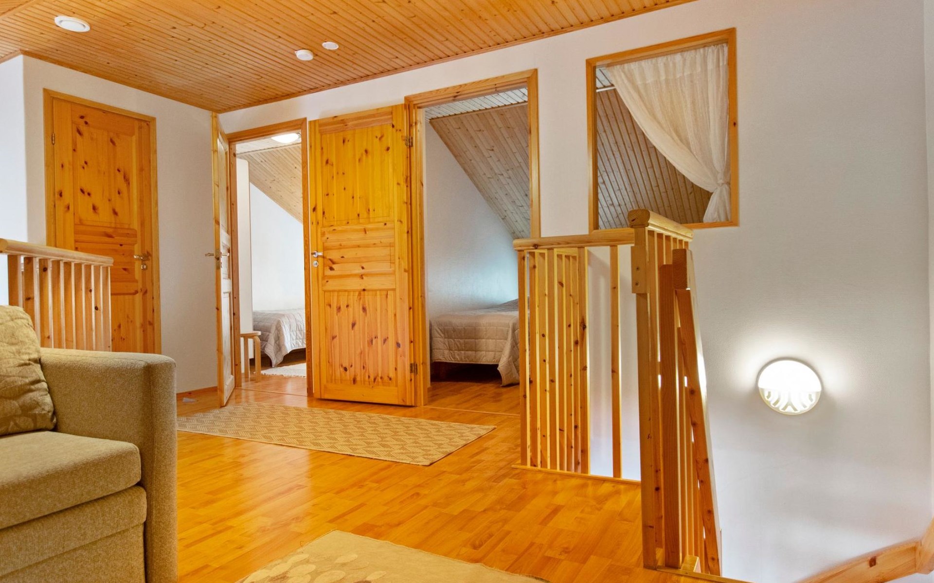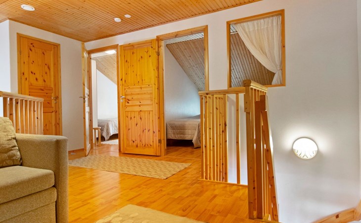 Living area is 72,5 m². On the ground floor there is combined living room & kitchen and one bedroom with twin bed. Upstairs there are two bedrooms, both with separate beds for two. Open loft with sofabed for 1-2 persons, toilet. Sauna (electric heating), washroom, shower and separate toilet.