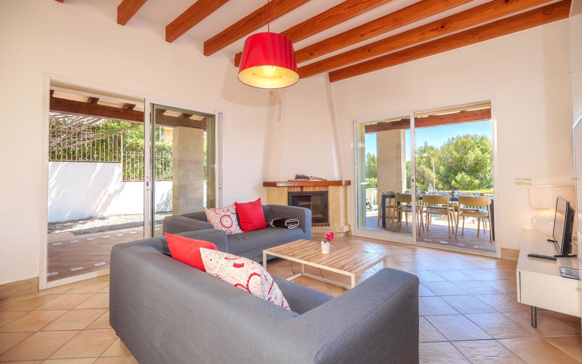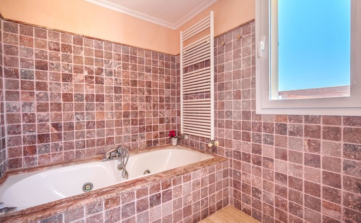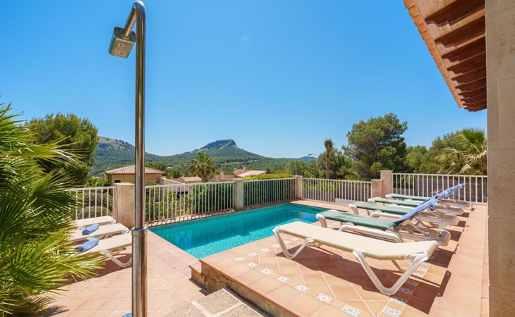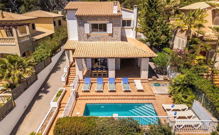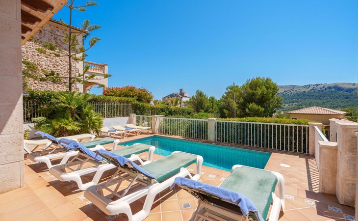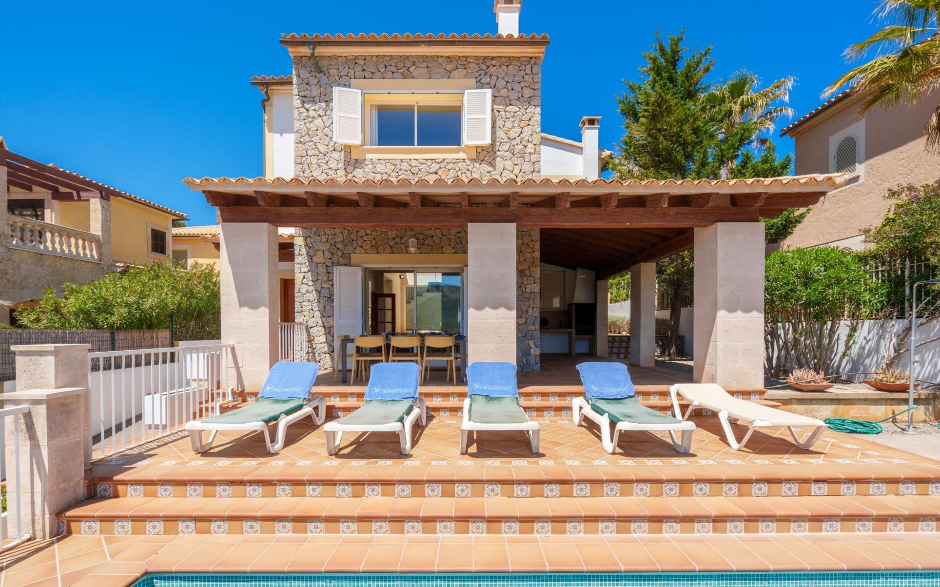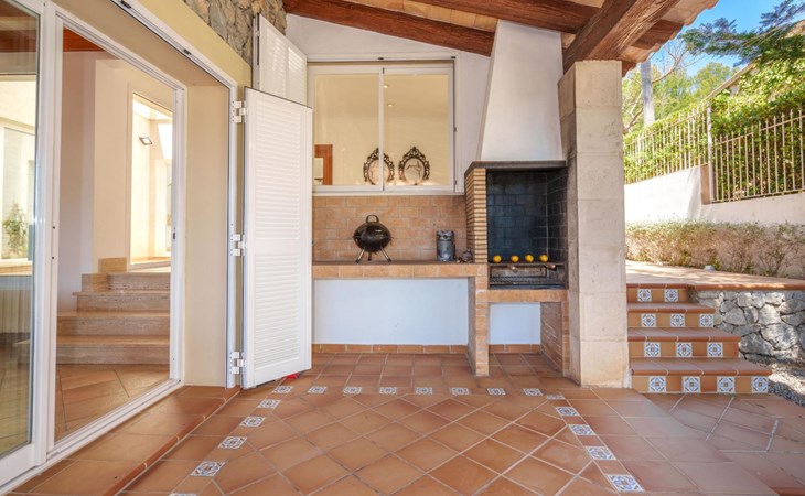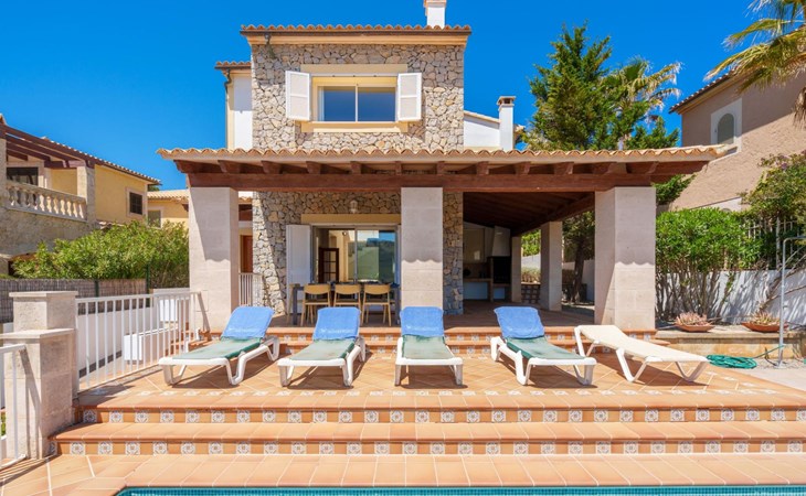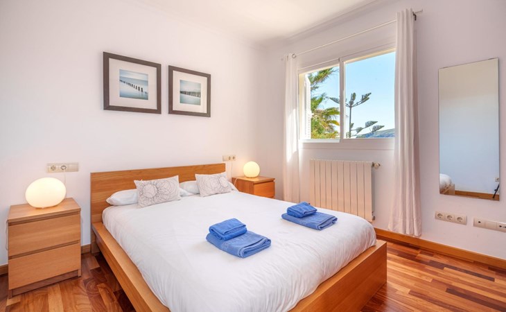 Cala Mesquida 7 km from Capdepera: Modern, comfortable house "Cala Mesquida", 2 storeys, detached. 6 km from the centre of Capdepera, 8 km from the centre of Cala Ratjada, 32 km from the centre of Manacor, on a slope, in the residential district, 100 m from the edge of the forest, 500 m from the sea, 600 m from the beach. Private: natural state property 600 m2 (fenced), terraced garden, swimming pool (6 x 3 m, seasonal availability: 01.Jan. - 31.Dec.). Outdoor shower, pool maintenance by the owner/gardener. Stepped path to the house. Single garage. Shop 350 m, grocery 400 m, supermarket 6 km, restaurant 350 m, bar 200 m, bakery 400 m, café 350 m, pedestrian zone 150 m, bicycle rental 200 m, bus stop "Cala Mesquida" 700 m, railway station "Manacor" 33 km, sandy beach "Cala Mesquida" 500 m. Sports harbour 8 km, marina 8 km, golf course (18 hole) 9 km, surf school, sailing school 500 m, tennis 4 km, riding stable 5 km, walking paths from the house 2 km, cycle lane 1 km. Hiking paths: Talaia de Son Jaumell, Cala Torta 200 m. Please note: car recommended. Groups of teenagers on request only. The owner does not accept any youth groups.