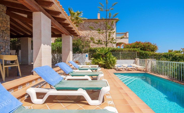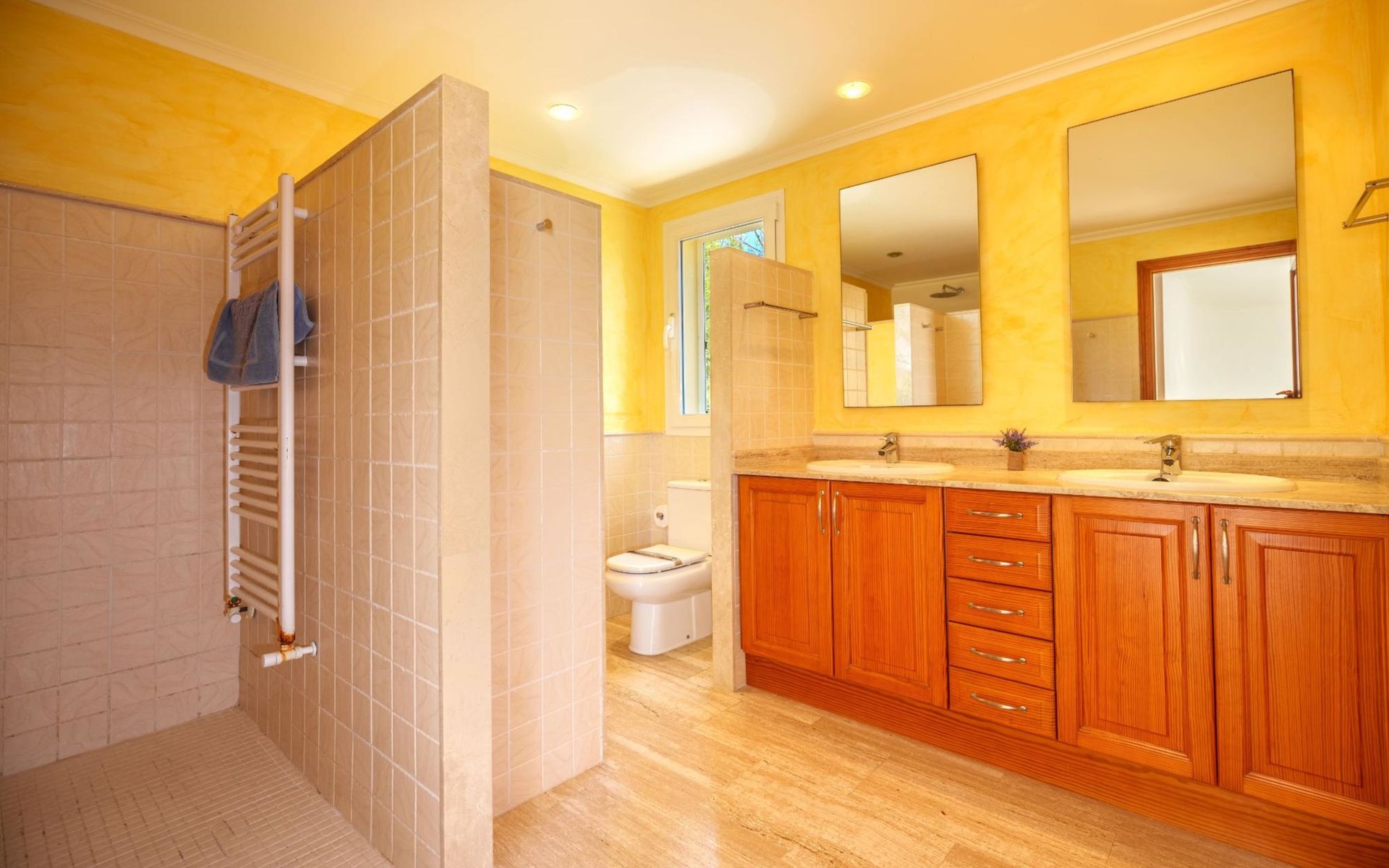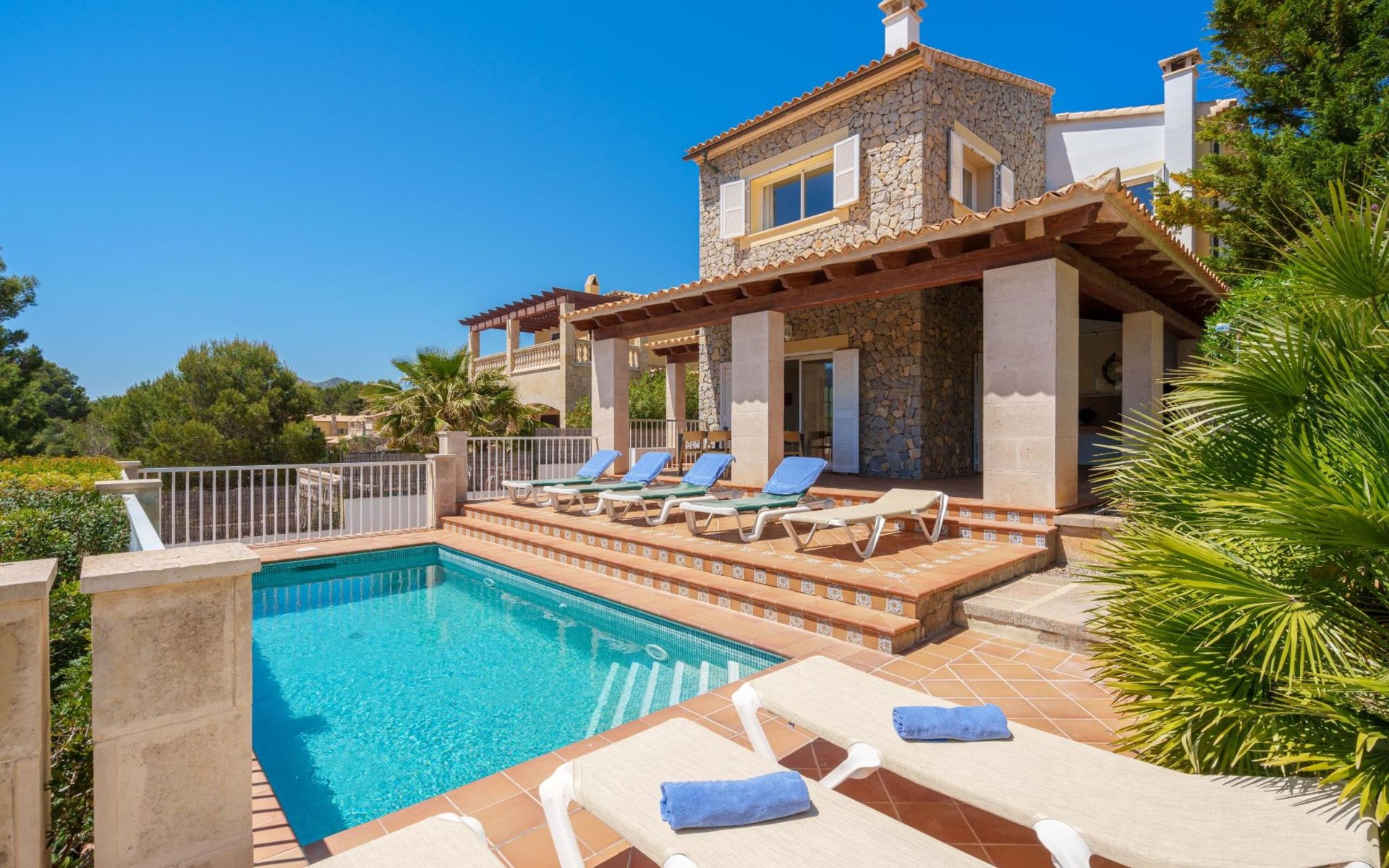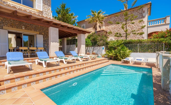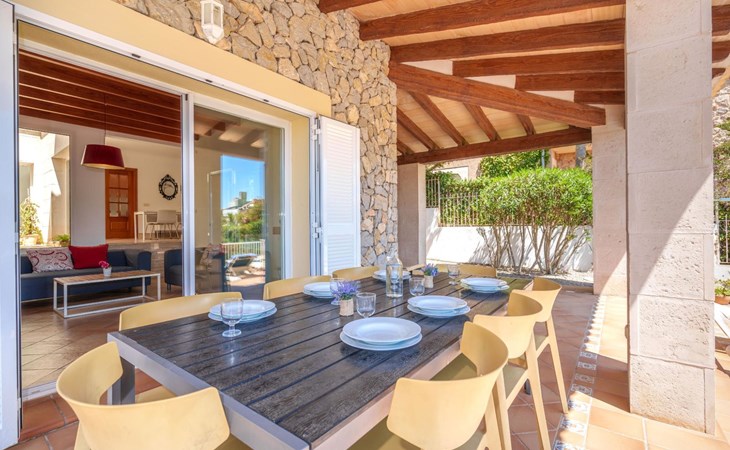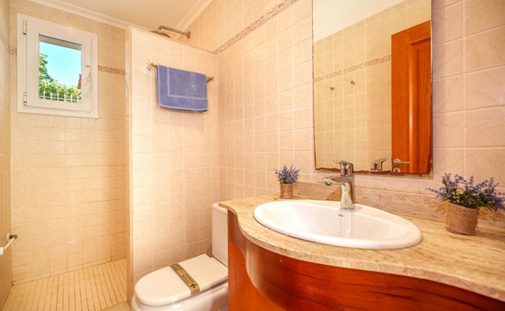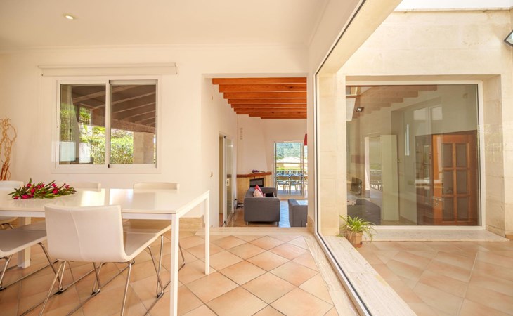 Cala Mesquida 7 km from Capdepera: Modern, comfortable house "Cala Mesquida", 2 storeys, detached. 6 km from the centre of Capdepera, 8 km from the centre of Cala Ratjada, 32 km from the centre of Manacor, on a slope, in the residential district, 100 m from the edge of the forest, 500 m from the sea, 600 m from the beach. Private: natural state property 600 m2 (fenced), terraced garden, swimming pool (6 x 3 m, seasonal availability: 01.Jan. - 31.Dec.). Outdoor shower, pool maintenance by the owner/gardener. Stepped path to the house. Single garage. Shop 350 m, grocery 400 m, supermarket 6 km, restaurant 350 m, bar 200 m, bakery 400 m, café 350 m, pedestrian zone 150 m, bicycle rental 200 m, bus stop "Cala Mesquida" 700 m, railway station "Manacor" 33 km, sandy beach "Cala Mesquida" 500 m. Sports harbour 8 km, marina 8 km, golf course (18 hole) 9 km, surf school, sailing school 500 m, tennis 4 km, riding stable 5 km, walking paths from the house 2 km, cycle lane 1 km. Hiking paths: Talaia de Son Jaumell, Cala Torta 200 m. Please note: car recommended. Groups of teenagers on request only. The owner does not accept any youth groups.