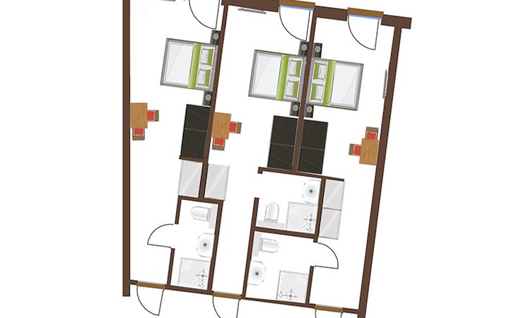 This room can accommodate 2 people and has modern conveniences. Including a pantry with a fridge, microwave and Nespresso machine. The bathroom has a shower, washbasin and toilet.