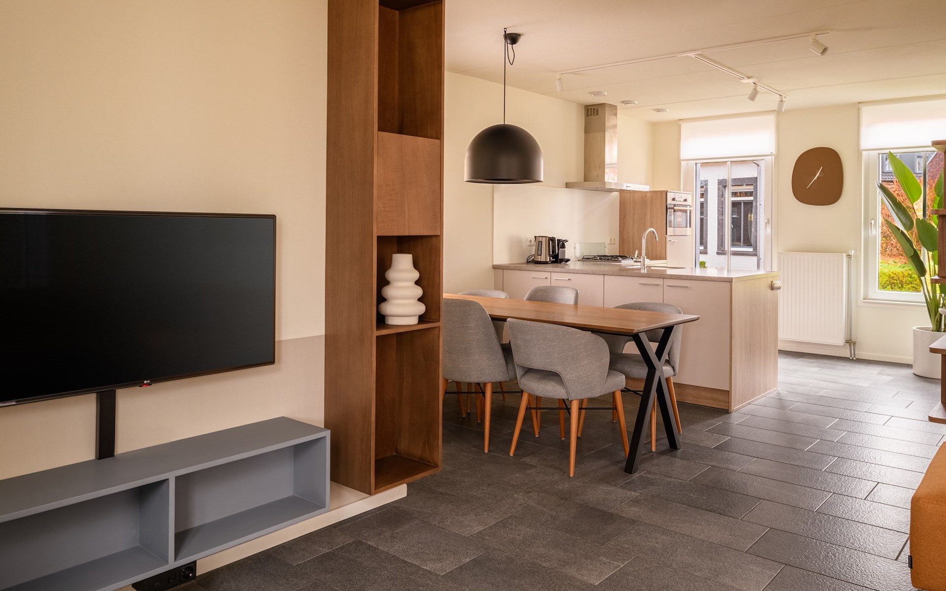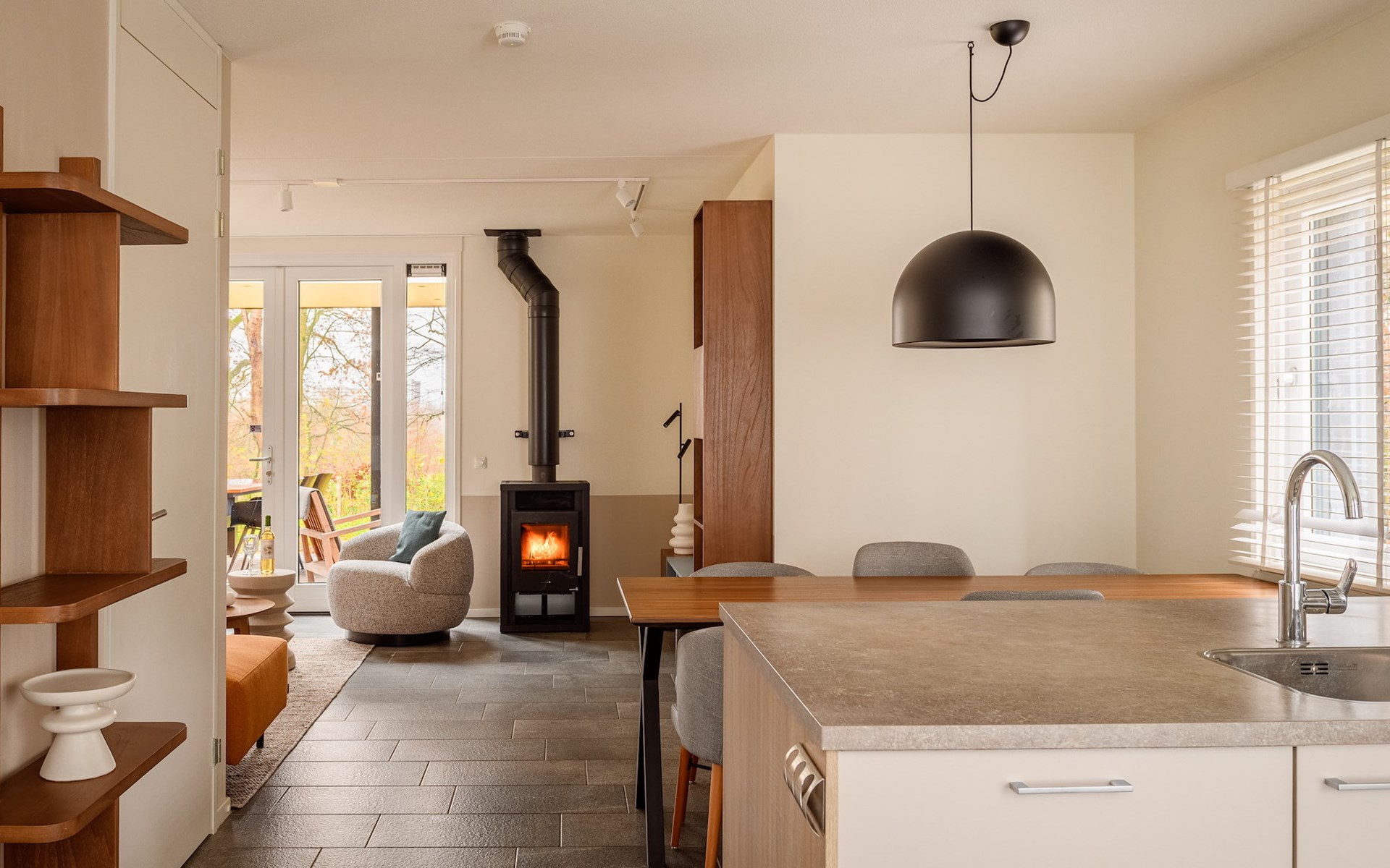 The living room has a seating area with an open fireplace and a television. There is also a dining area with dining table. The luxury kitchen is equipped with a fridge, combi-oven, dishwasher, kettle, toaster and Nespresso machine.