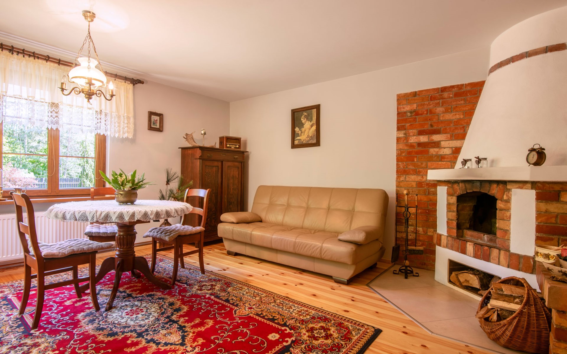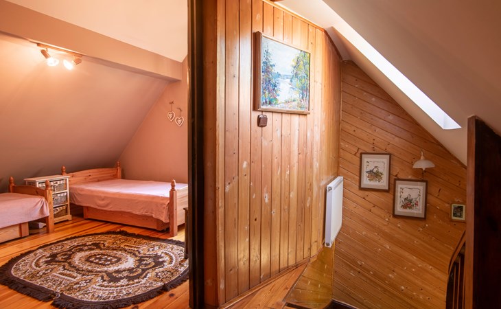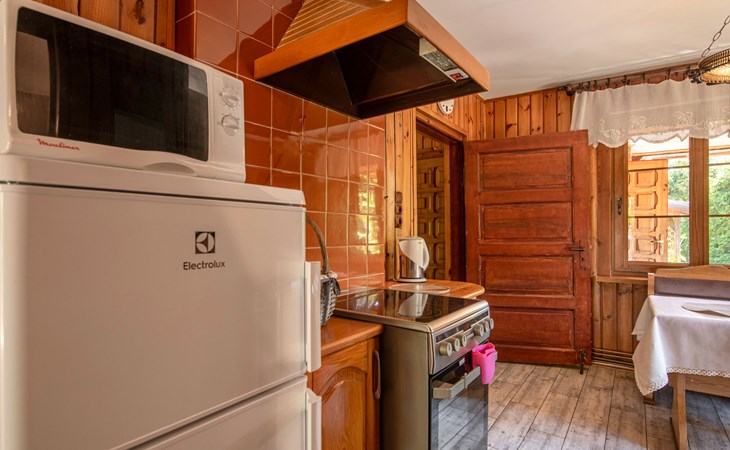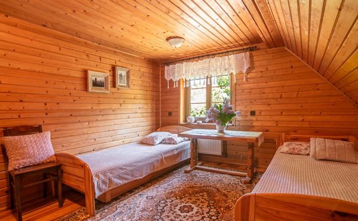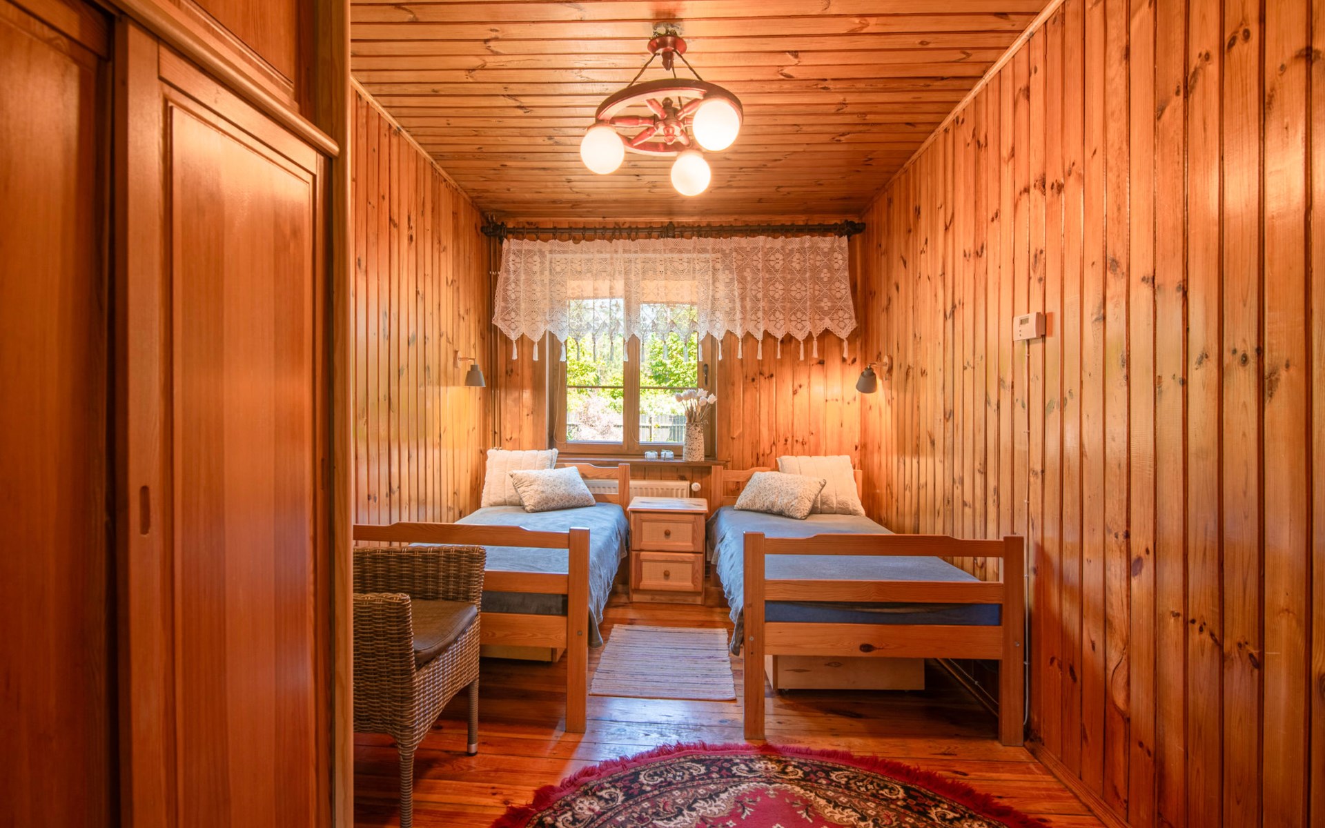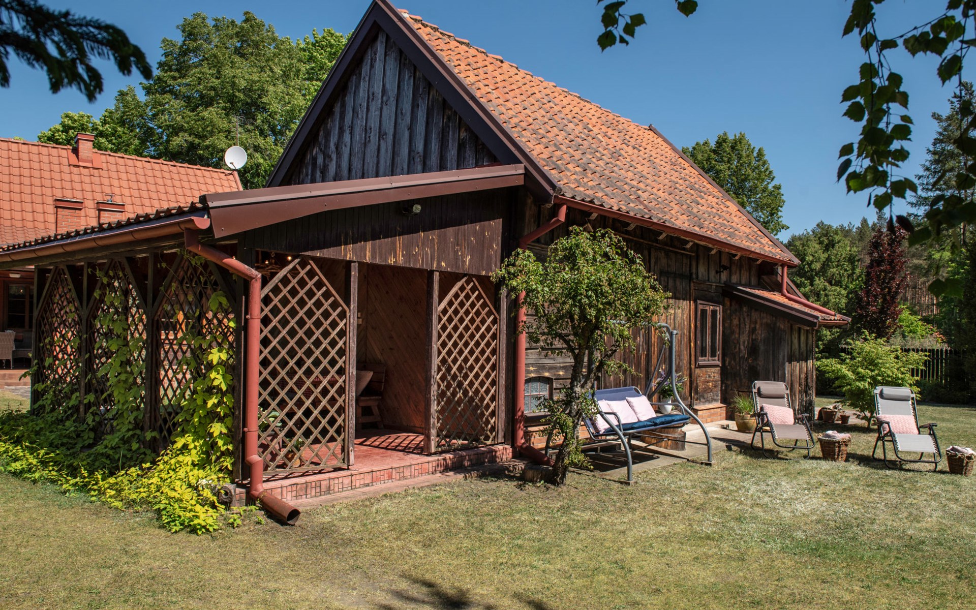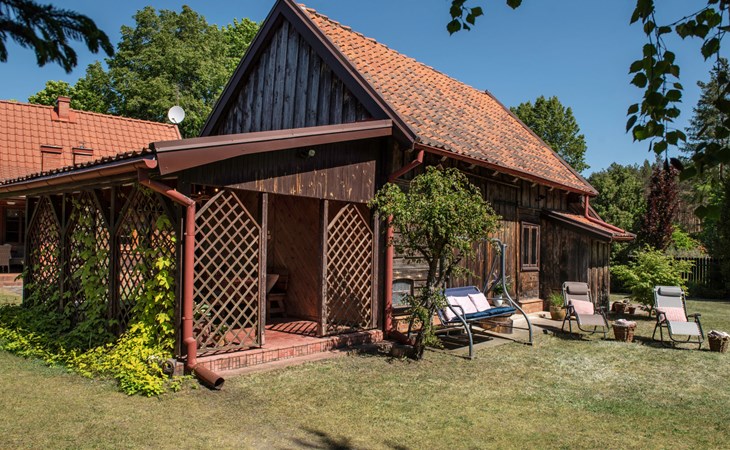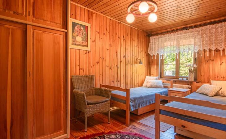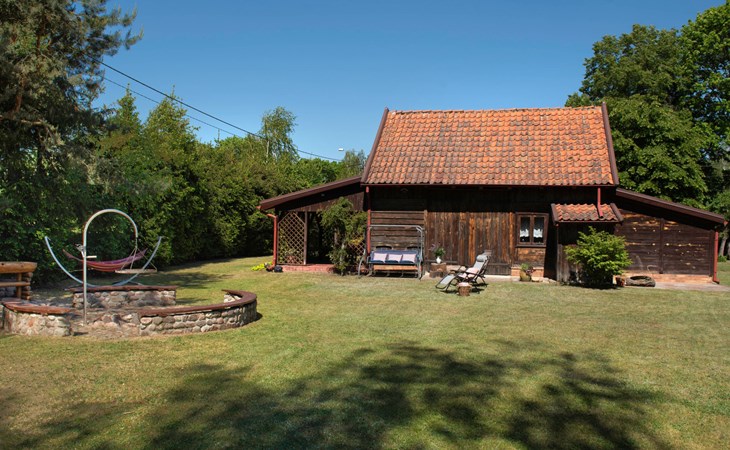 Cosy farmhouse "Szeroki Bór 2", built in 1919, renovated in 1991, surrounded by trees and meadows. In a hamlet, in a quiet, sunny position, along the wooded area, 300 m from the lake, located by a road, in the countryside. Lawn and trees. Private: property 1'500 m2 (fenced), flowers and trees, courtyard. Arbour (12 m2), terrace (5 m2), garden furniture, barbecue, fireplace. In the house: storage room for bicycles. Parking at the house, single garage. Grocery 3 km, shopping centre 4 km, restaurant 4 km, bar 3 km, bus stop 100 m, sandy beach 4 km. Tennis 7 km, riding stable 7 km. Please note: fishing [permit required].