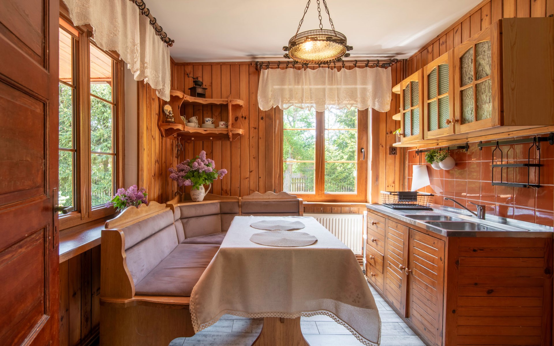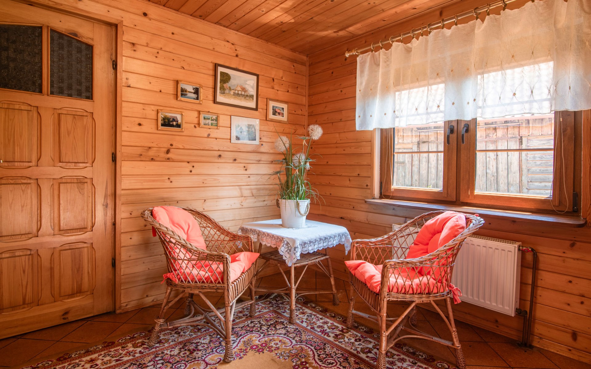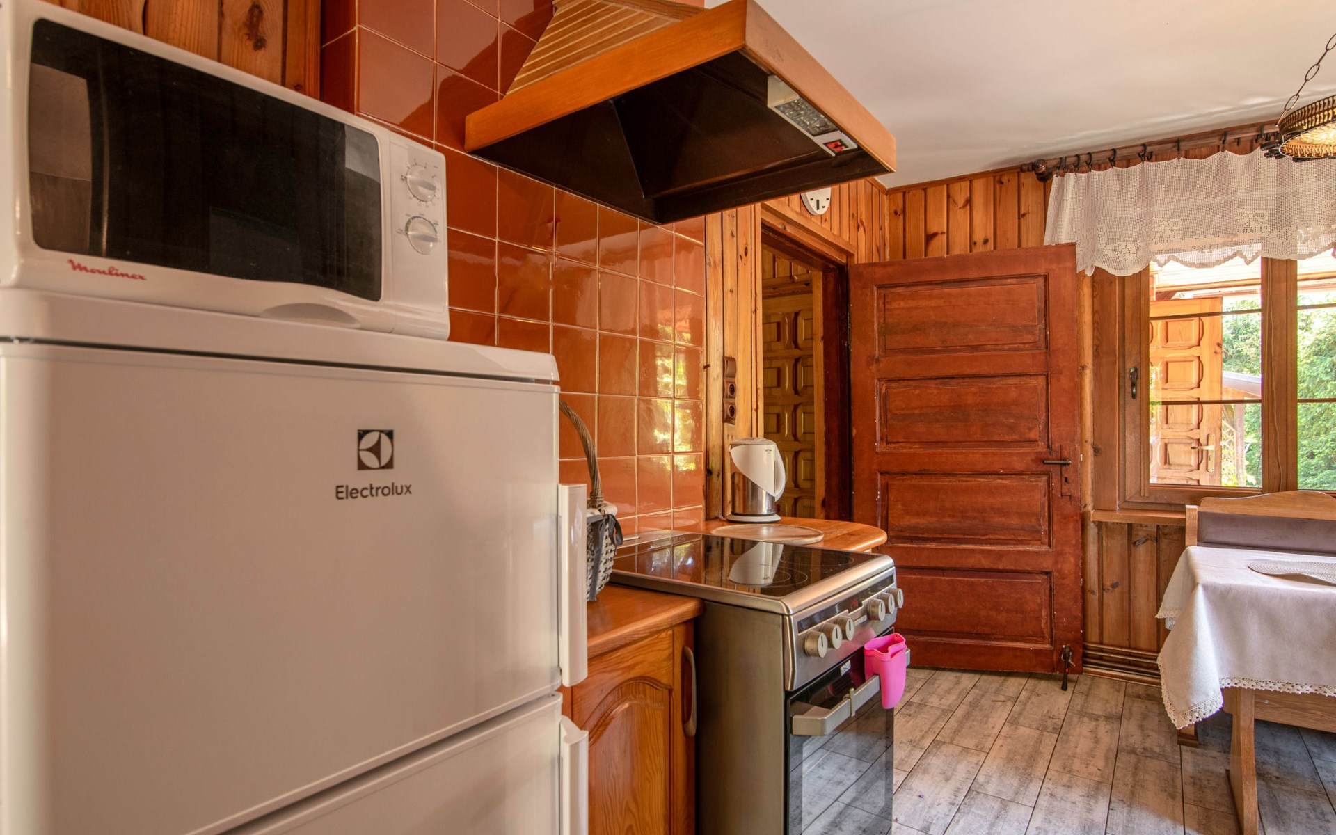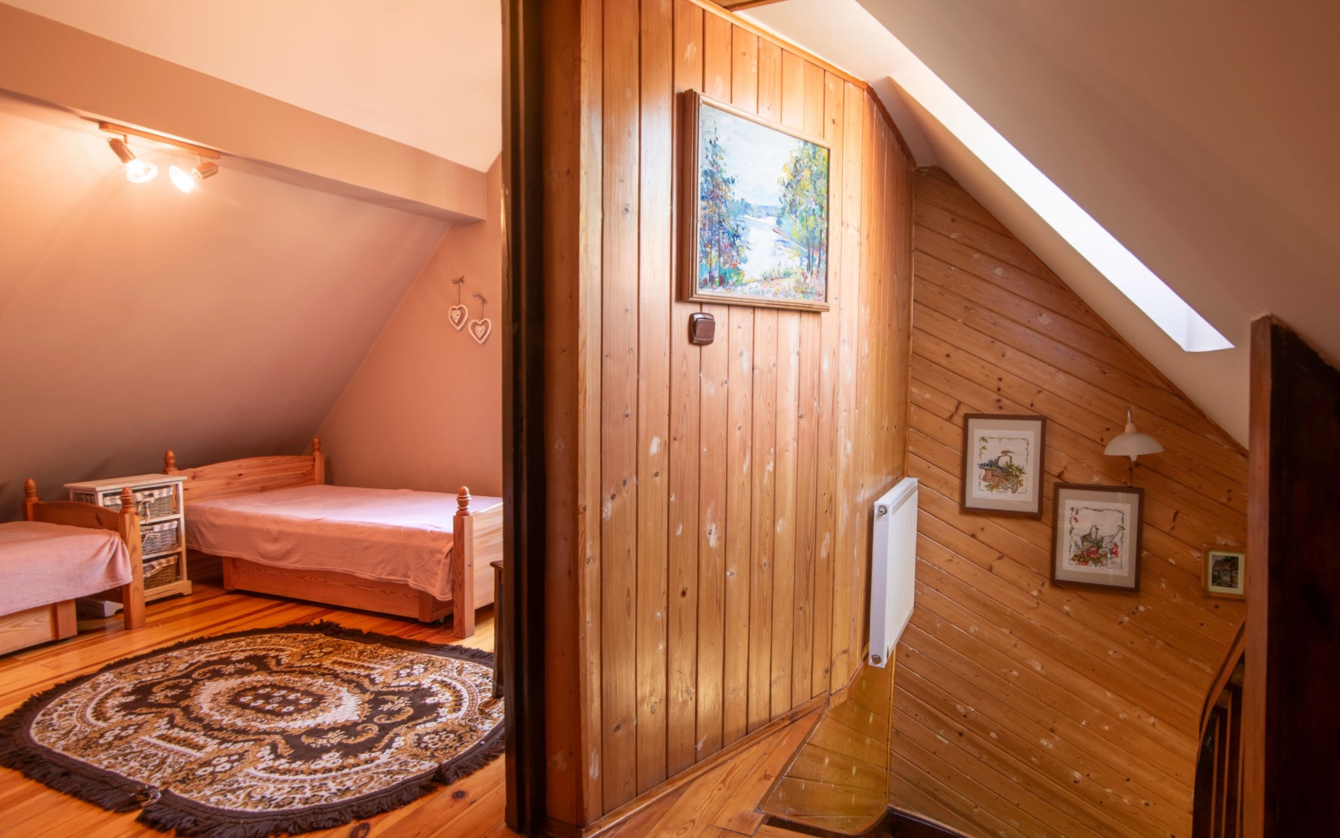 Cosy farmhouse "Szeroki Bór 2", built in 1919, renovated in 1991, surrounded by trees and meadows. In a hamlet, in a quiet, sunny position, along the wooded area, 300 m from the lake, located by a road, in the countryside. Lawn and trees. Private: property 1'500 m2 (fenced), flowers and trees, courtyard. Arbour (12 m2), terrace (5 m2), garden furniture, barbecue, fireplace. In the house: storage room for bicycles. Parking at the house, single garage. Grocery 3 km, shopping centre 4 km, restaurant 4 km, bar 3 km, bus stop 100 m, sandy beach 4 km. Tennis 7 km, riding stable 7 km. Please note: fishing [permit required].