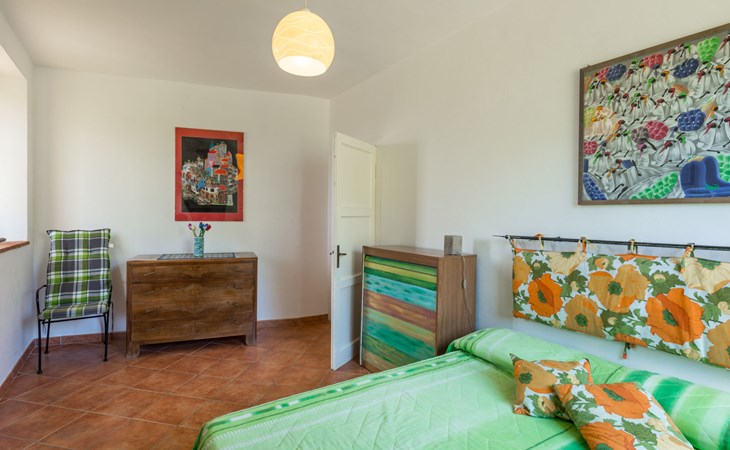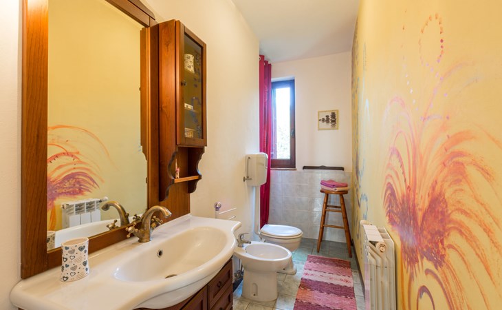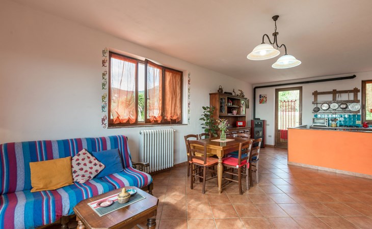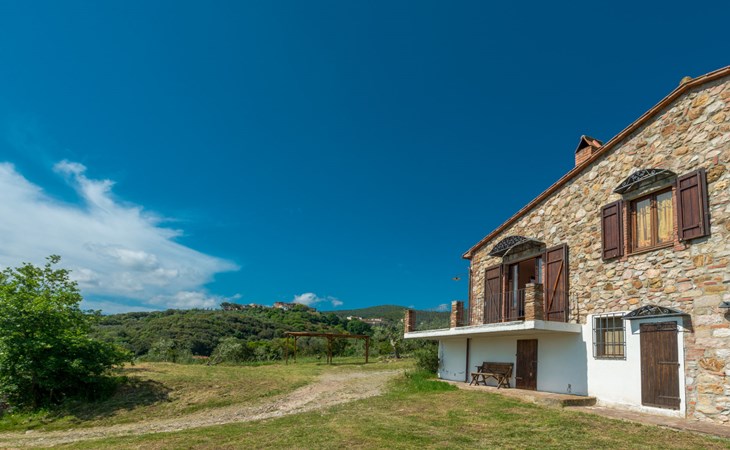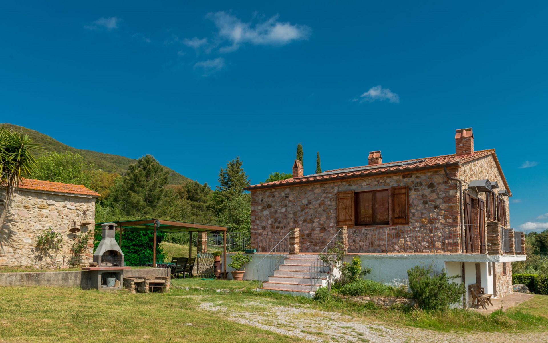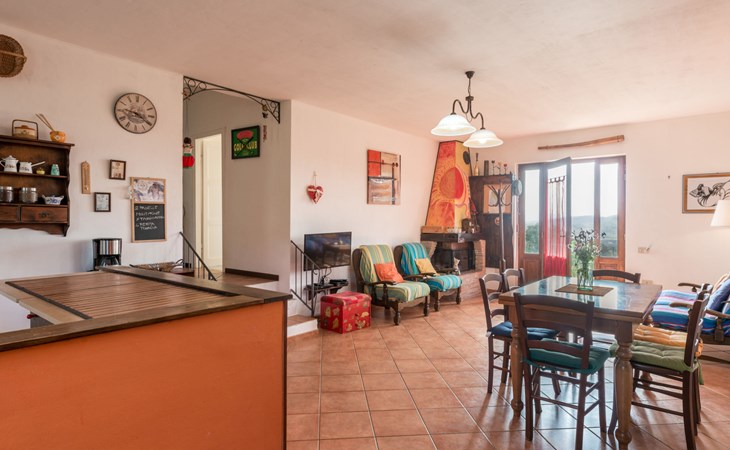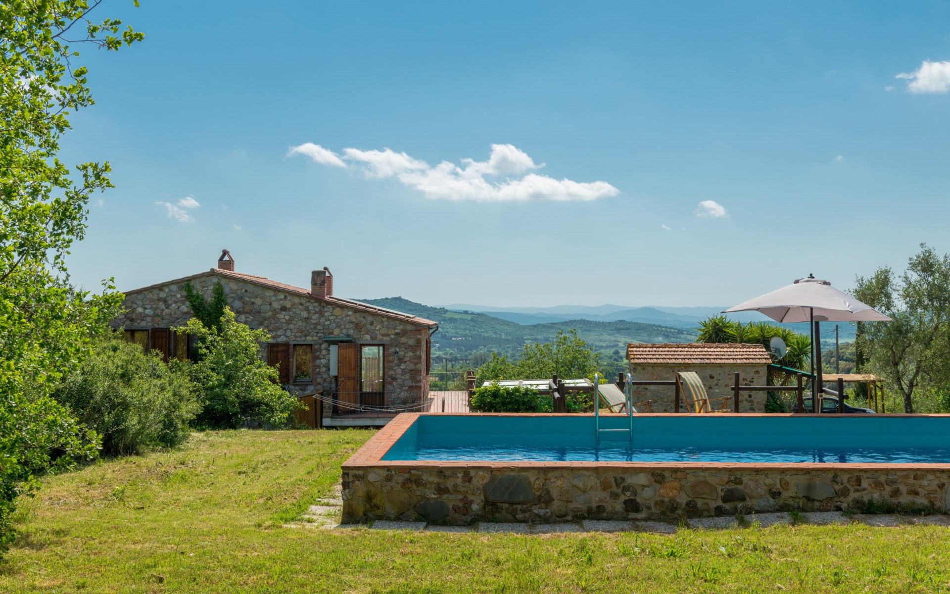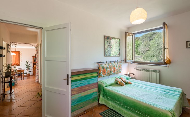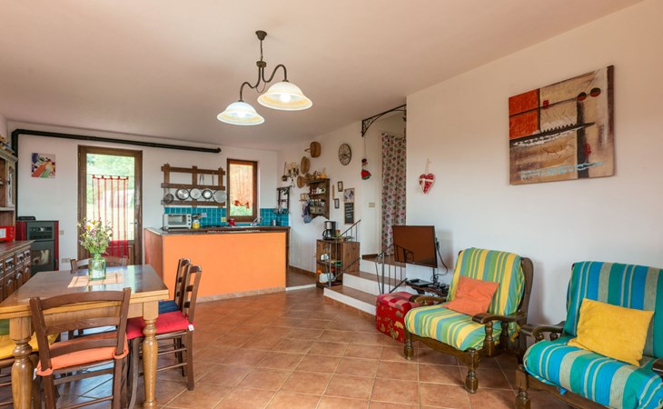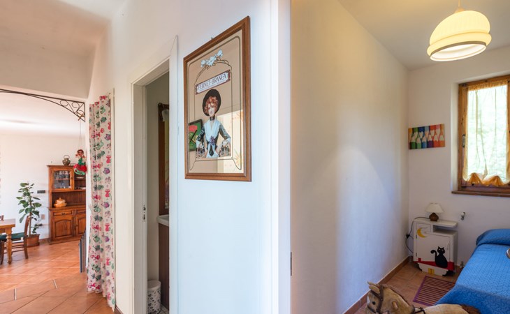 House "Valmarinella", surrounded by trees and meadows. 2 apartments in the property. 2.5 km from the centre of Ravi, 20 km from the centre of Follonica, 30 km from the centre of Grosseto, in a quiet, sunny position, 20 km from the sea, in the countryside. Private: property 7'000 m2 with trees, meadow, beautiful garden to relax, swimming pool (9 x 5 m, seasonal availability: 15.May. - 15.Oct.). Outdoor shower, barbecue. 50 m long motor access (via unmade road). Stepped path (6 steps) to the house. Roofed, parking on the premises. Shop 2.5 km, supermarket 5 km, restaurant 1.7 km, bus stop 200 m, railway station "Follonica" 22 km, ferry "Piombino" 50 km, sandy beach 20 km. Marina 16 km, golf course (18 hole) 29 km. Nearby attractions: Gavorrano 3 km, Scarlino 14 km, Cala Violina 20 km, Catiglione della Pescaia 27 km, Follonica 22 km. Well-known lakes can easily be reached: Accesa 15 km. Hiking paths: Mountain-bike trails 700 m. Two rooms on the lower ground floor with a separate entrance have a different owner and are occasionally used for holiday purposes (without use of the pool).