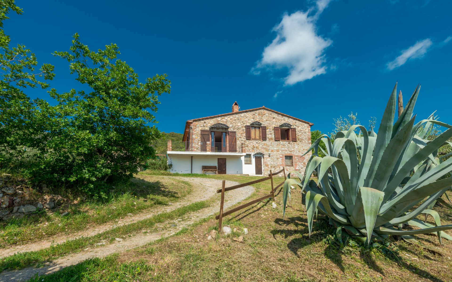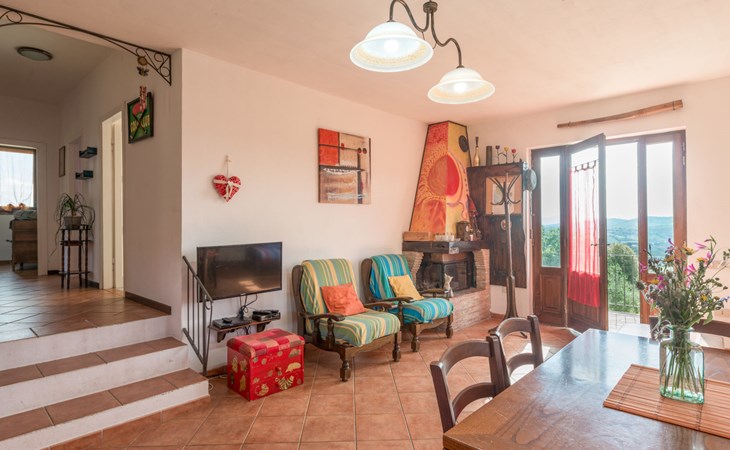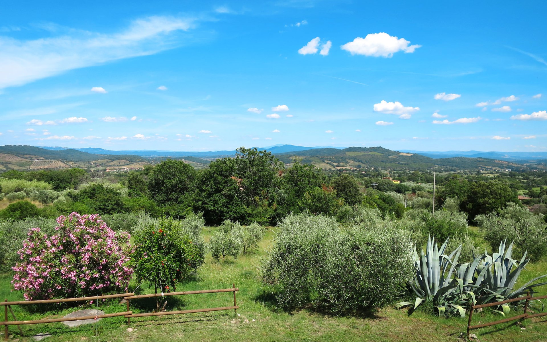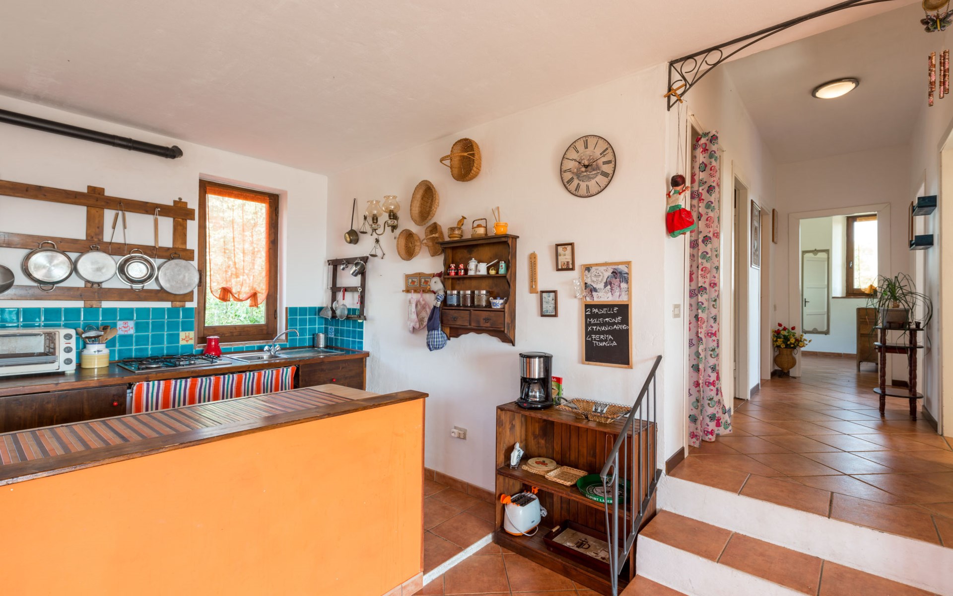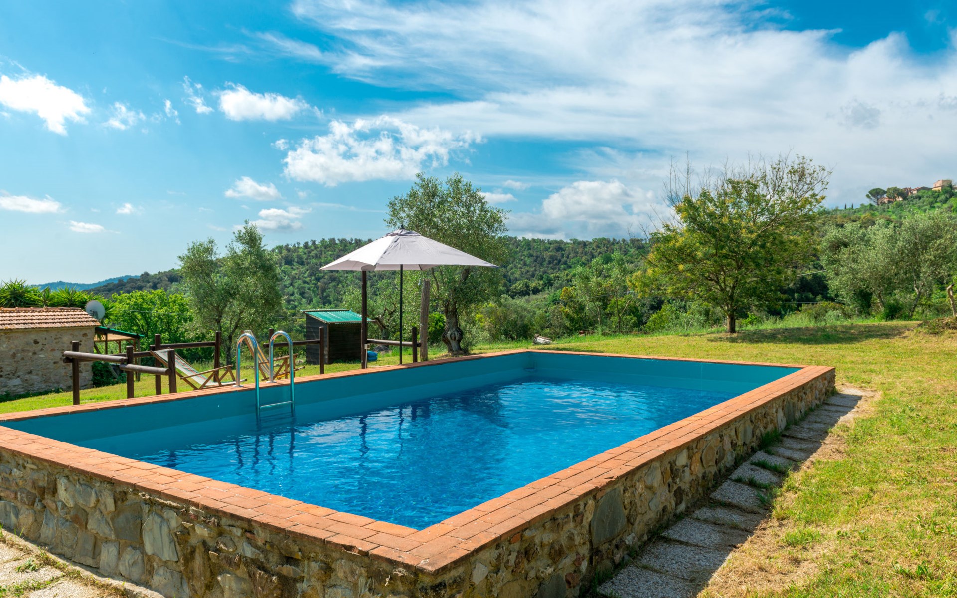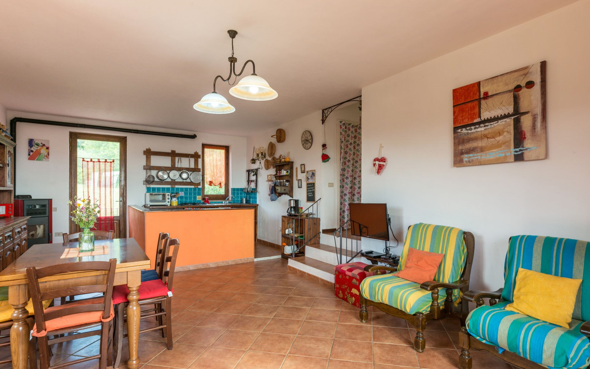 House "Valmarinella", surrounded by trees and meadows. 2 apartments in the property. 2.5 km from the centre of Ravi, 20 km from the centre of Follonica, 30 km from the centre of Grosseto, in a quiet, sunny position, 20 km from the sea, in the countryside. Private: property 7'000 m2 with trees, meadow, beautiful garden to relax, swimming pool (9 x 5 m, seasonal availability: 15.May. - 15.Oct.). Outdoor shower, barbecue. 50 m long motor access (via unmade road). Stepped path (6 steps) to the house. Roofed, parking on the premises. Shop 2.5 km, supermarket 5 km, restaurant 1.7 km, bus stop 200 m, railway station "Follonica" 22 km, ferry "Piombino" 50 km, sandy beach 20 km. Marina 16 km, golf course (18 hole) 29 km. Nearby attractions: Gavorrano 3 km, Scarlino 14 km, Cala Violina 20 km, Catiglione della Pescaia 27 km, Follonica 22 km. Well-known lakes can easily be reached: Accesa 15 km. Hiking paths: Mountain-bike trails 700 m. Two rooms on the lower ground floor with a separate entrance have a different owner and are occasionally used for holiday purposes (without use of the pool).