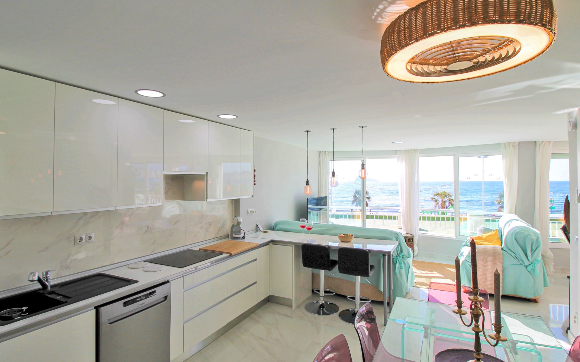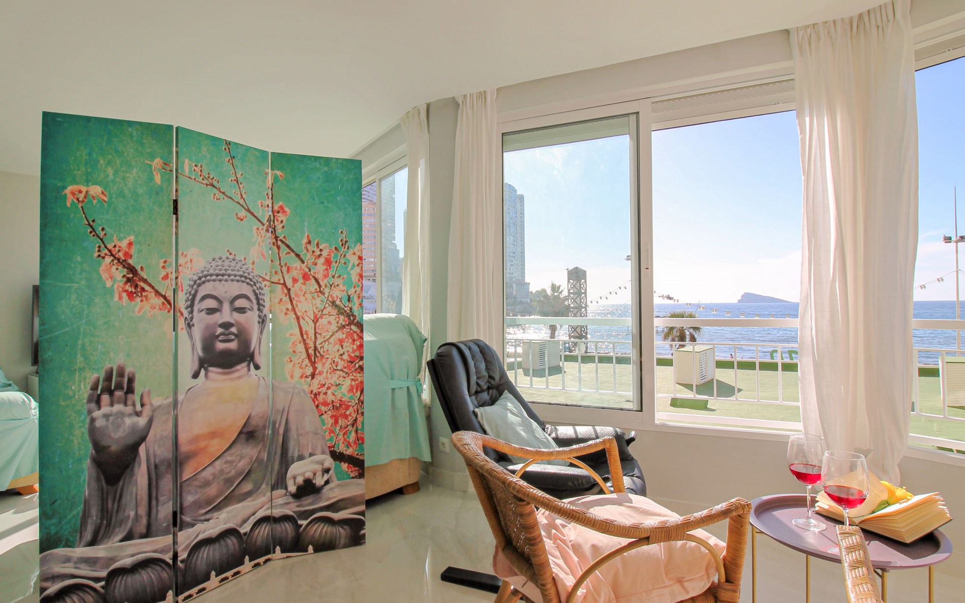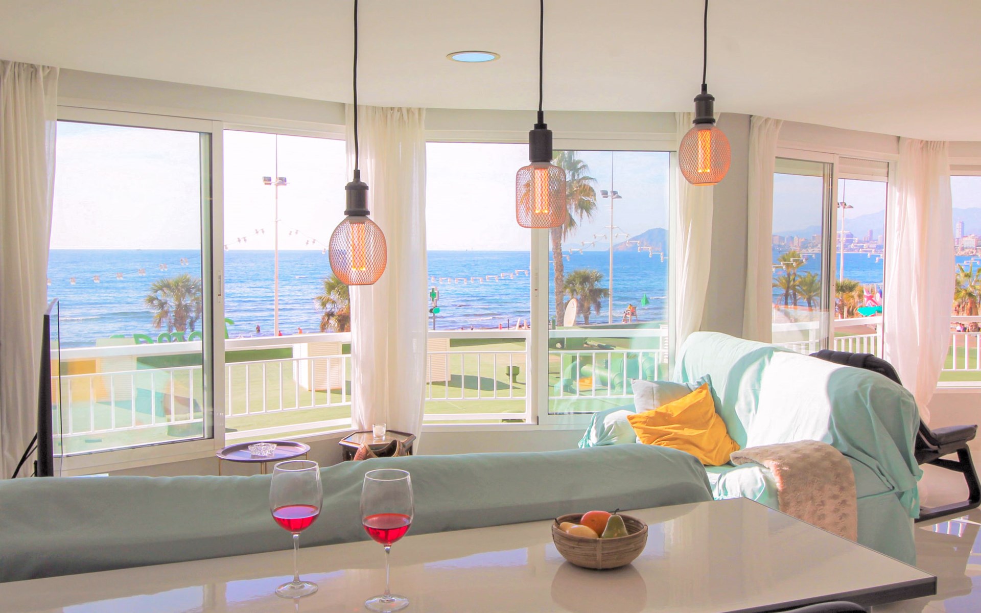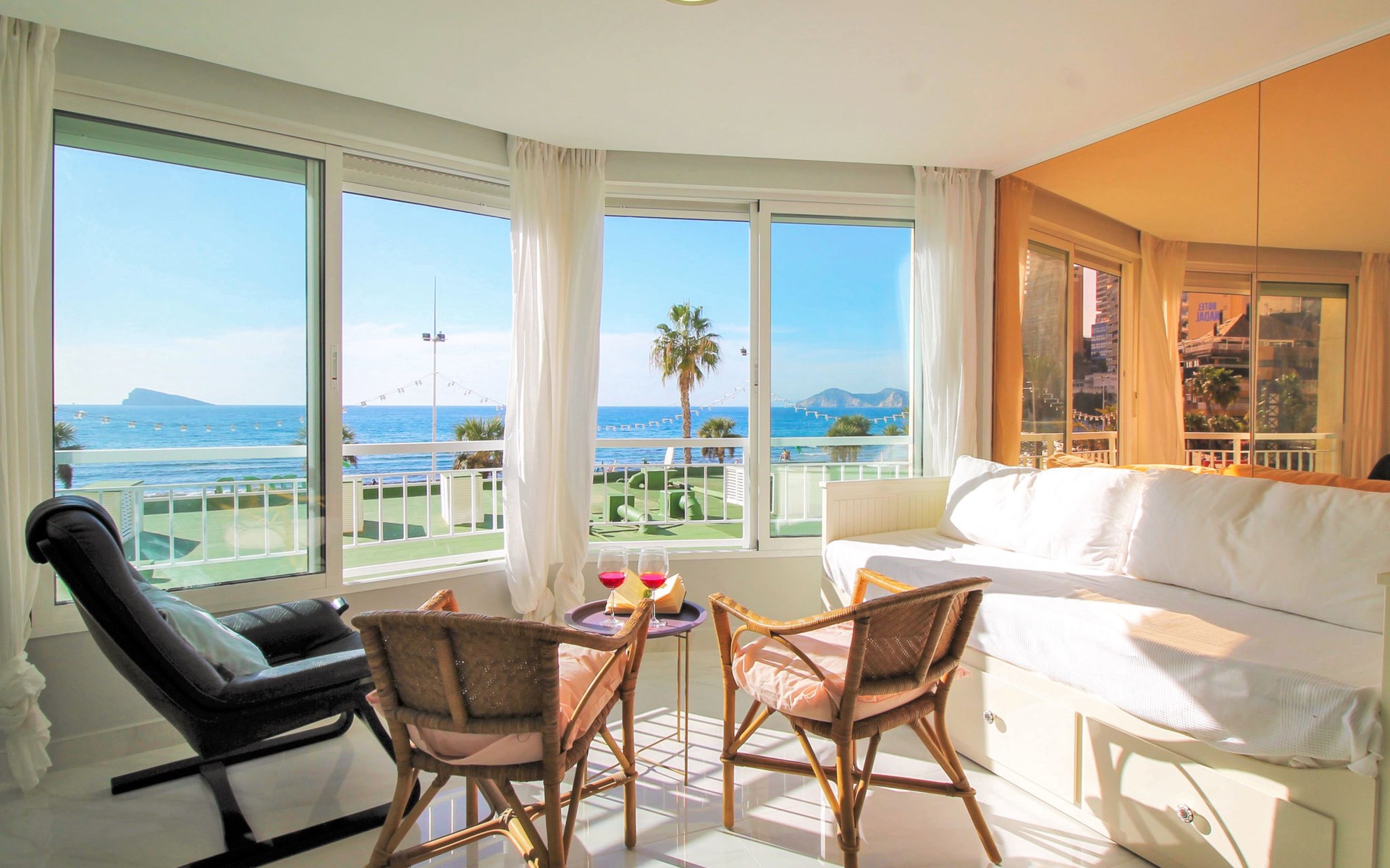 Playa de Levante: Large, comfortable apartment block "Vistas sobre el mar", 19 storeys. In the resort Rincon de Loix, in the district Playa de Levante, in a busy, sunny position, in the heart of the city, 20 m from the sea, from the beach, road to cross. For shared use: property (fenced), swimming pool (5 x 8 m, depth 90 - 170 cm, seasonal availability: 01.Jan. - 31.Dec.). Outdoor shower. In the house: lift. Public parking. Supermarket 30 m, restaurant 20 m, bar 10 m, bus stop "Benidorm Urbano" 100 m, railway station "Benidorm" 5 km. Golf course (18 hole) 7 km, walking paths from the house 300 m. Nearby attractions: Aqualandia 2 km, Mundomar 2 km, Terra Mitica 9 km, Terranatura 9 km, Alicante 44 km, Aeropuerto Alicante 58 km. Please note: baby equipment on request. Groups of teenagers on request only. 24hr guard. Neighbourhood highly sensitive to noise. Quietness and good behaviour expected.