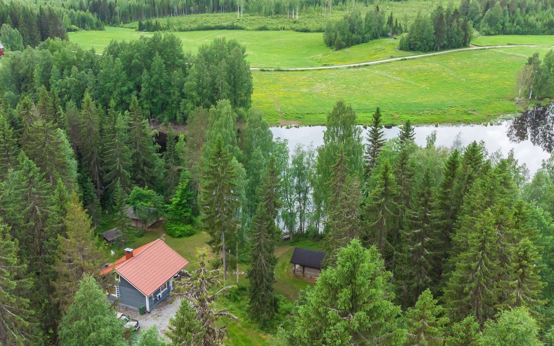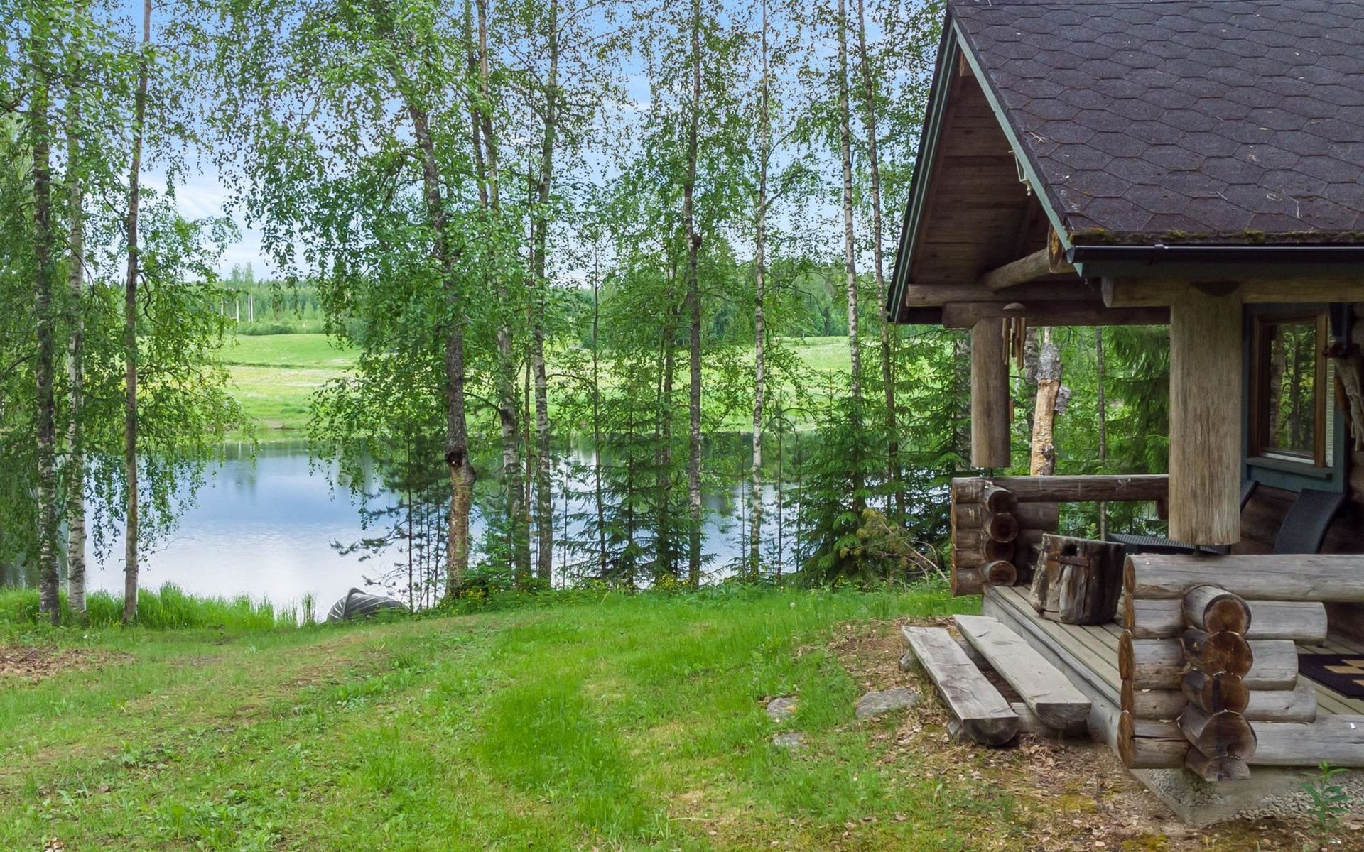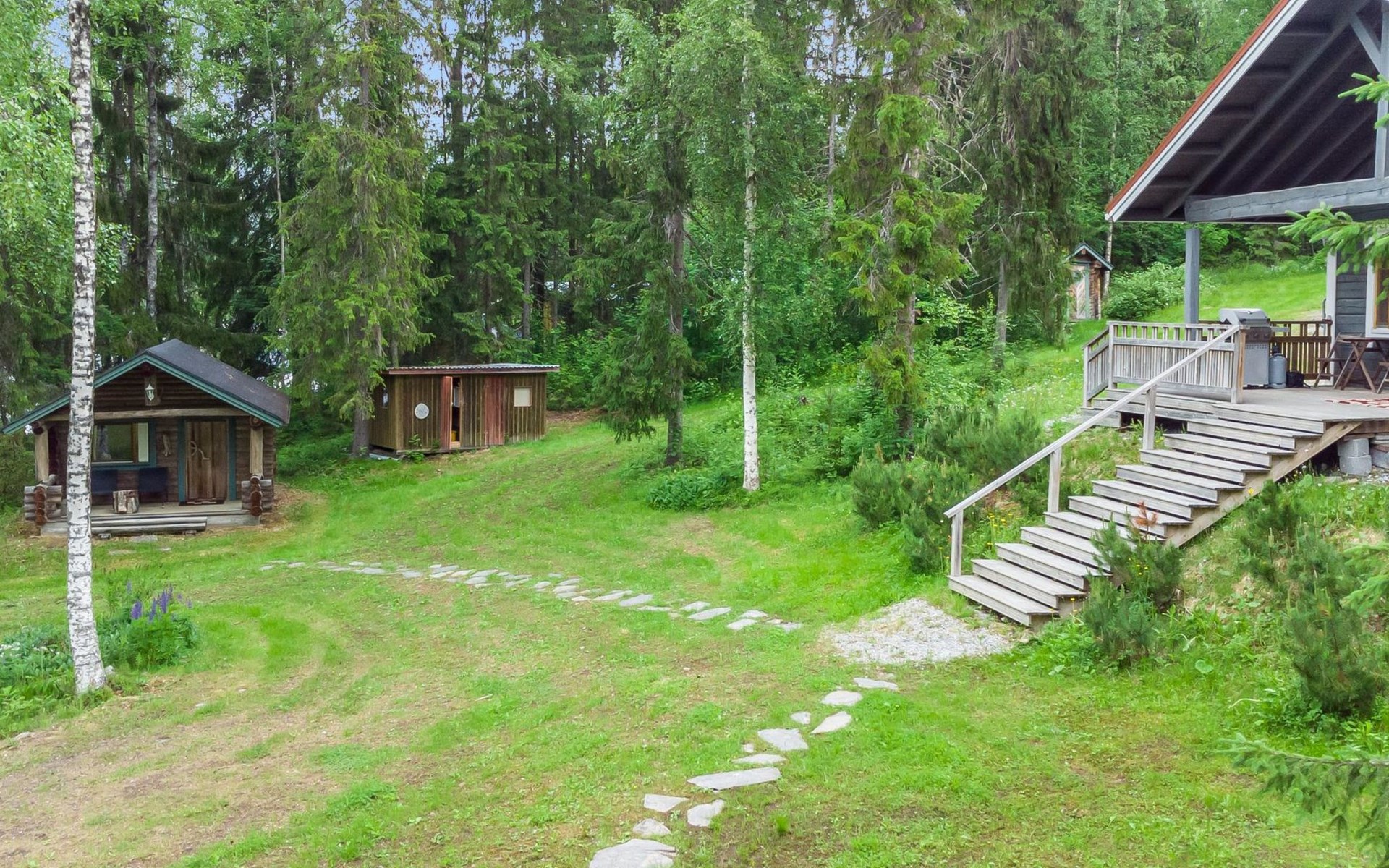 Spacious grassy yard. The parking area is gravel-covered. There is plenty of space in the yard to relax.
