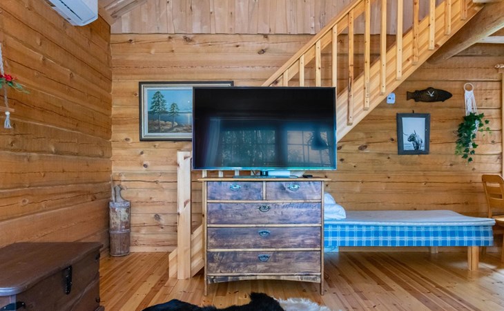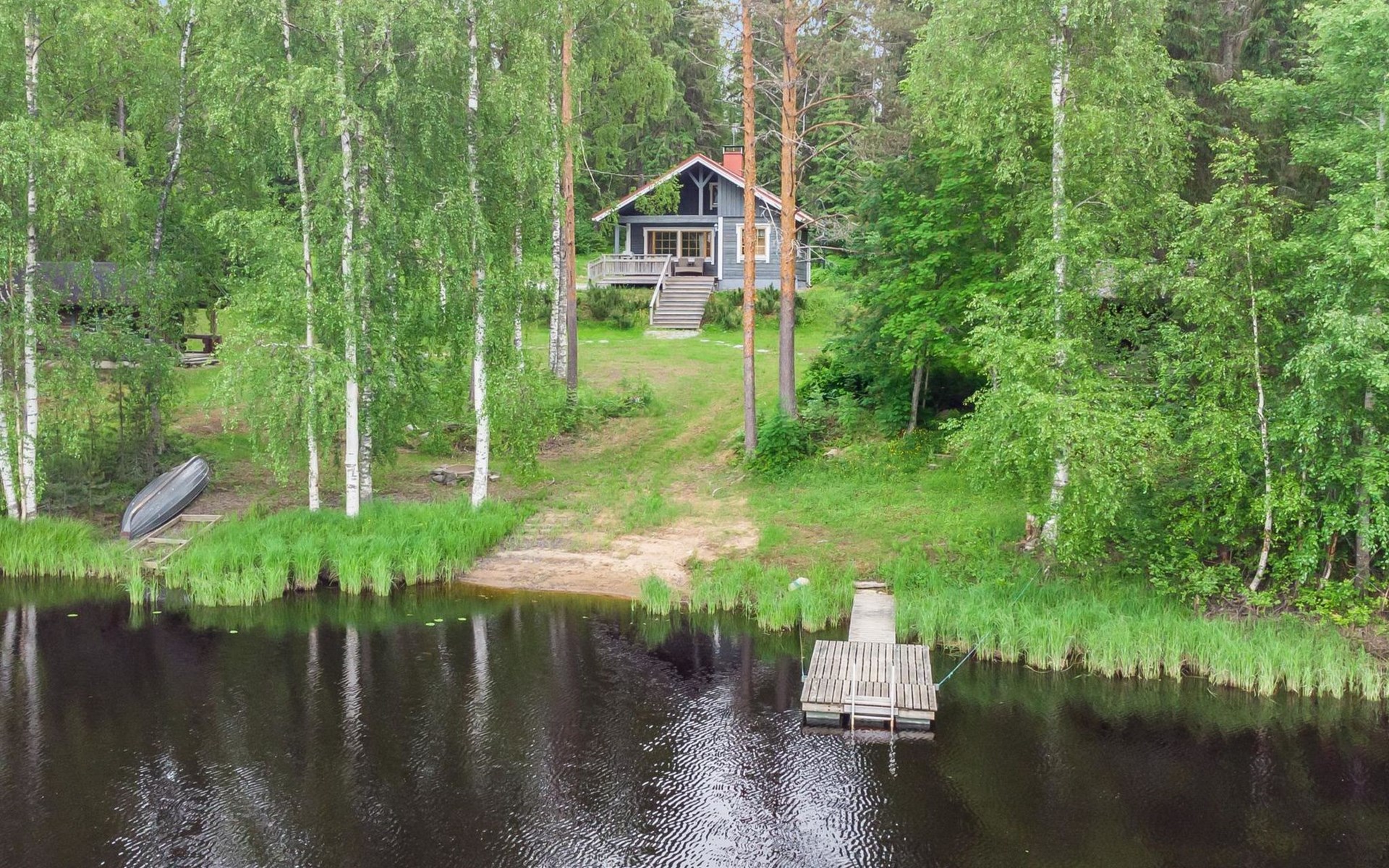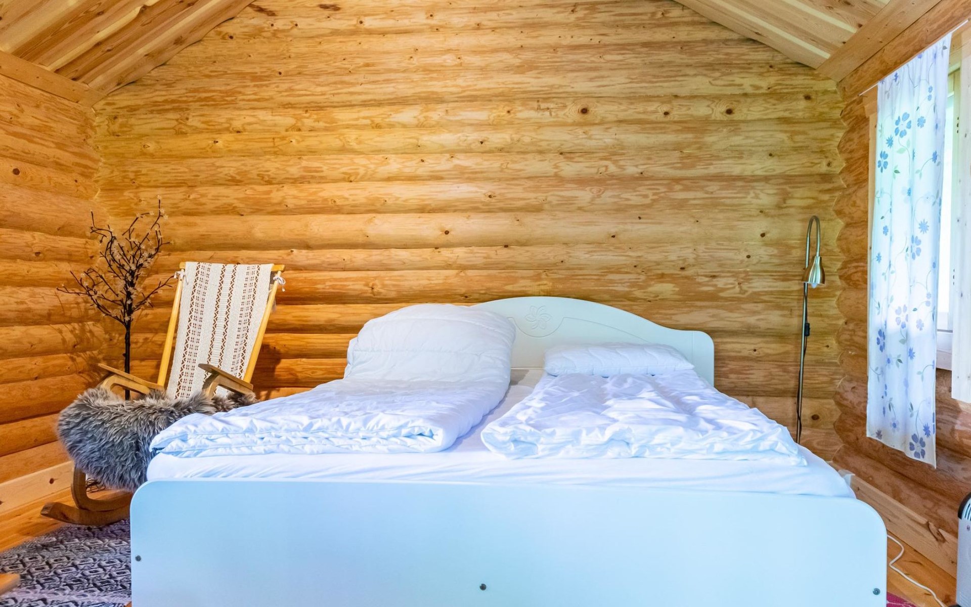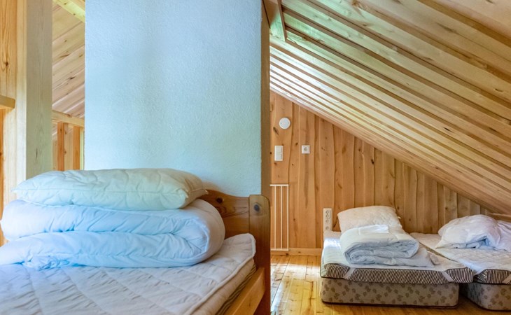 23 km northeast of Iisalmi, River Matkusjoki 35 m, log cabin (2018), living room with TV, heat-storing fireplace, sofa bed that can be extended to a 140x200 cm bed for two. WC with shower. One bed under the stairs. Well-equipped kitchen and spacious dining area. In the loft, there is one bed and two 80x200 cm mattresses on the floor. The yard's outbuilding has a double bed. The outbuilding includes an electric heater, so it can be used for accommodation in winter as well.