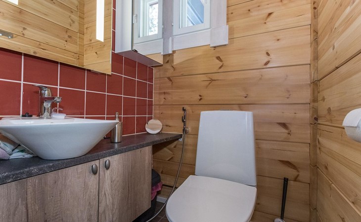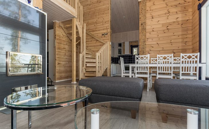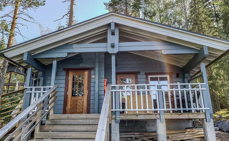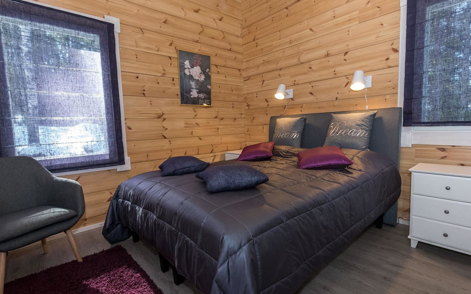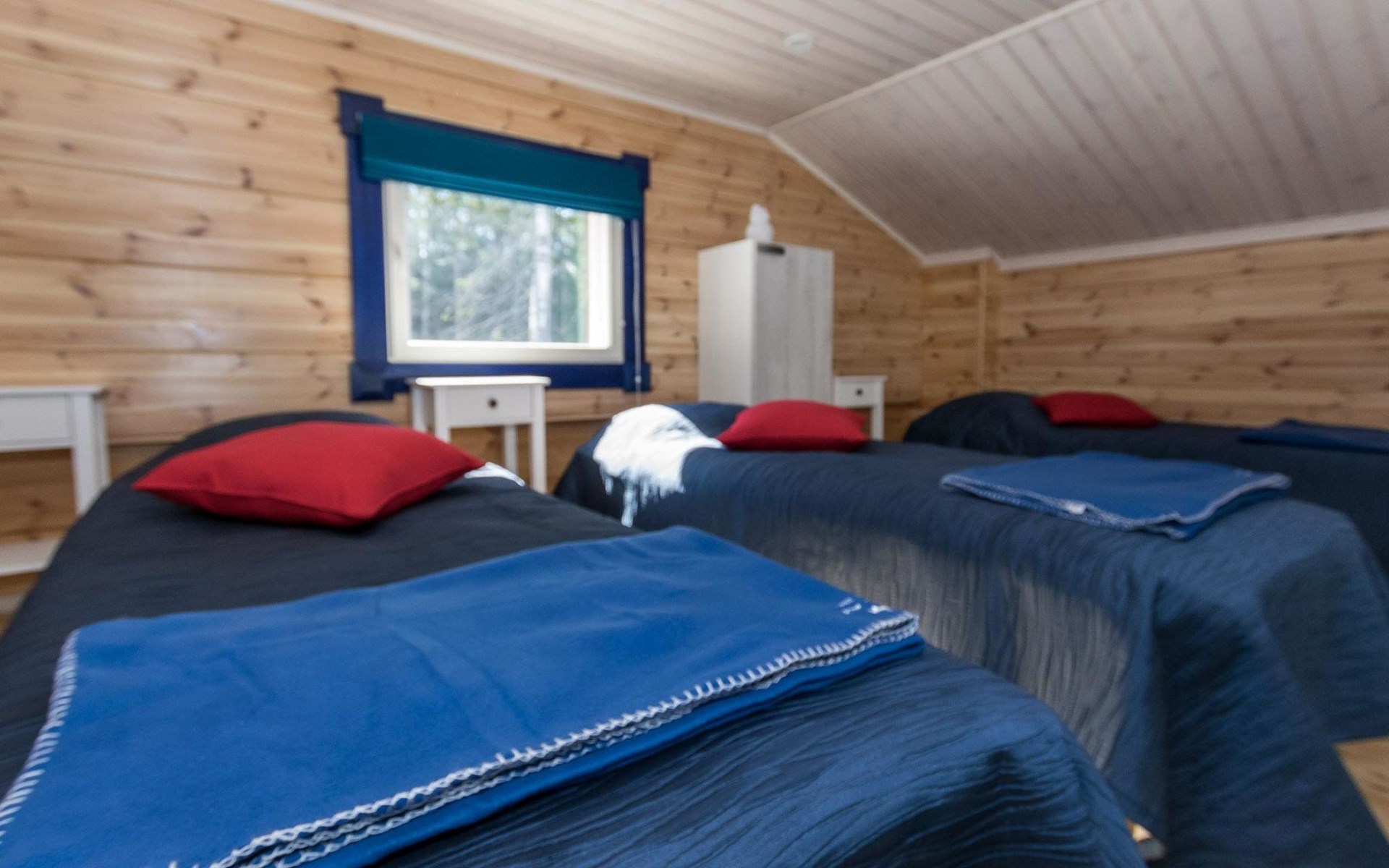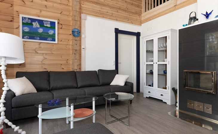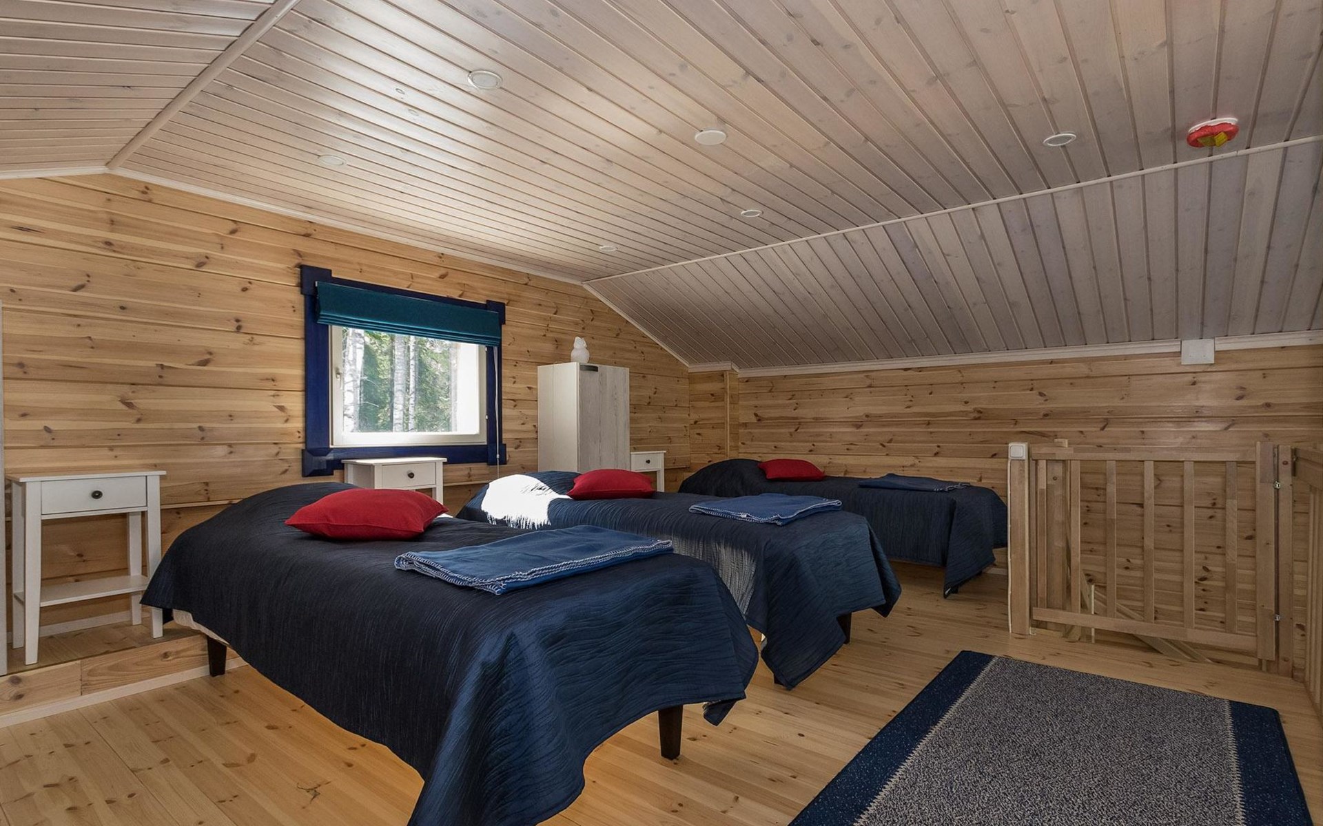 Laminated log cabin 2019, living room, living room/kitchen, bedroom 1: double bed, bedroom 2: two beds, WC, sauna, washroom (electric sauna stove), two beds in the loft, child safety gate at the top of the stairs.