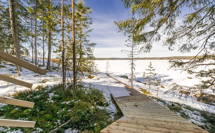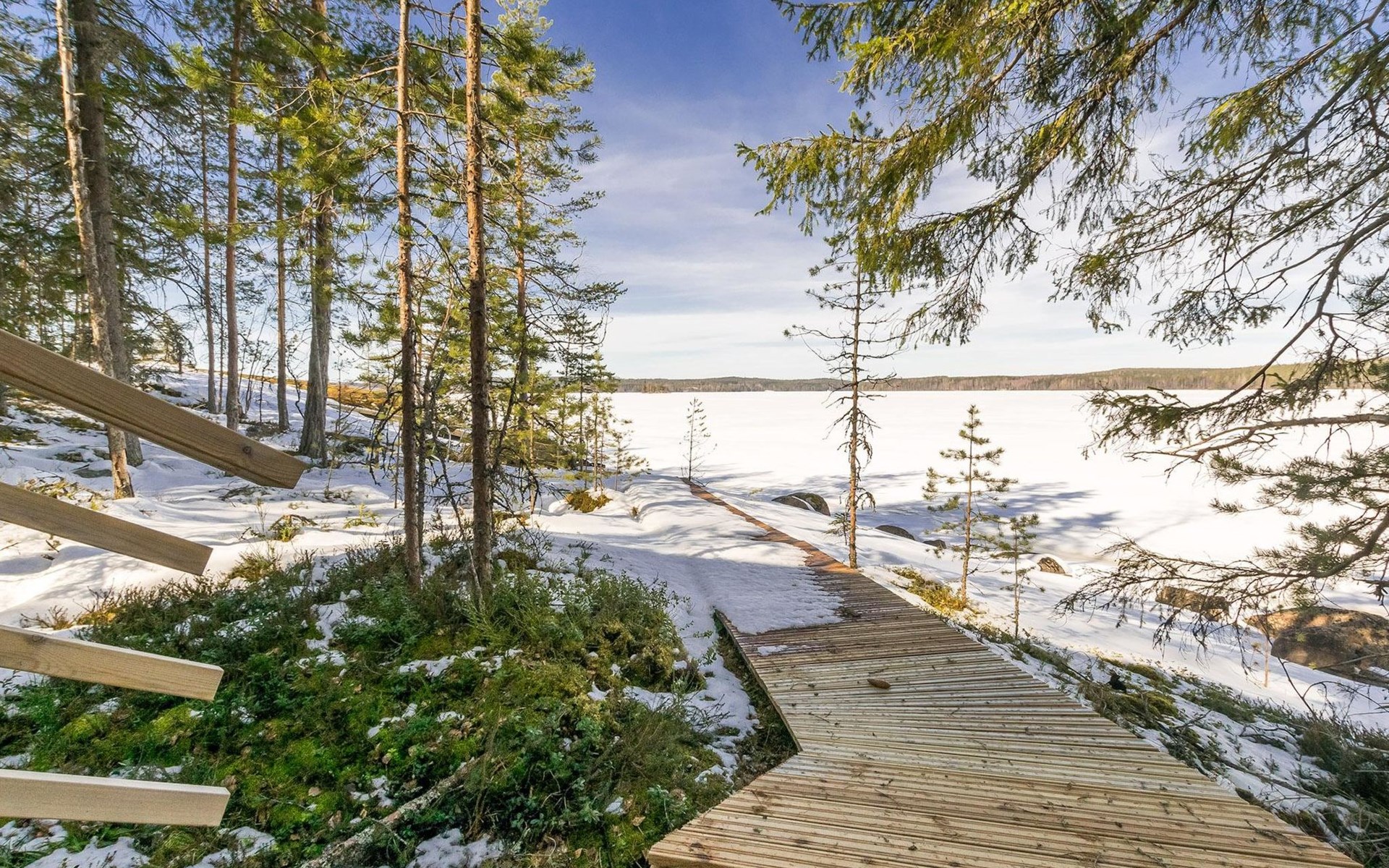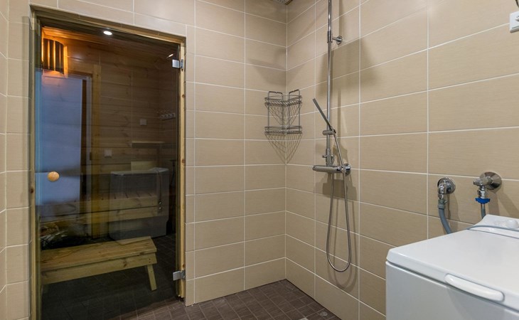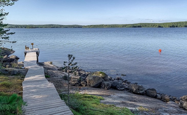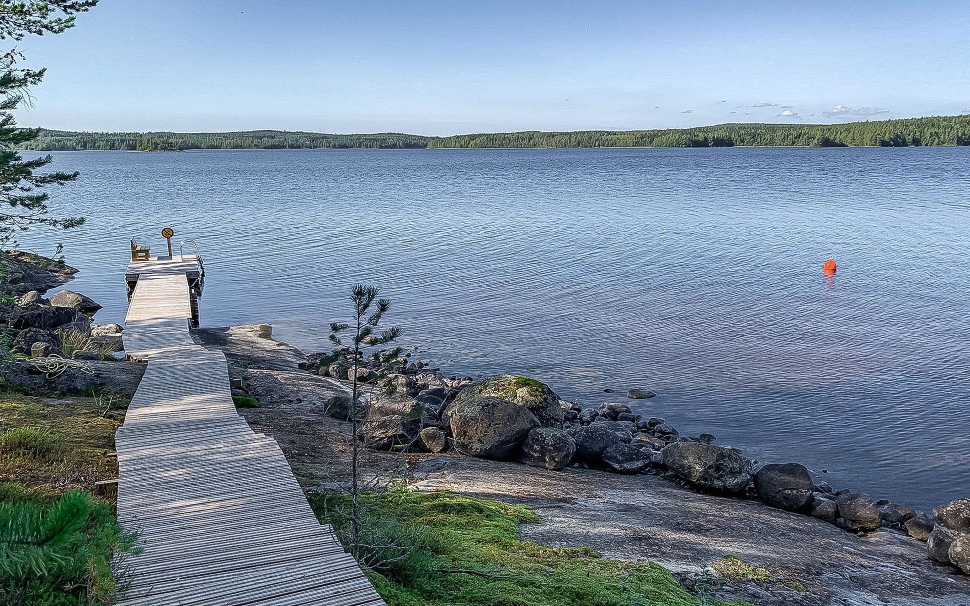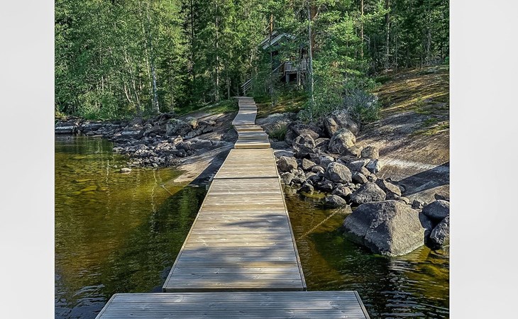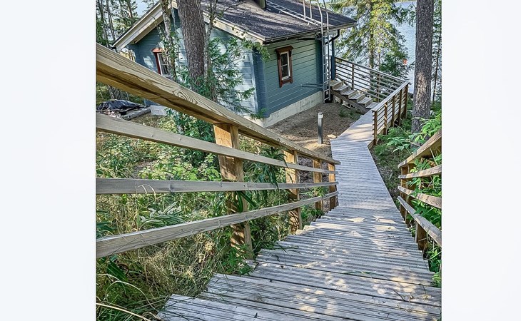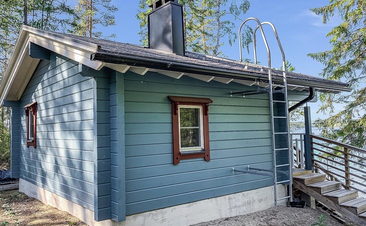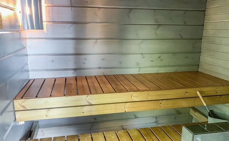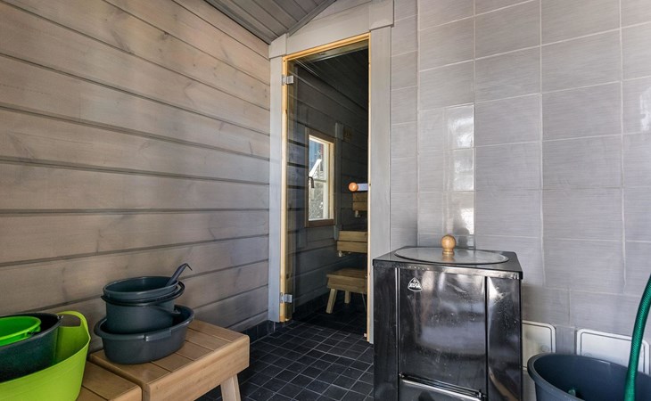 Separate lakeside sauna with electric light, steam room (wood-heated sauna stove), washroom (cold water from the lake with pumps for summer time, in addition to the wood heated water stew), dressing room with seats for four and wood-fired stove.
