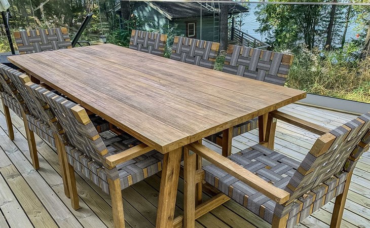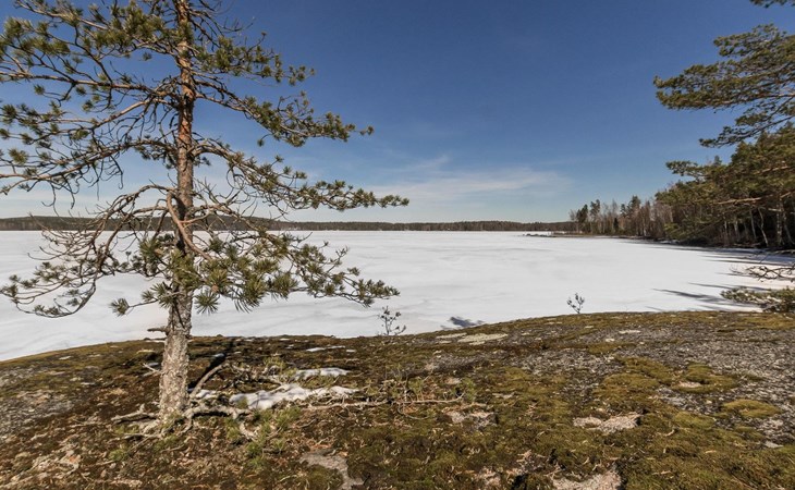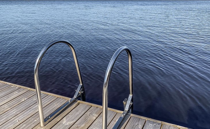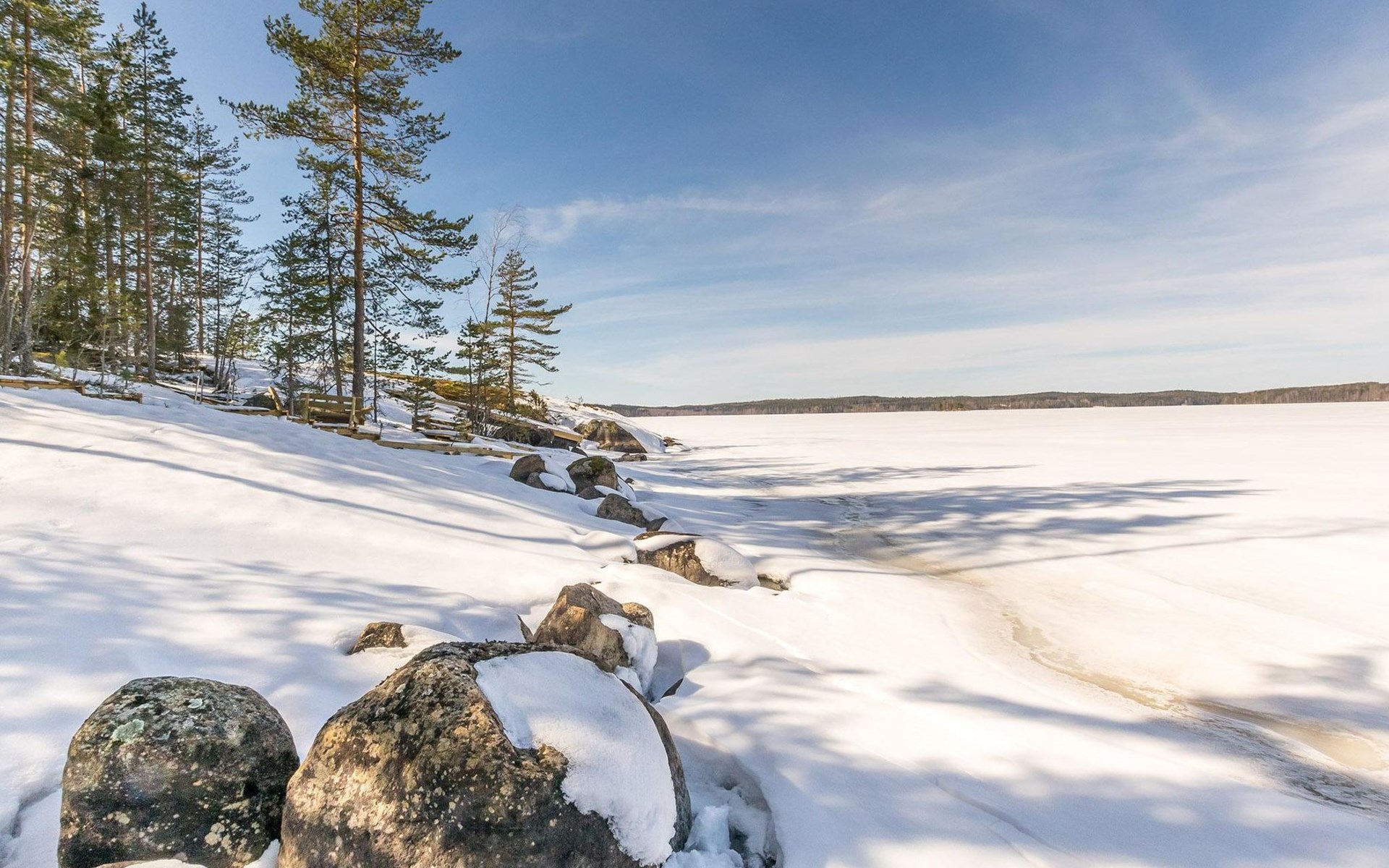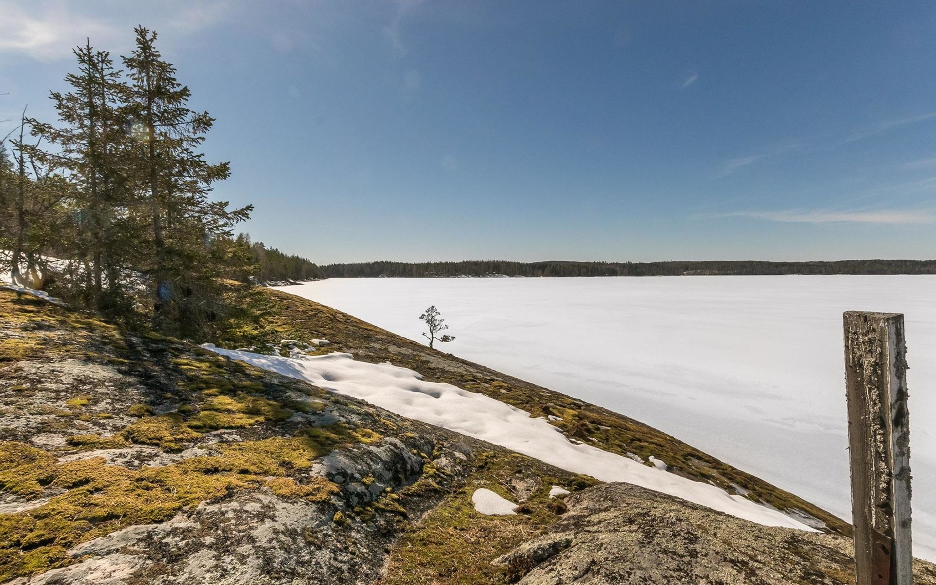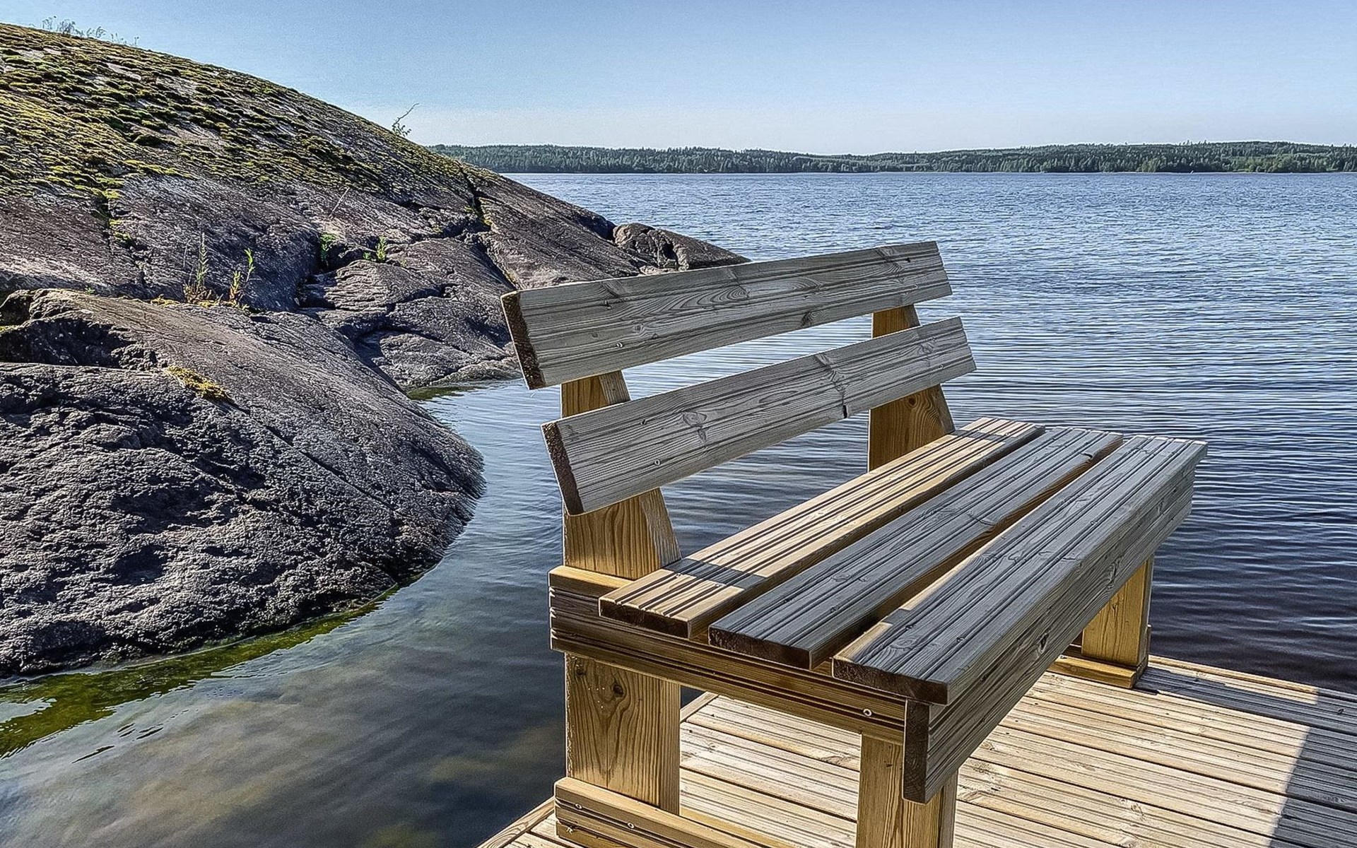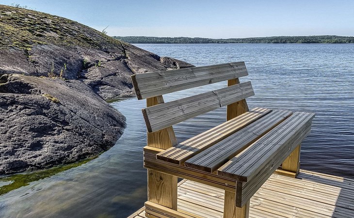 Separate lakeside sauna with electric light, steam room (wood-heated sauna stove), washroom (cold water from the lake with pumps for summer time, in addition to the wood heated water stew), dressing room with seats for four and wood-fired stove.
