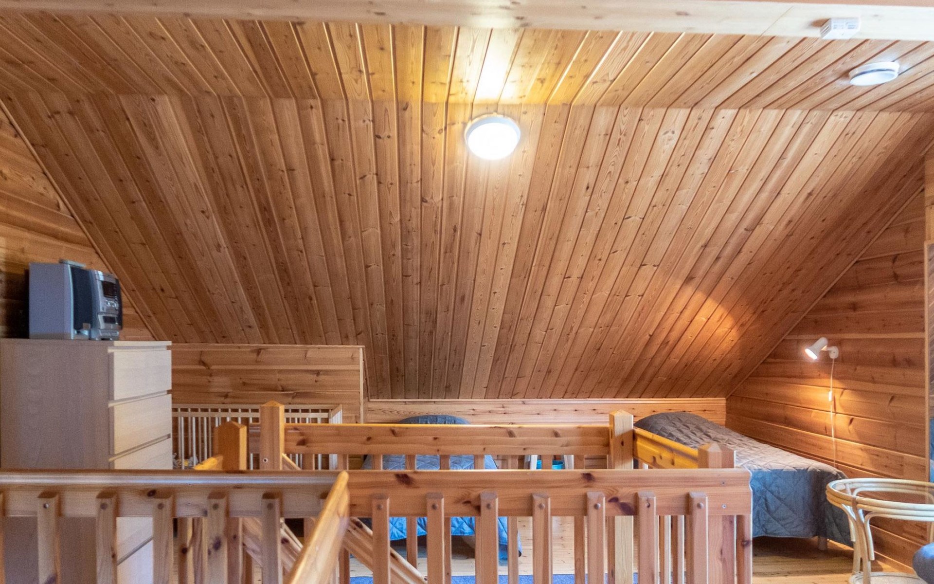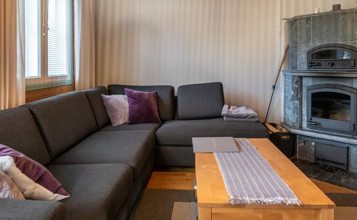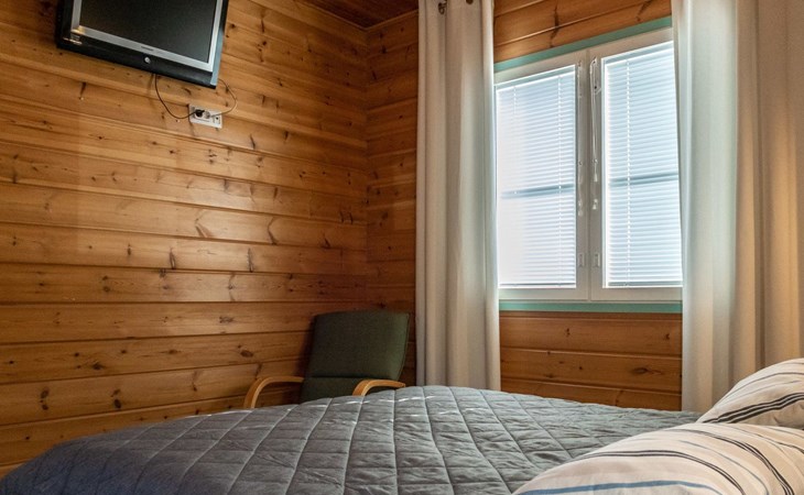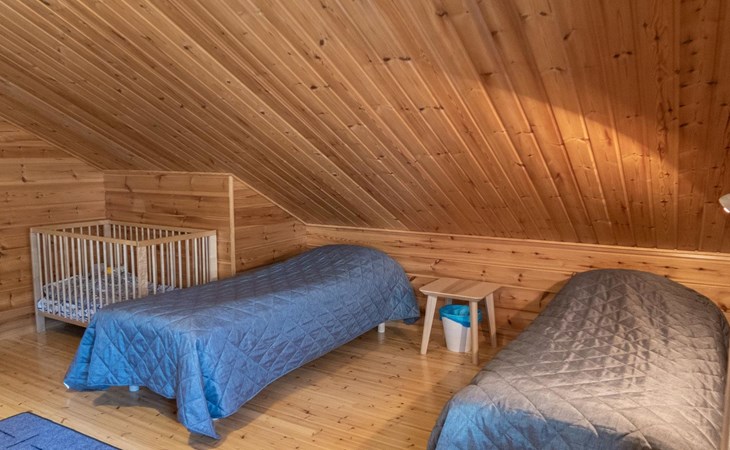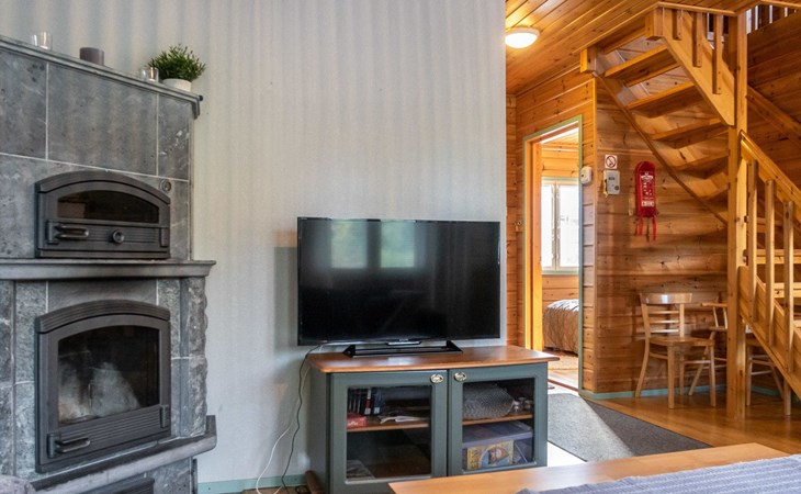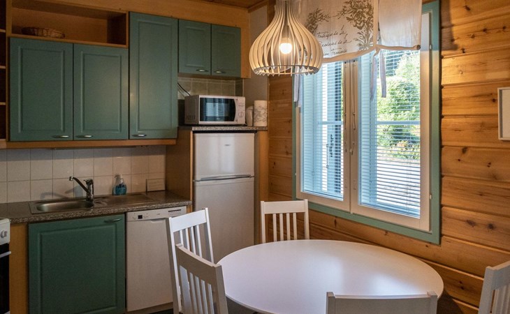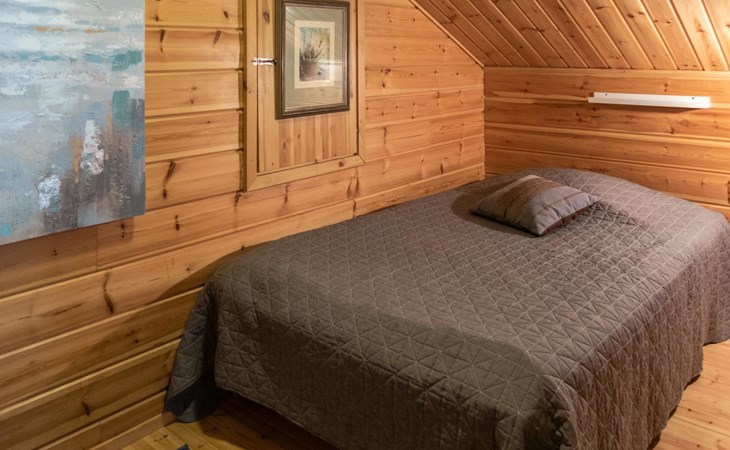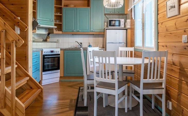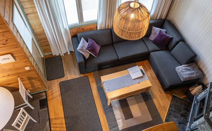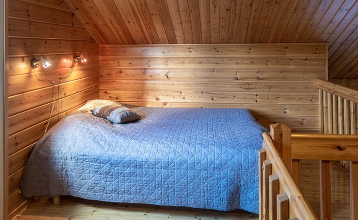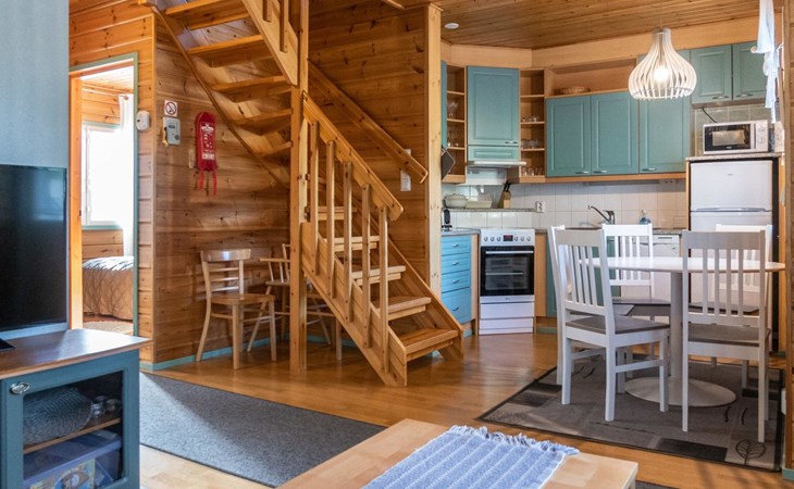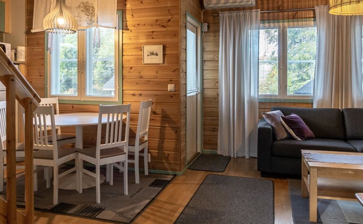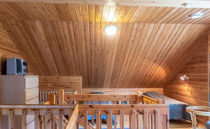 Floor area 60m², loft 35 m². On the ground floor there is combined living room & kitchen, one bedroom with twin bed, sauna (electric heating), washroom/toilet. Upstairs there is loft vestibule with separate beds for four and alcove with 120cm bed. Terrace with furniture.