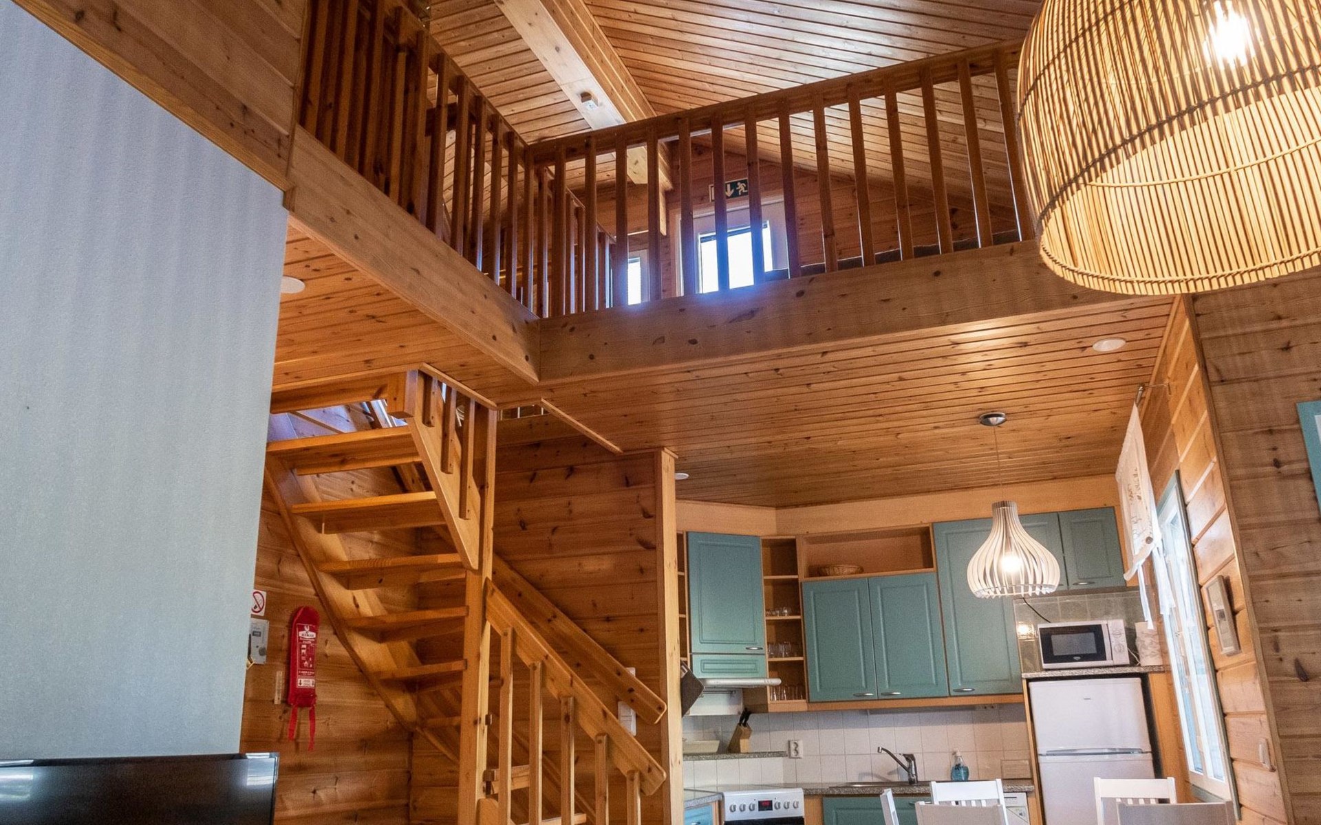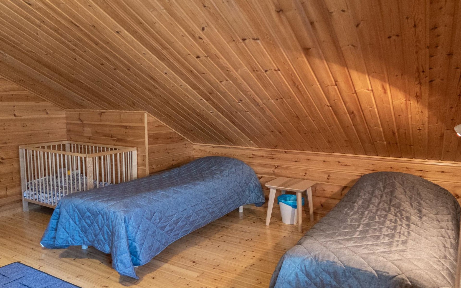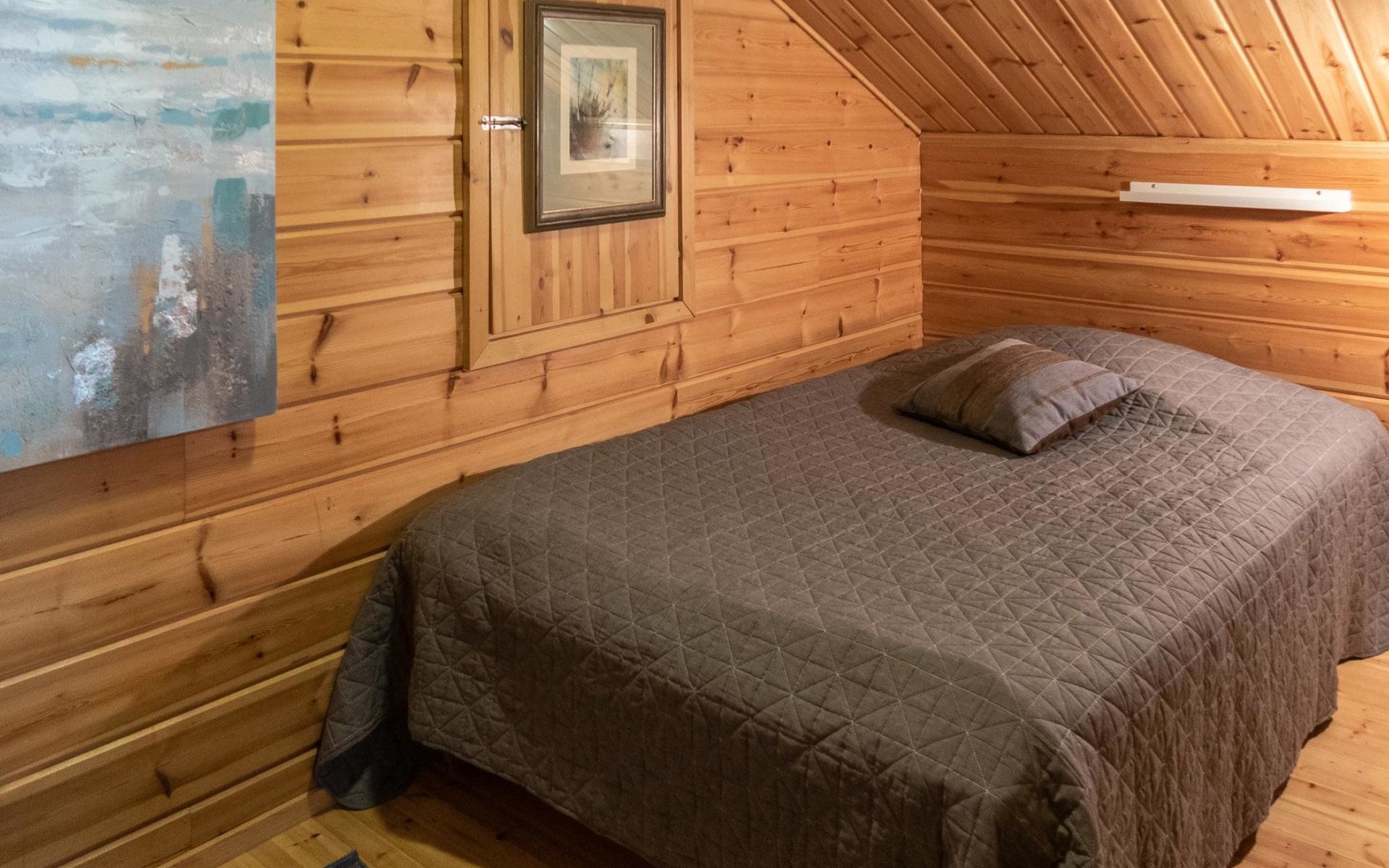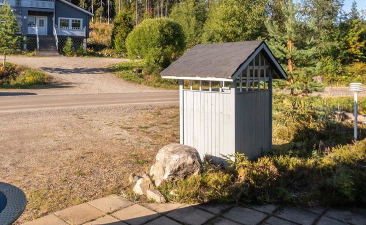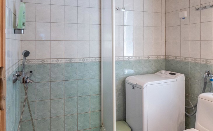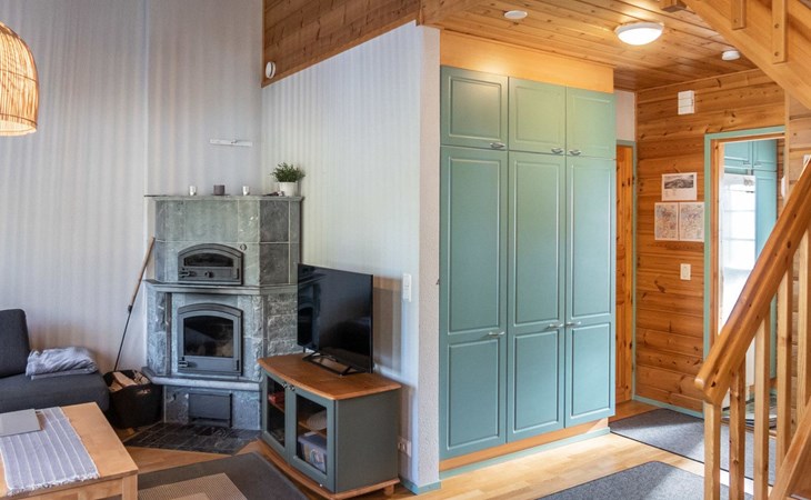 Floor area 60m², loft 35 m². On the ground floor there is combined living room & kitchen, one bedroom with twin bed, sauna (electric heating), washroom/toilet. Upstairs there is loft vestibule with separate beds for four and alcove with 120cm bed. Terrace with furniture.