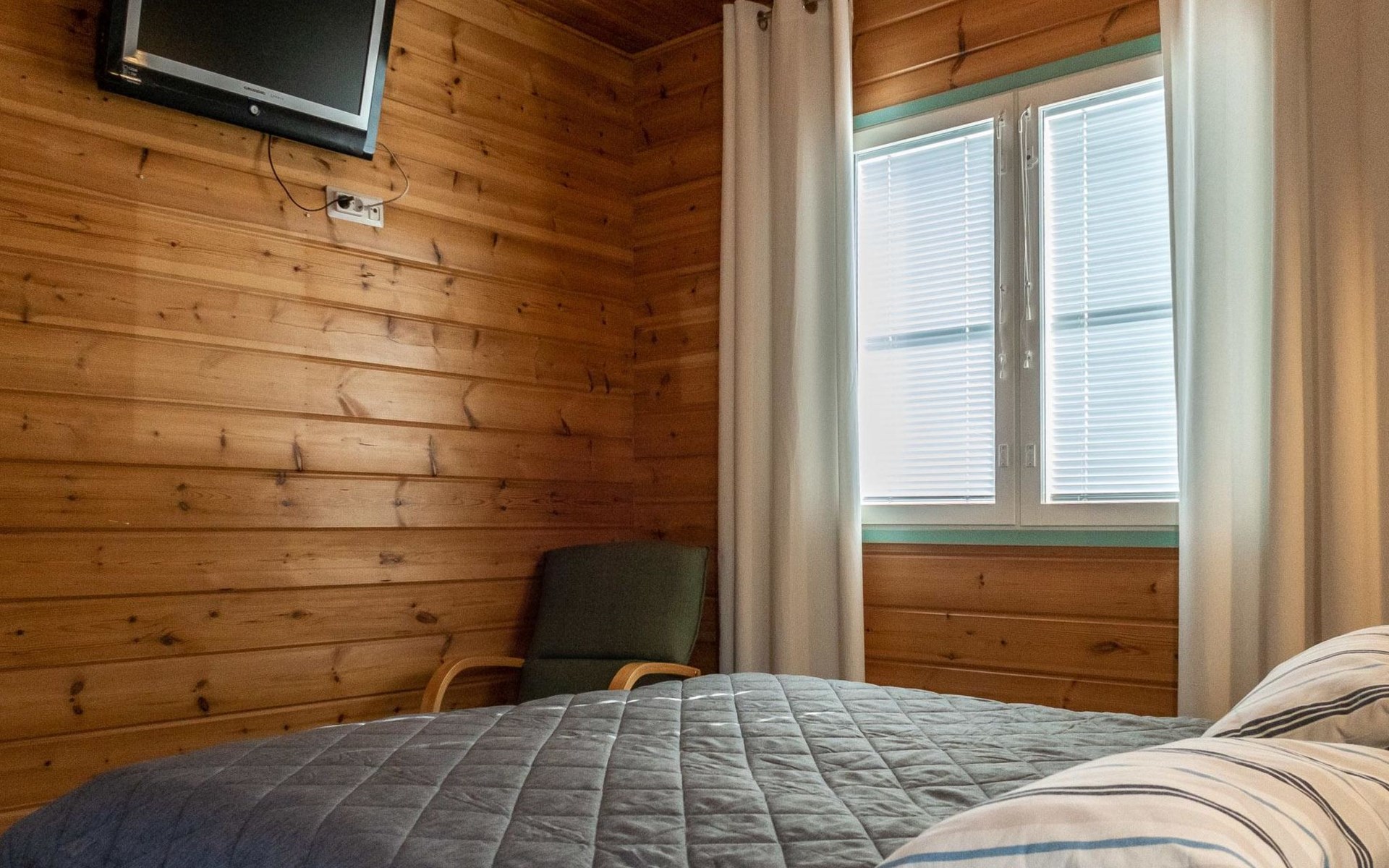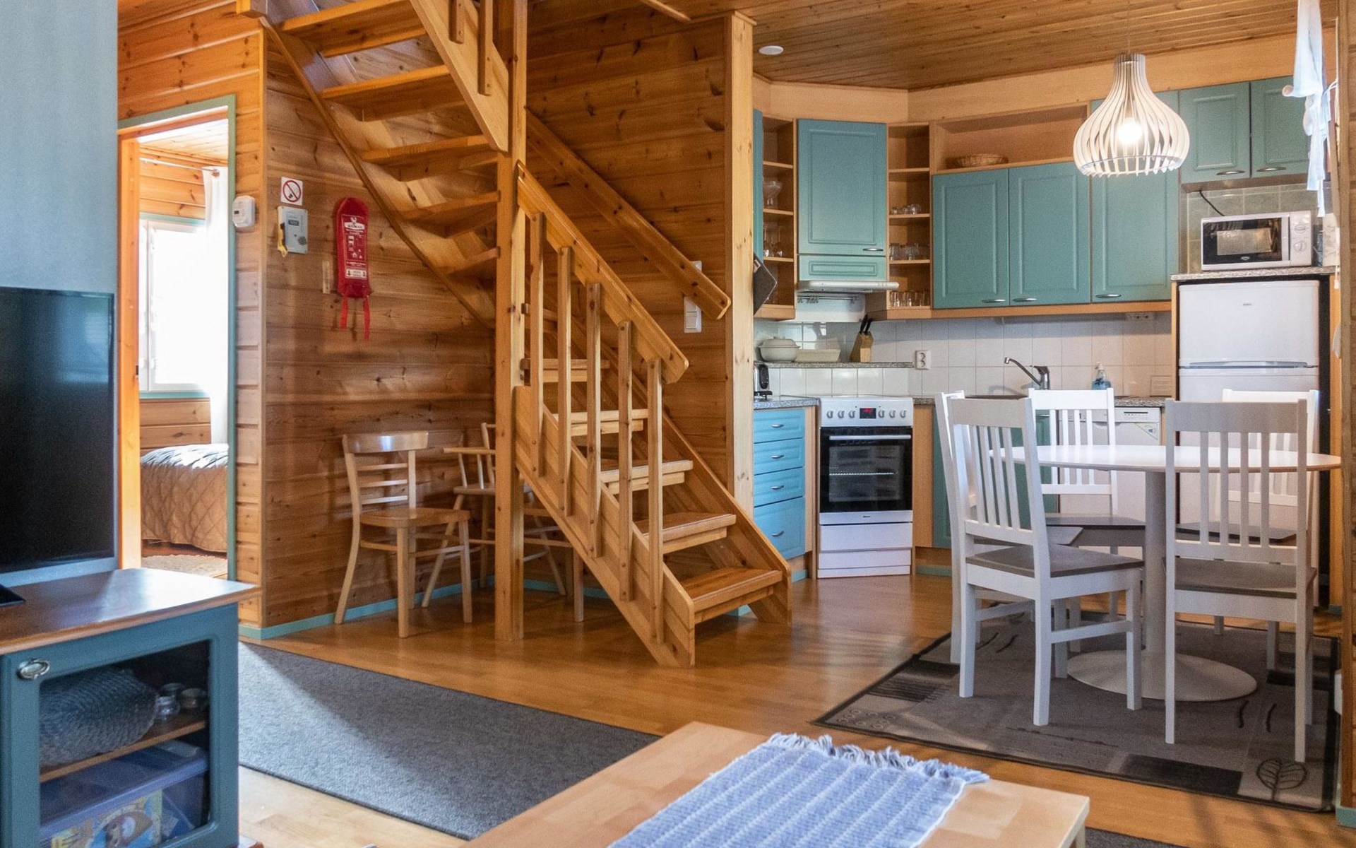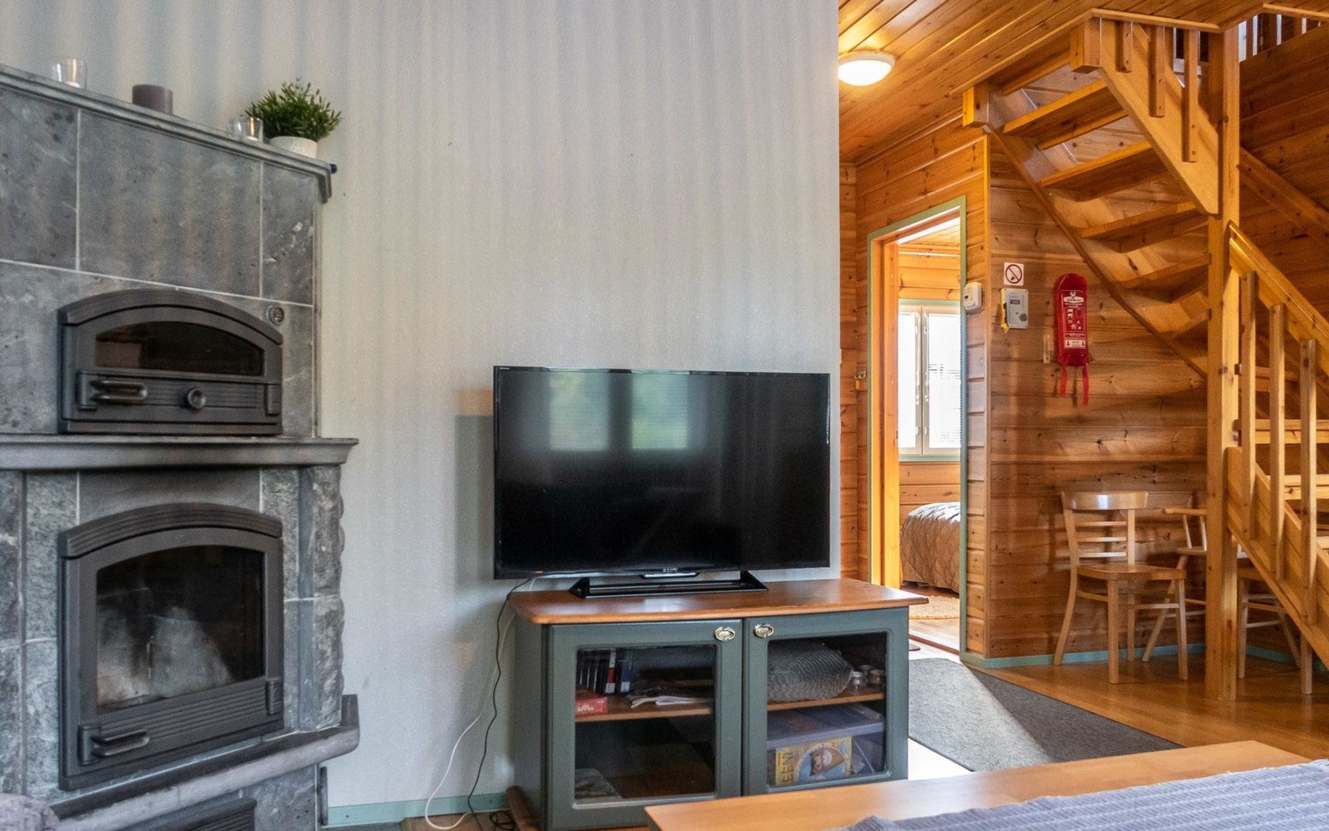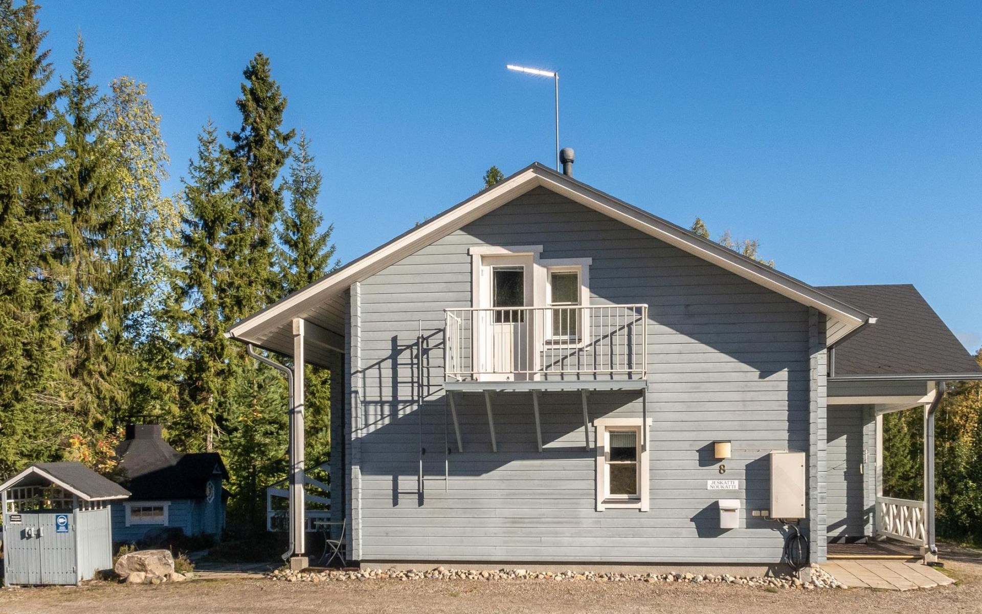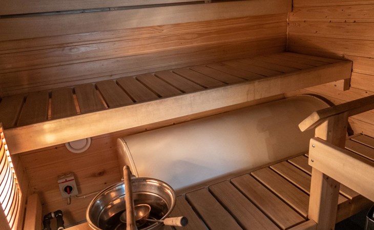 Floor area 60m², loft 35 m². On the ground floor there is combined living room & kitchen, one bedroom with twin bed, sauna (electric heating), washroom/toilet. Upstairs there is loft vestibule with separate beds for four and alcove with 120cm bed. Terrace with furniture.