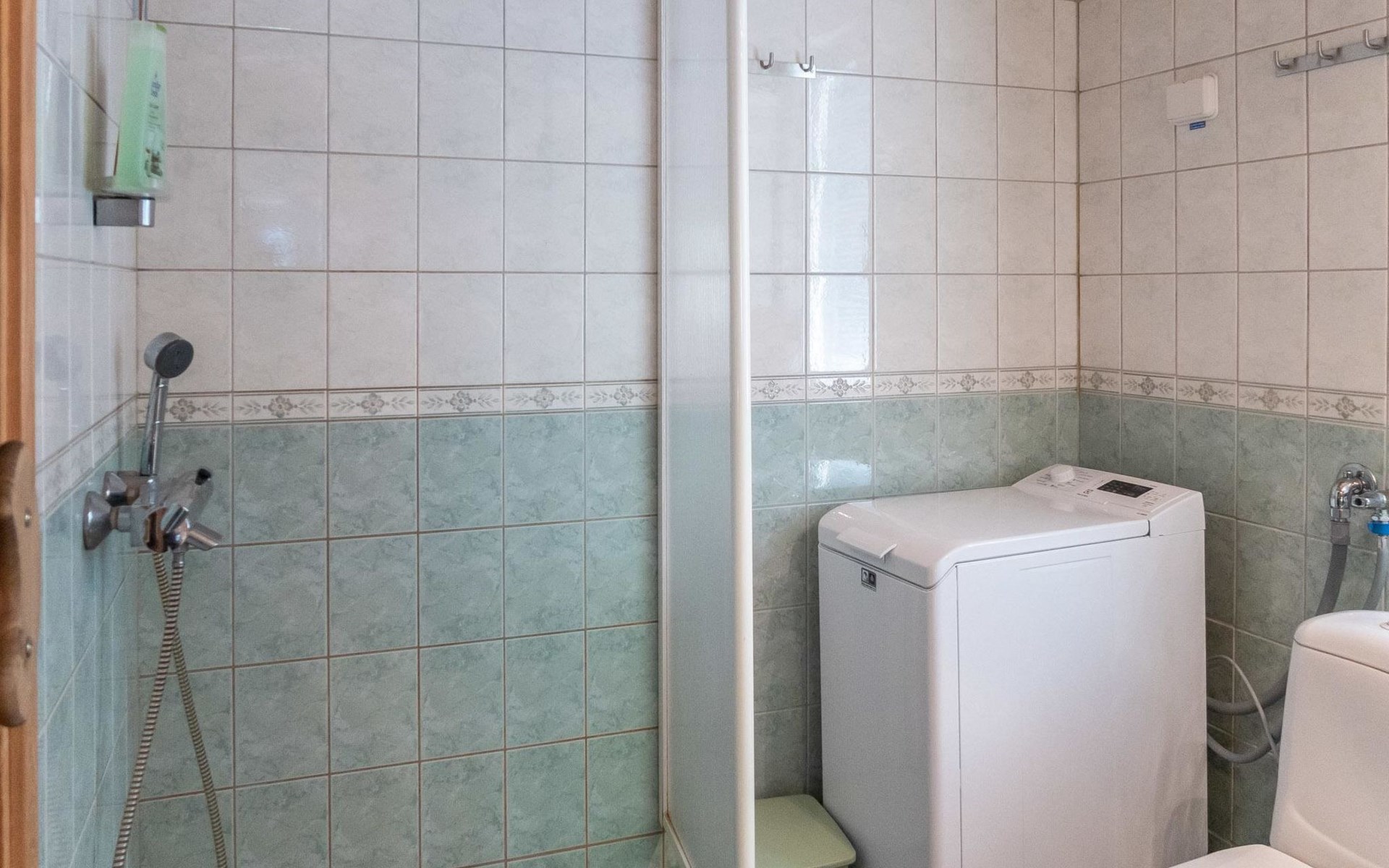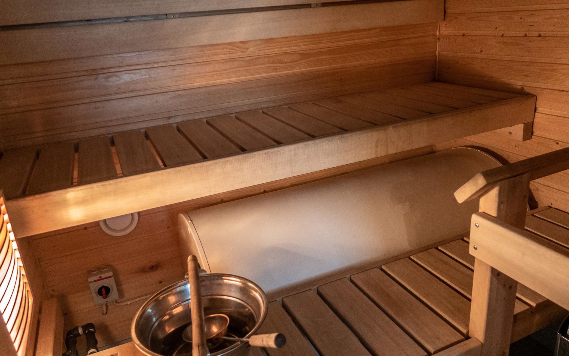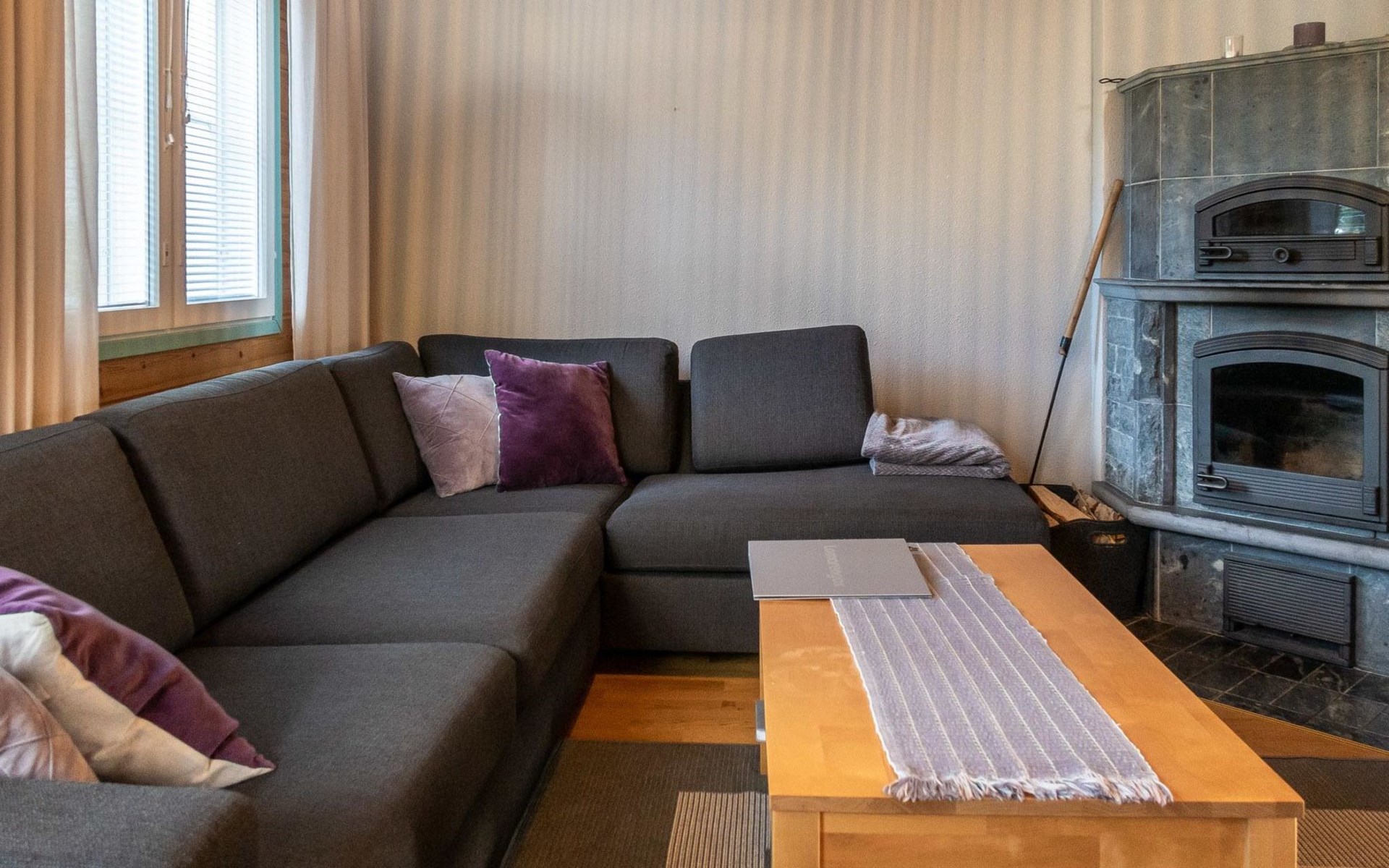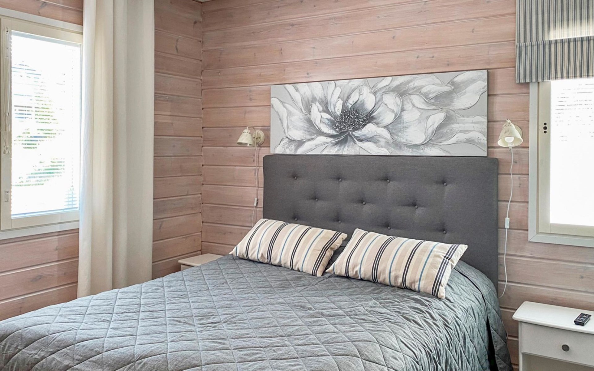 Floor area 60m², loft 35 m². On the ground floor there is combined living room & kitchen, one bedroom with twin bed, sauna (electric heating), washroom/toilet. Upstairs there is loft vestibule with separate beds for four and alcove with 120cm bed. Terrace with furniture.