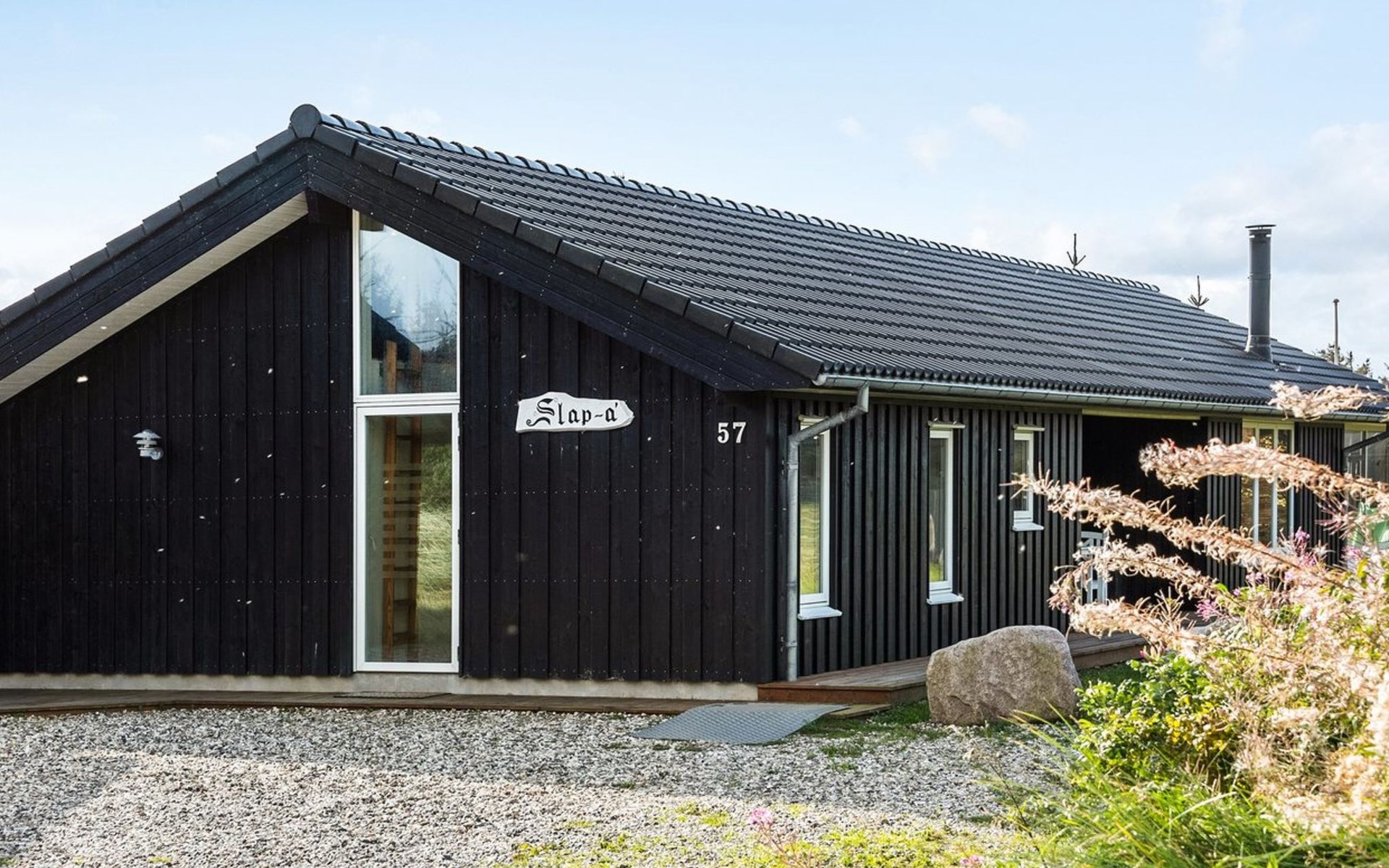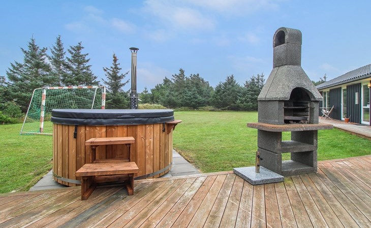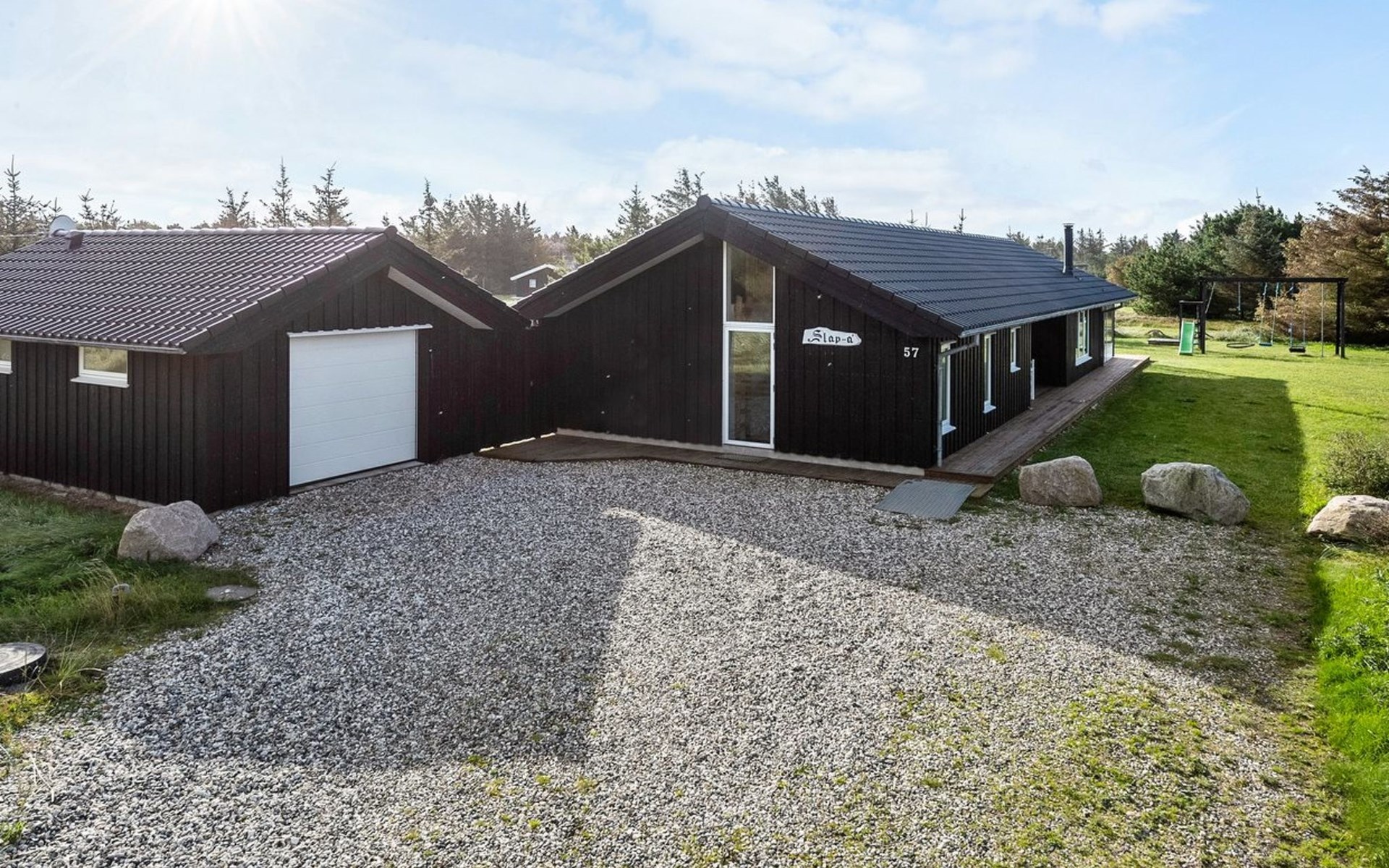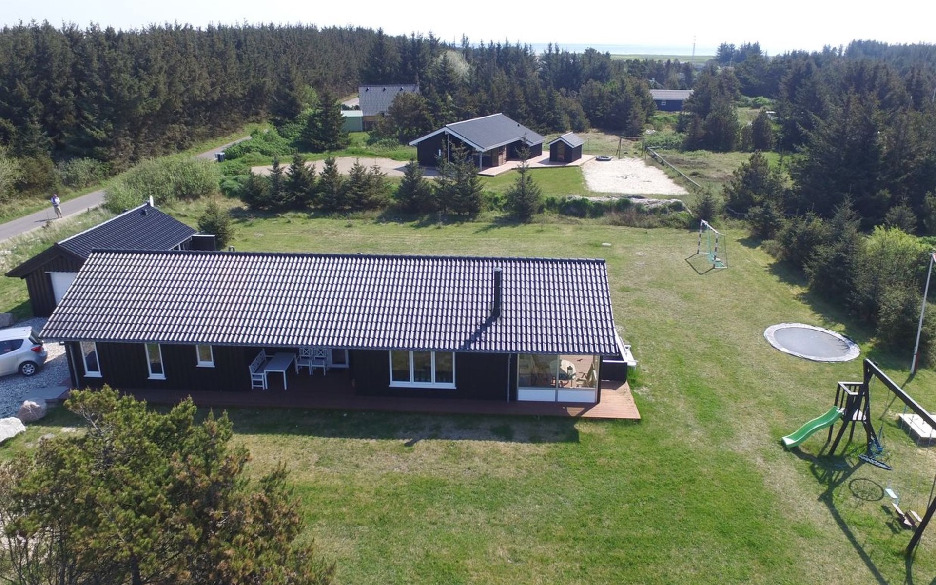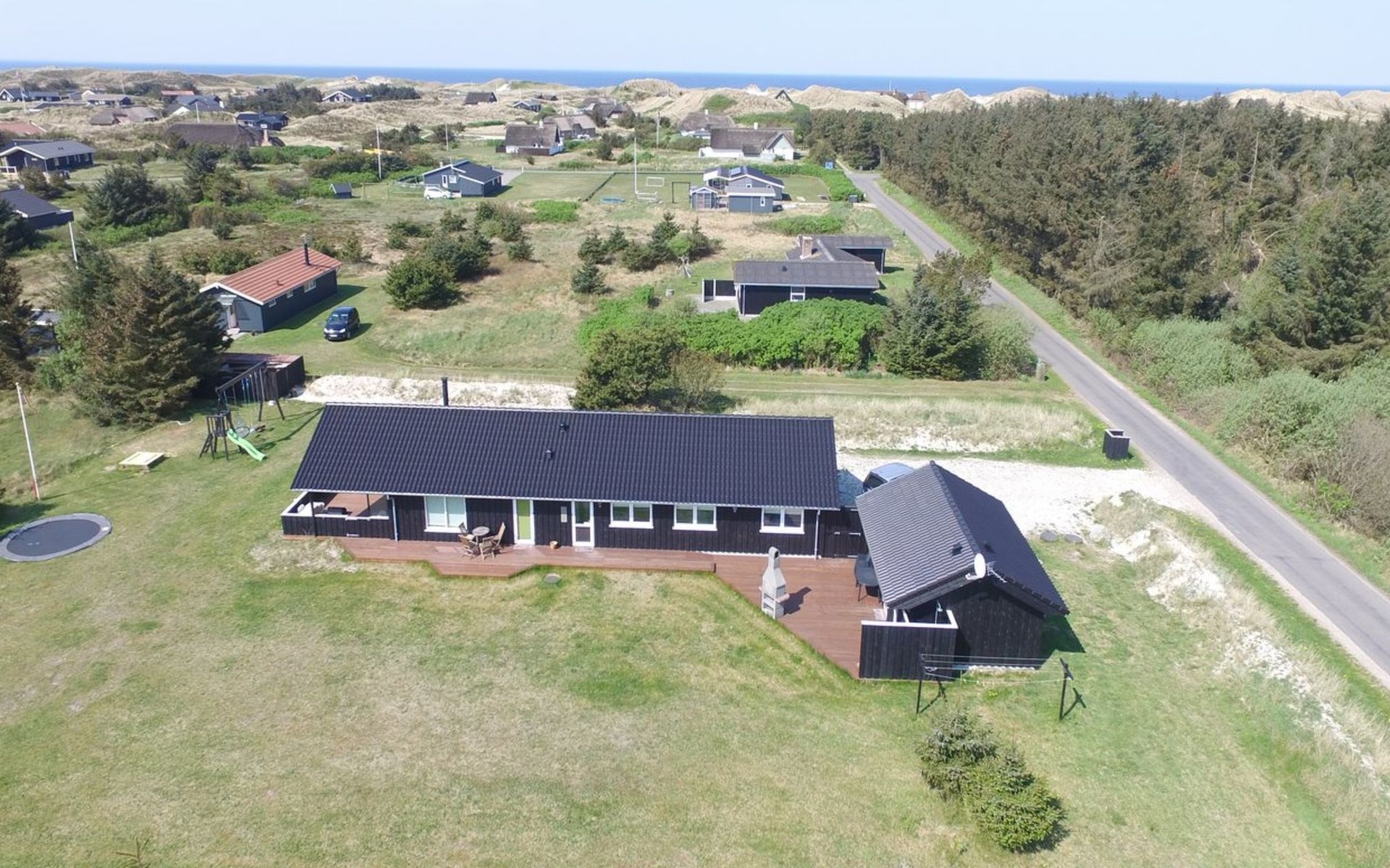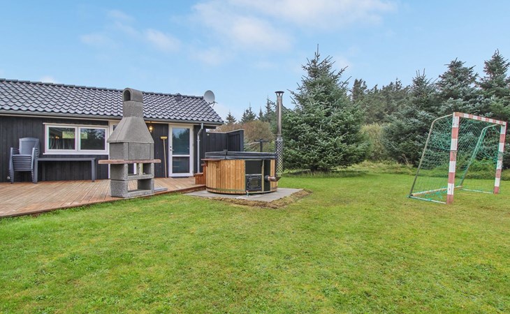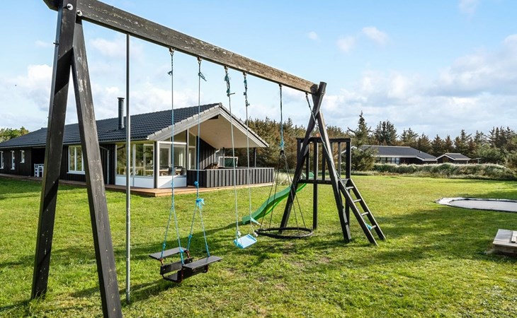 Single-family house, built in 2013. 600 m from the sea. Private: property 2'250 m2. Outdoor shower, terrace (90 m2), barbecue, fireplace, children's playground (slide, swing). In the house: sauna, table football, trampoline, washing machine, tumble dryer. Parking at the house. E-charging station. Grocery 1.5 km. The owner does not accept any youth groups.