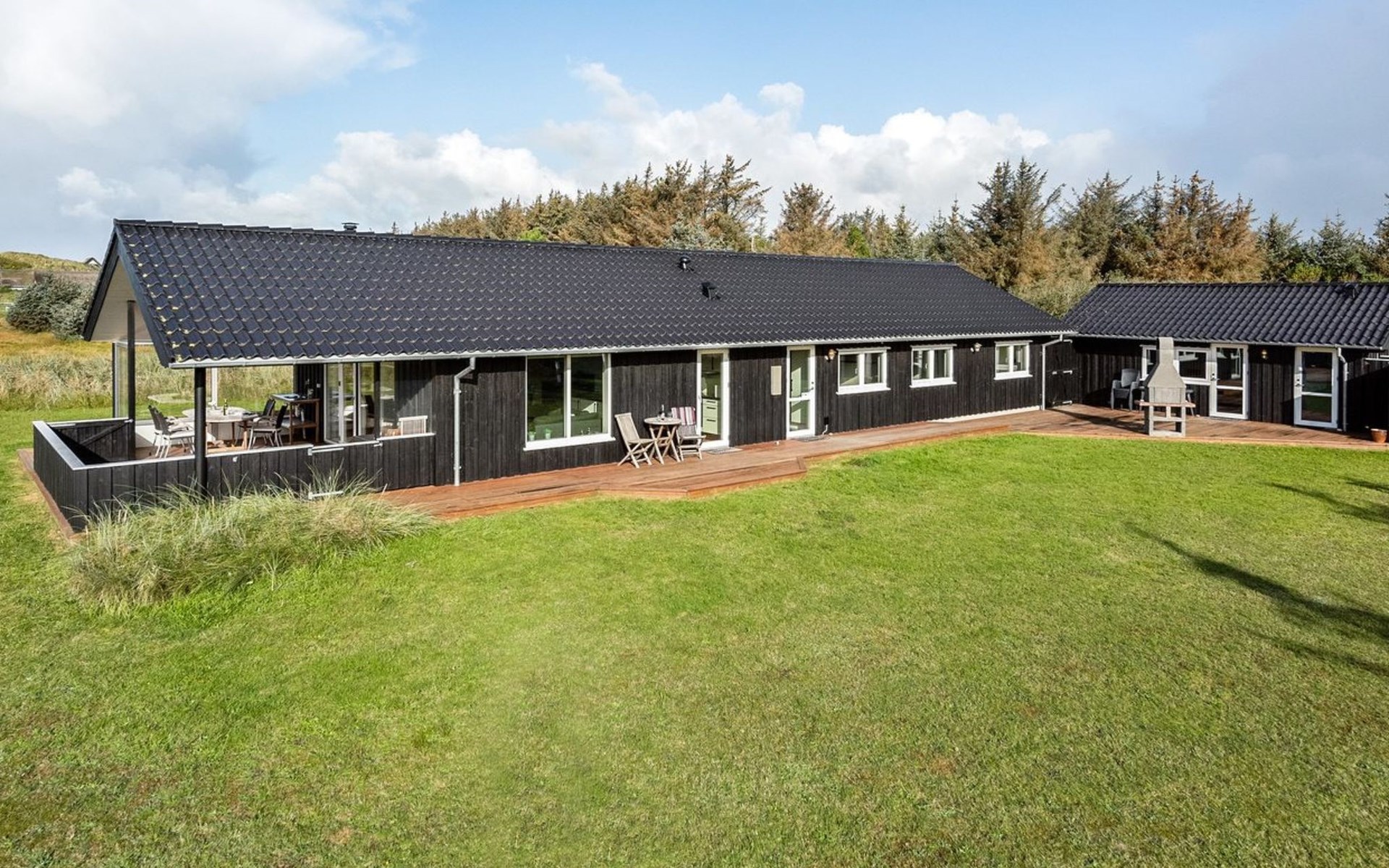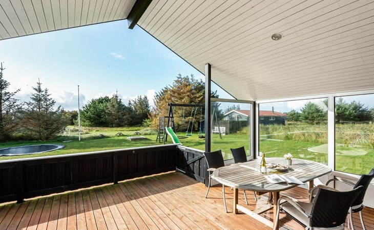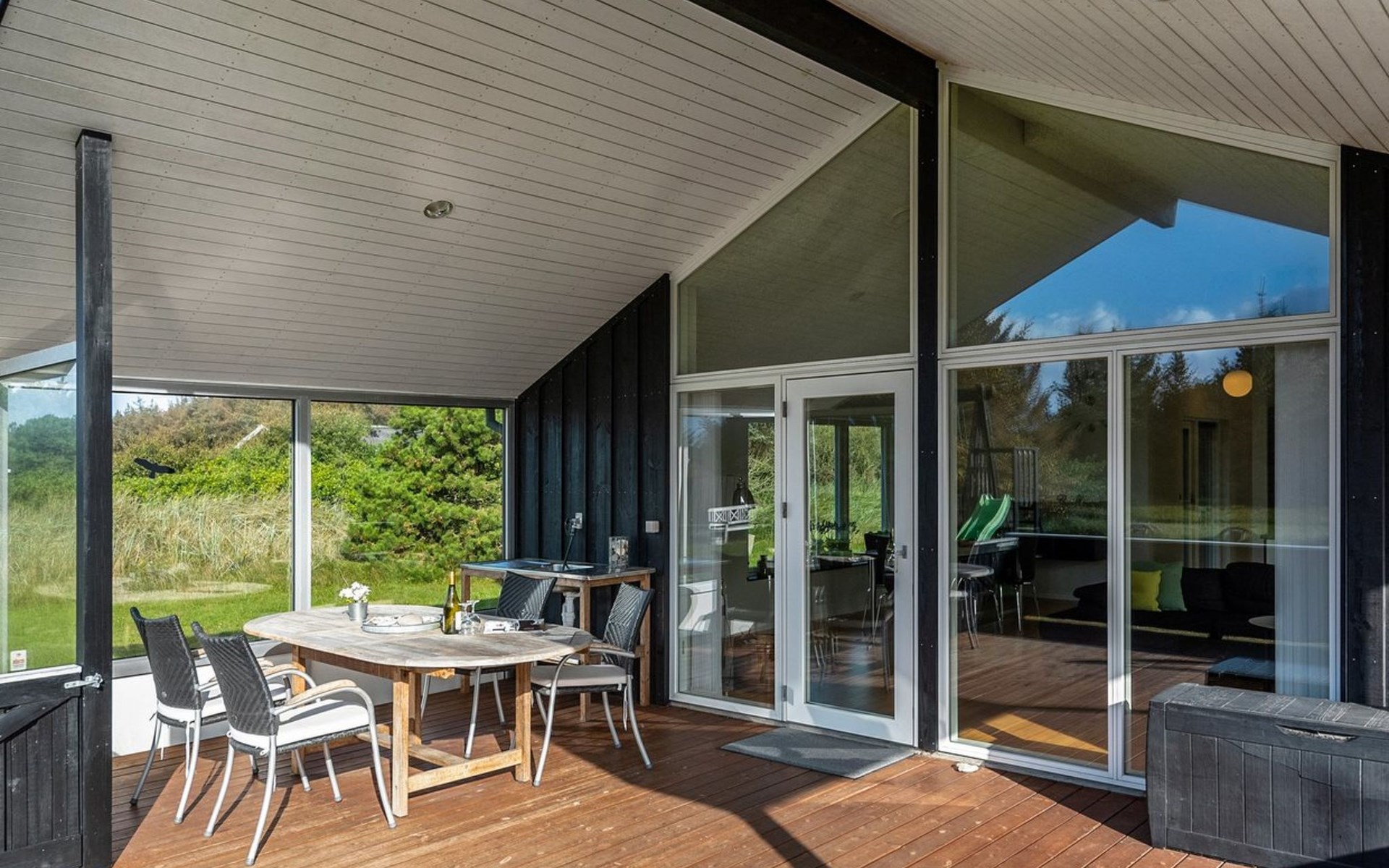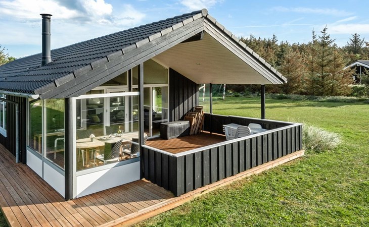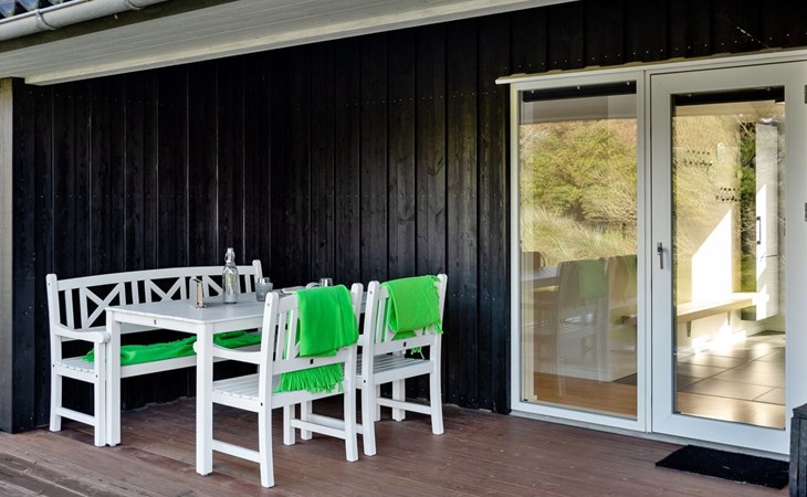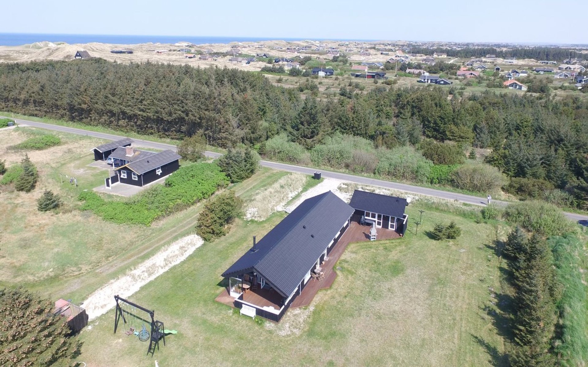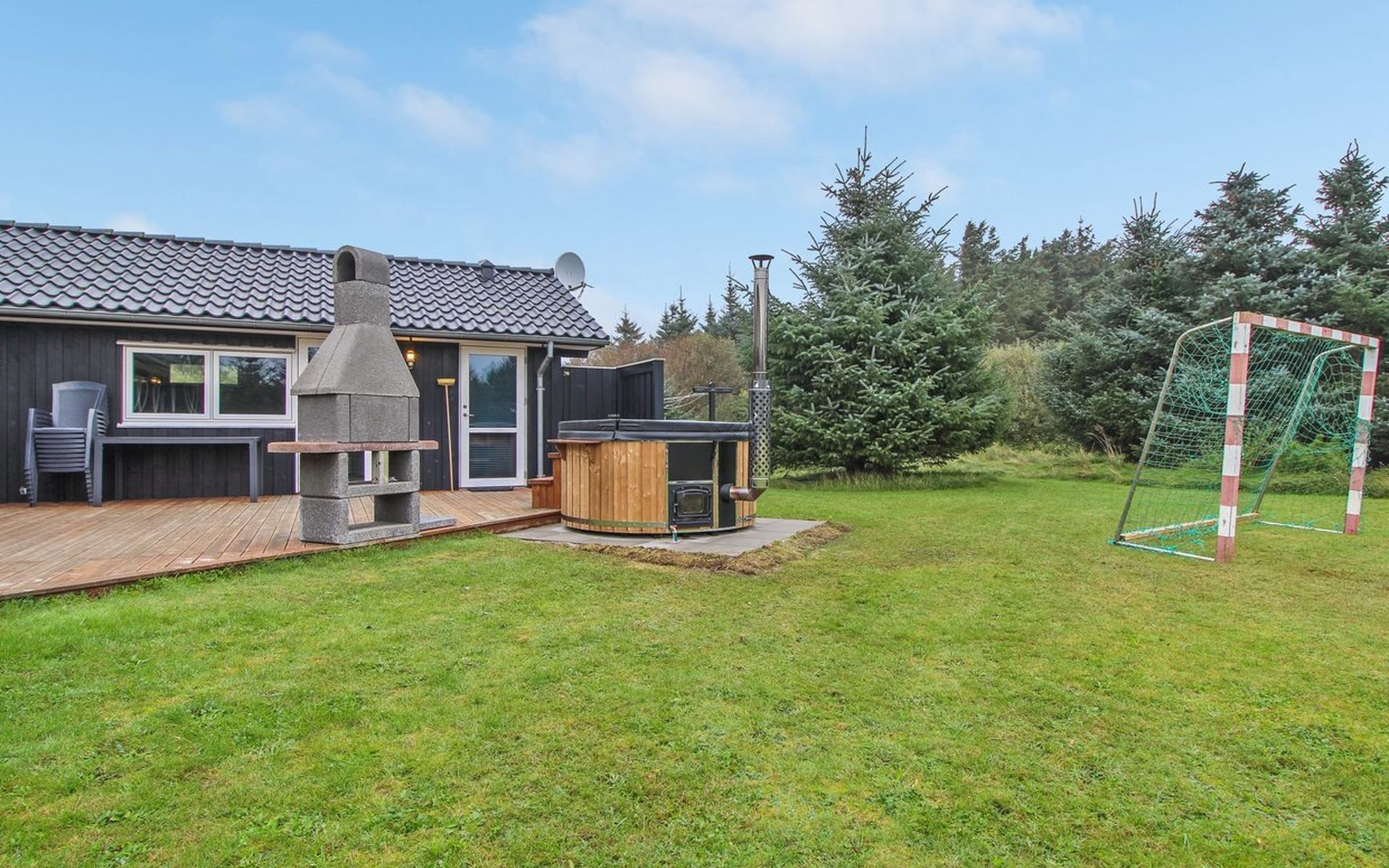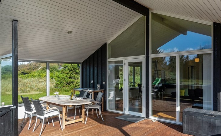Single-family house, built in 2013. 600 m from the sea. Private: property 2'250 m2. Outdoor shower, terrace (90 m2), barbecue, fireplace, children's playground (slide, swing). In the house: sauna, table football, trampoline, washing machine, tumble dryer. Parking at the house. E-charging station. Grocery 1.5 km. The owner does not accept any youth groups.