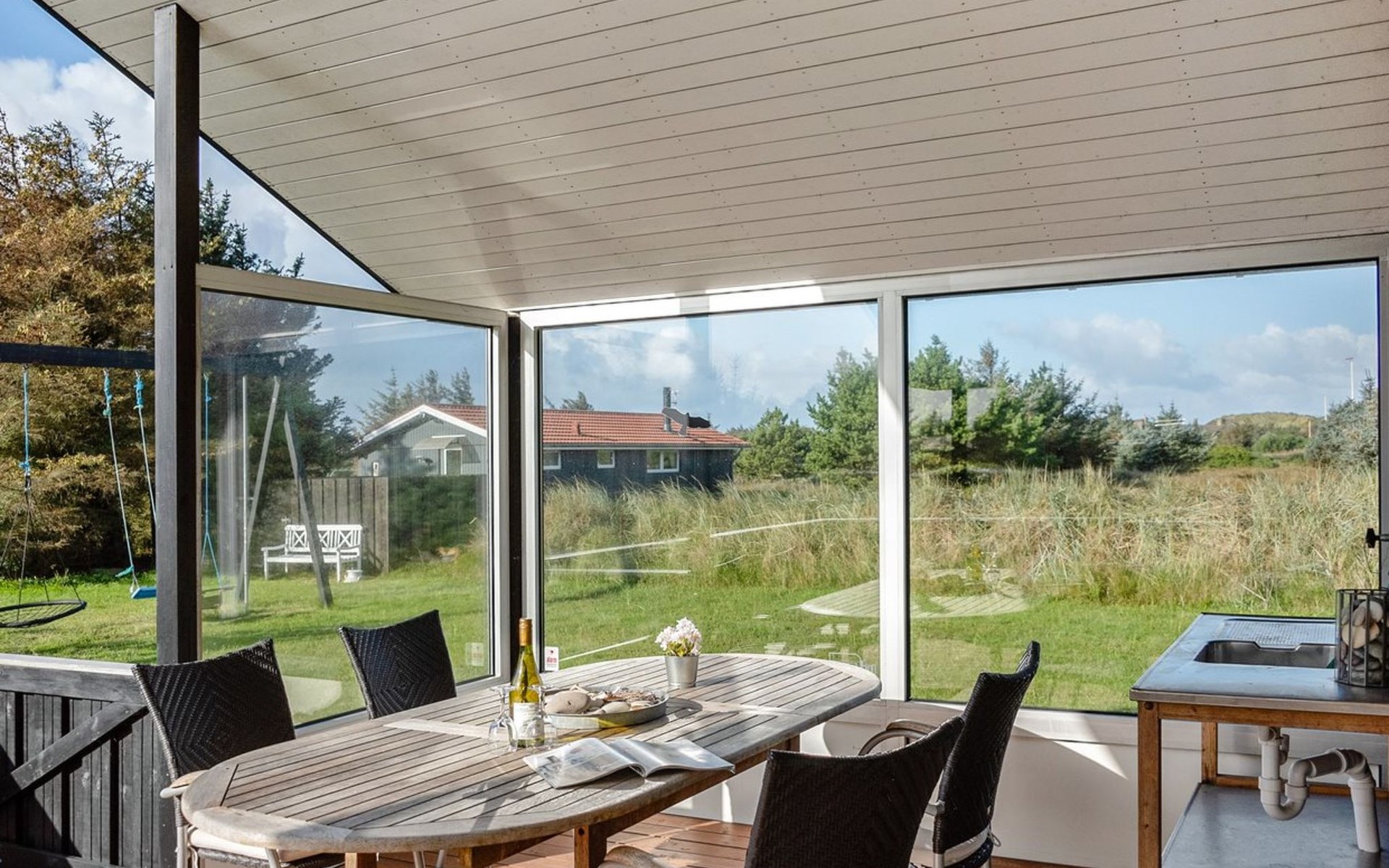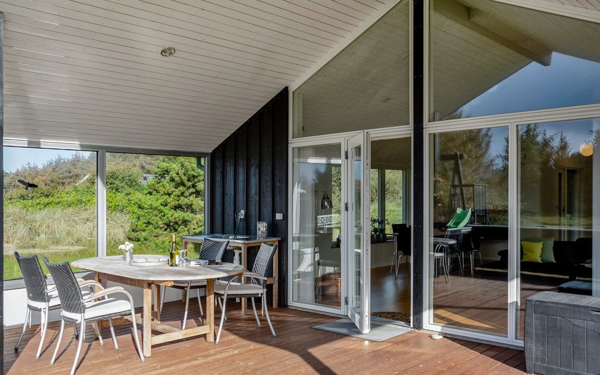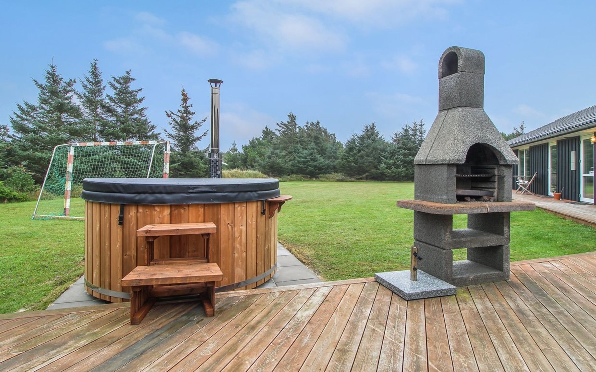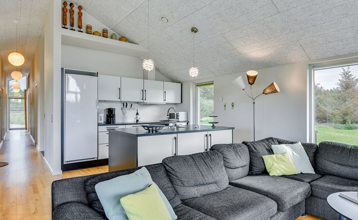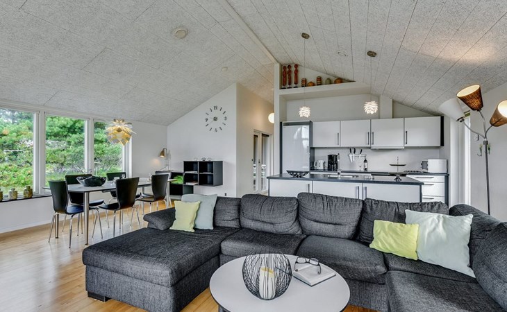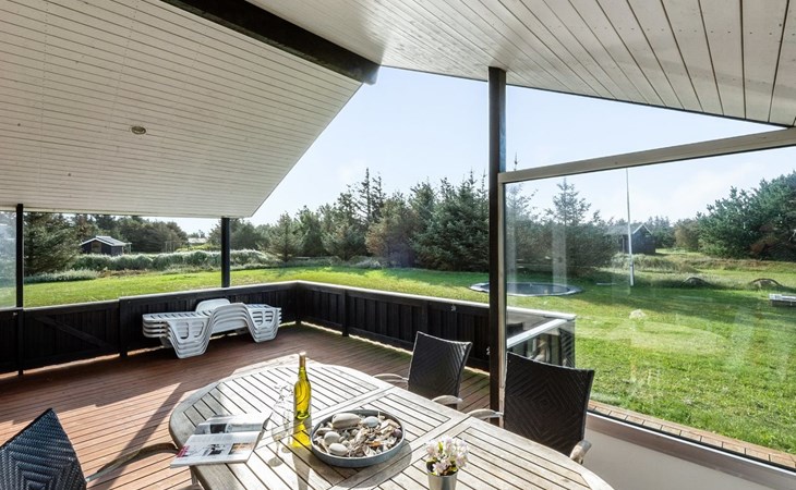 Single-family house, built in 2013. 600 m from the sea. Private: property 2'250 m2. Outdoor shower, terrace (90 m2), barbecue, fireplace, children's playground (slide, swing). In the house: sauna, table football, trampoline, washing machine, tumble dryer. Parking at the house. E-charging station. Grocery 1.5 km. The owner does not accept any youth groups.