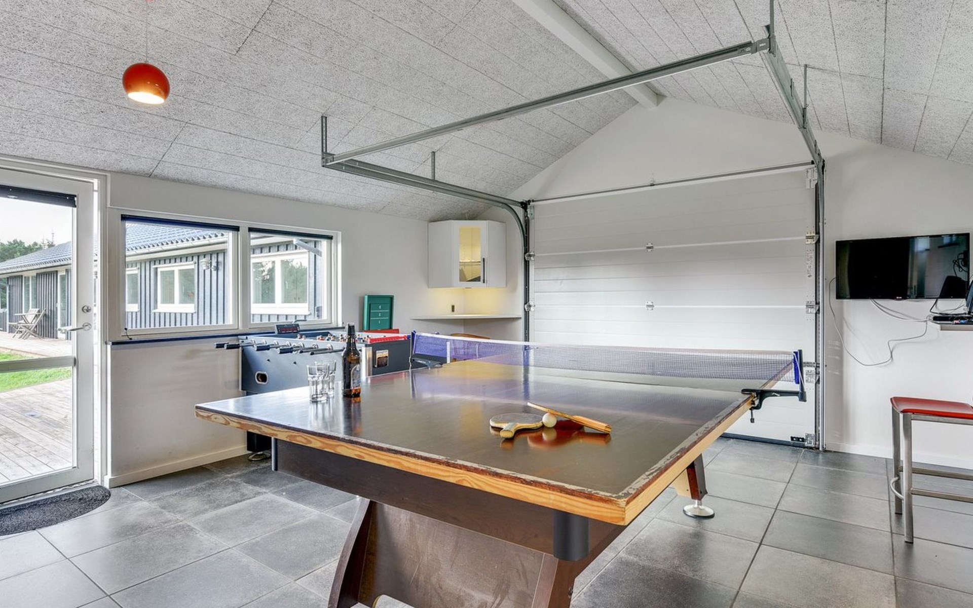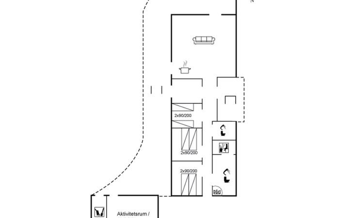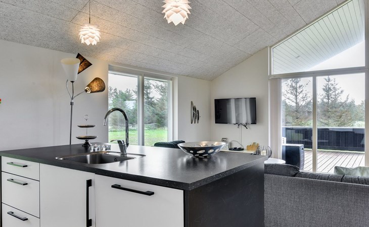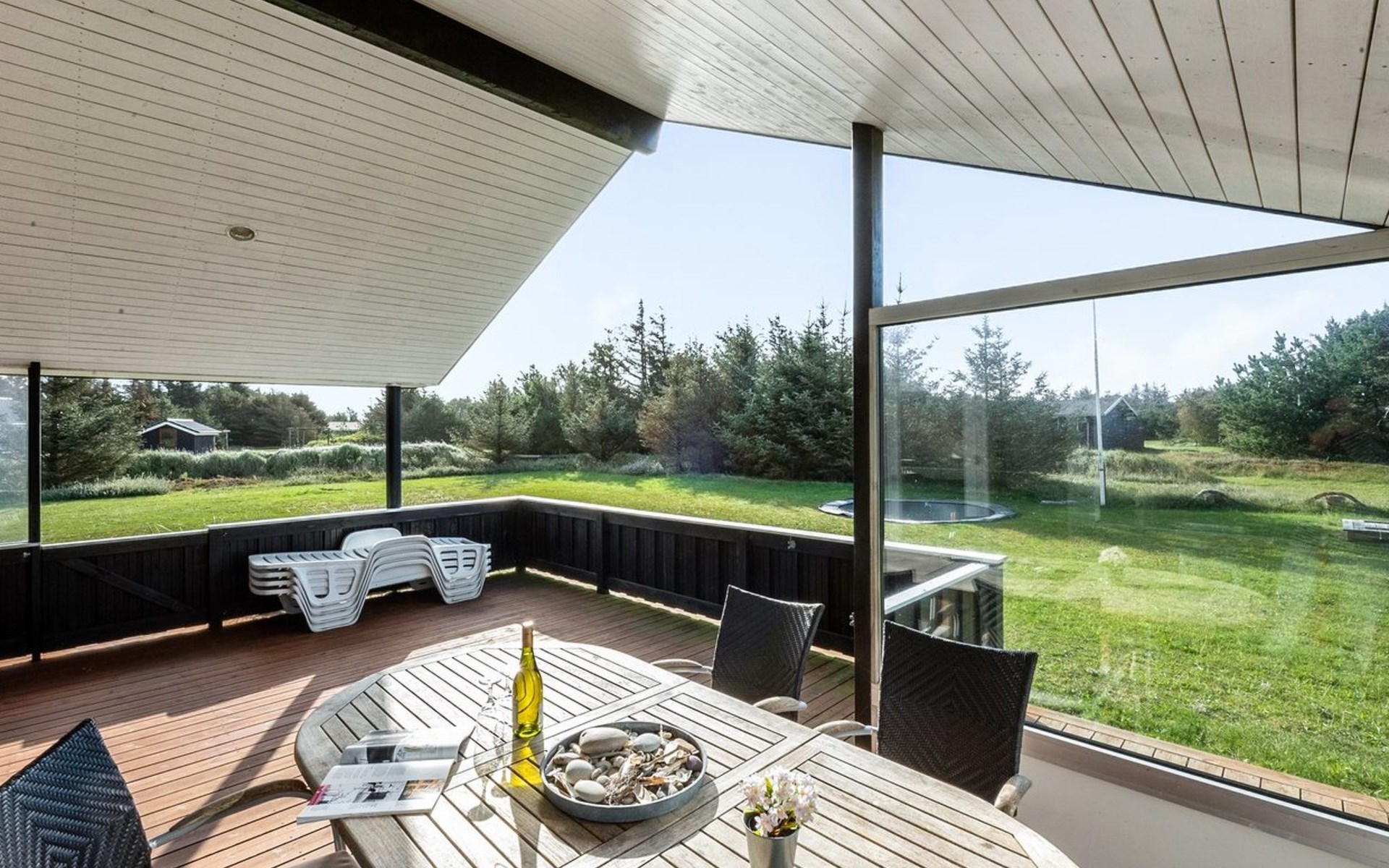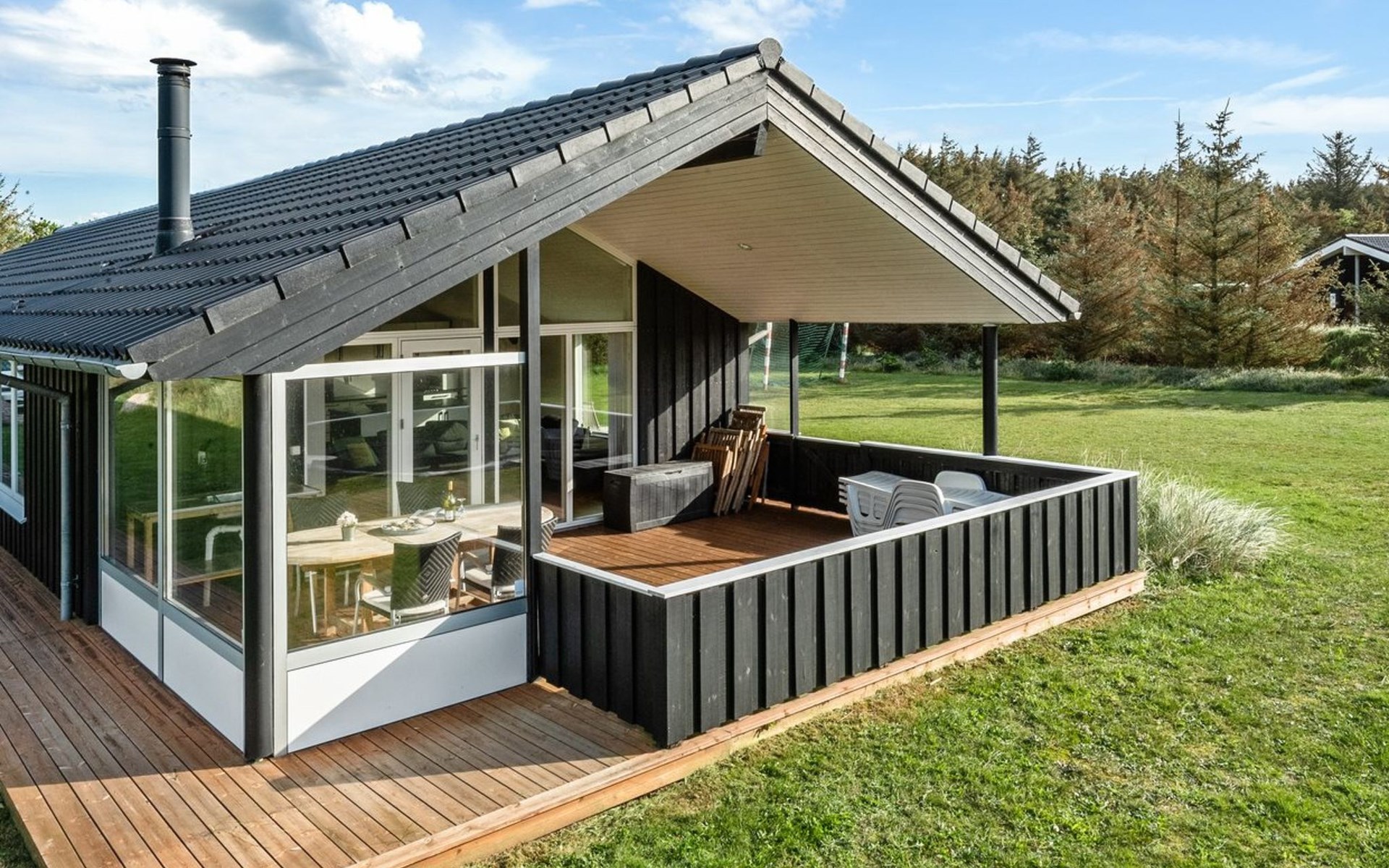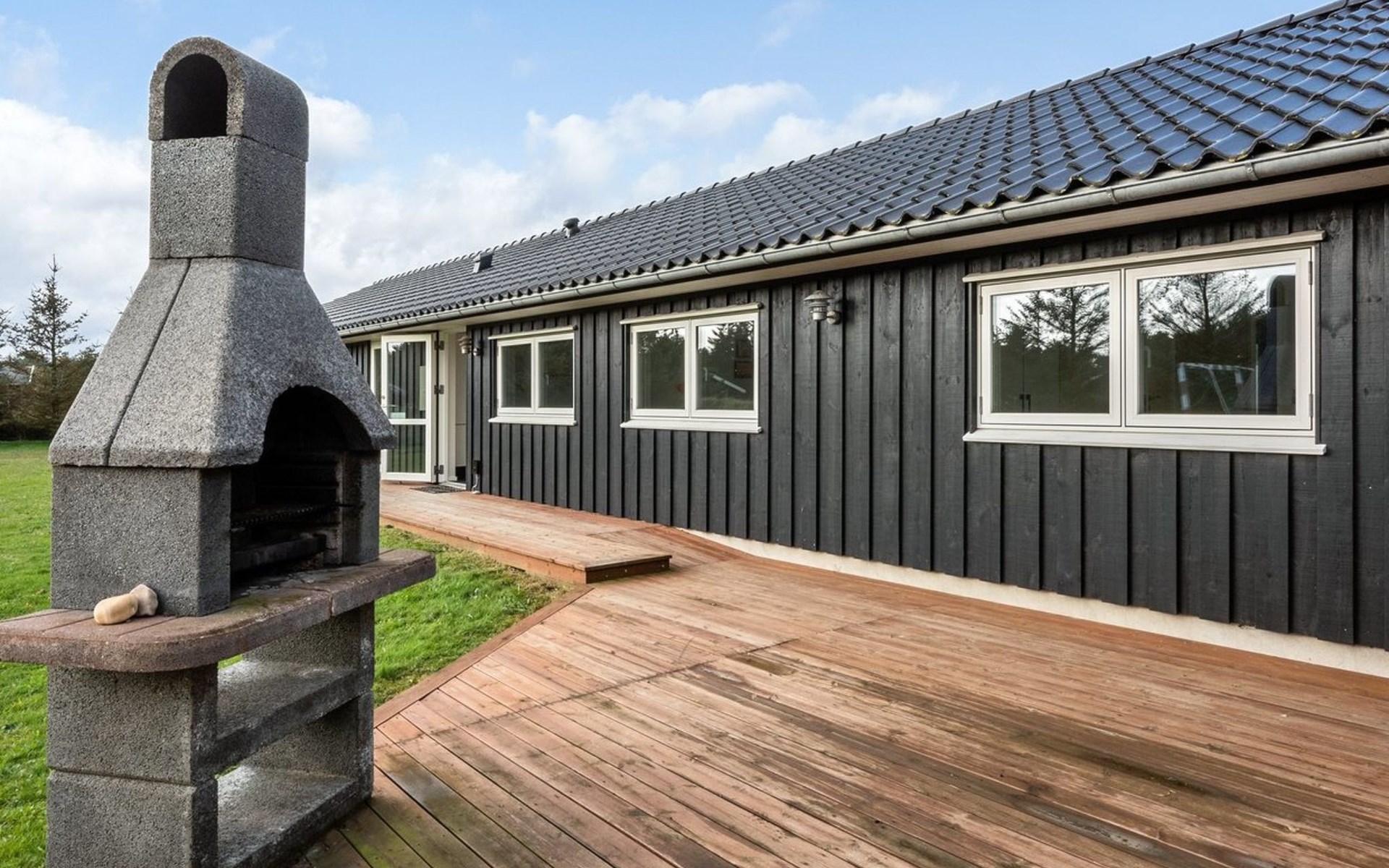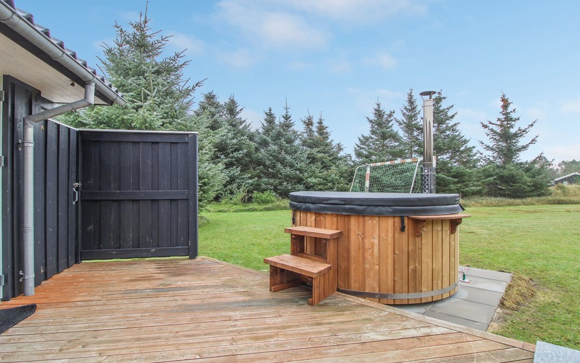 Single-family house, built in 2013. 600 m from the sea. Private: property 2'250 m2. Outdoor shower, terrace (90 m2), barbecue, fireplace, children's playground (slide, swing). In the house: sauna, table football, trampoline, washing machine, tumble dryer. Parking at the house. E-charging station. Grocery 1.5 km. The owner does not accept any youth groups.