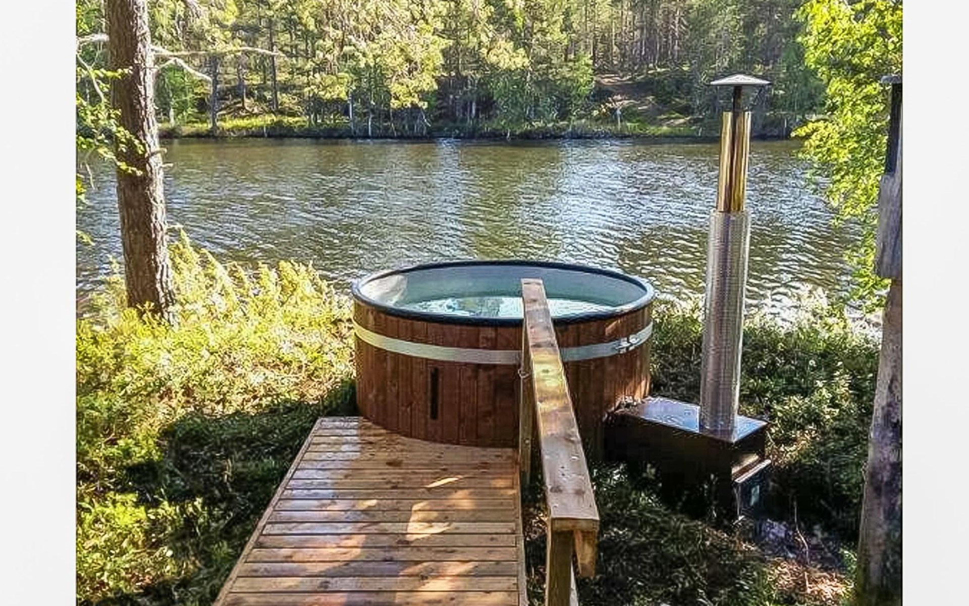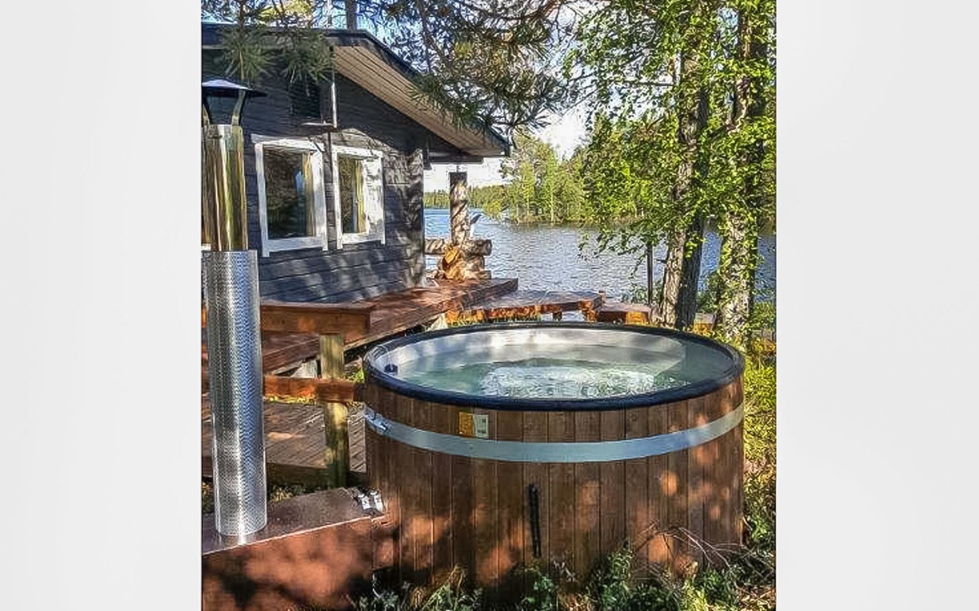 Hot tub which can be used throughout the year. Use of hot tub is included in the price (client fills up, heats and cleans the tub). For additional fee it's possible to have caretaker to take care of filling and heating. During winter possibility for ice dipping (winter swimming) in the lake.