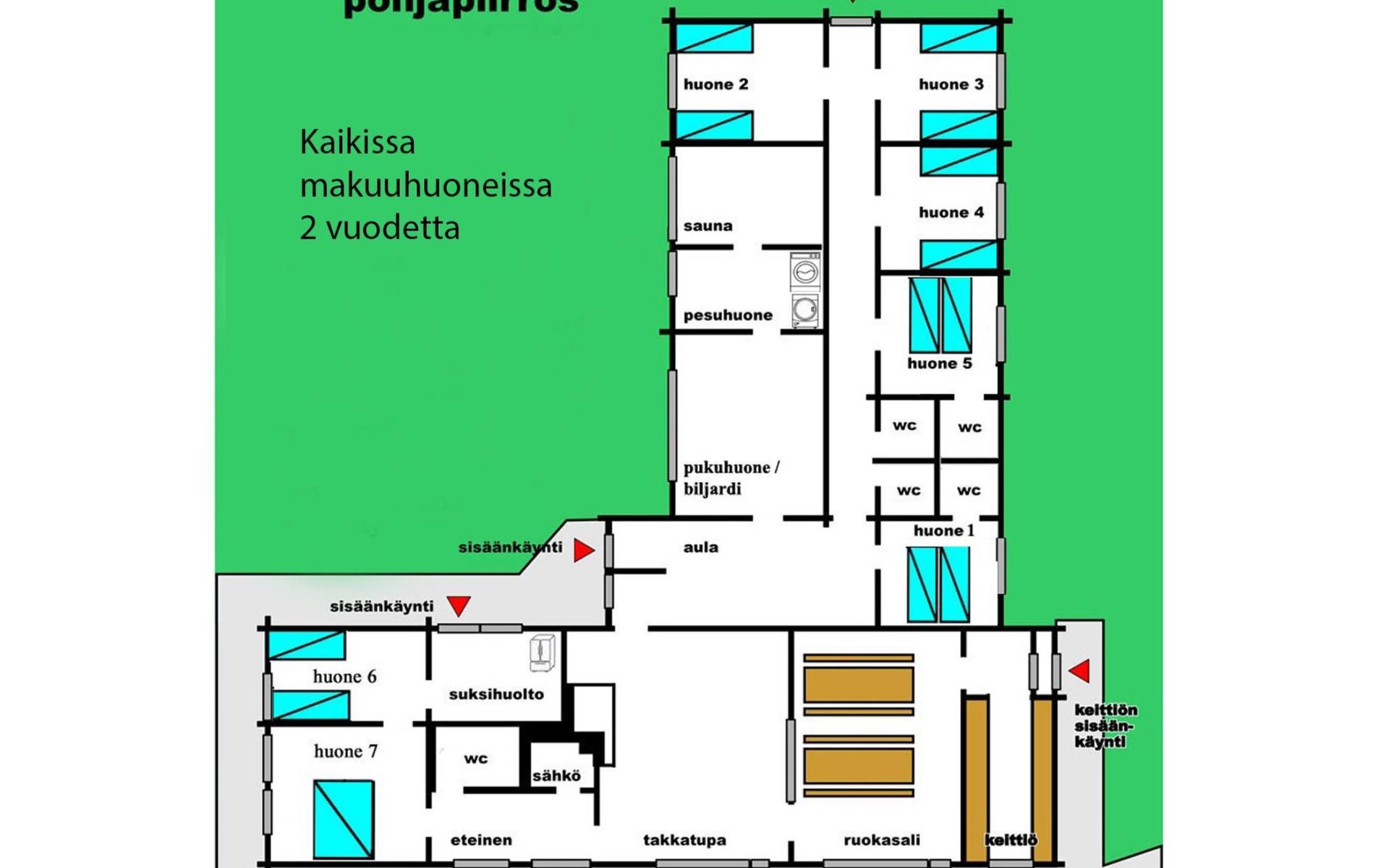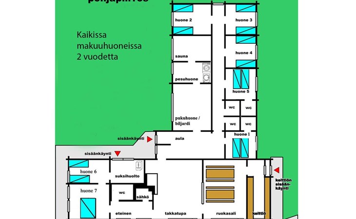 Cottage has 7 bedrooms, all with 2 beds. Livingroom, kitchen, electric sauna. Wi-Fi available in the main cottage.