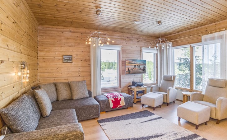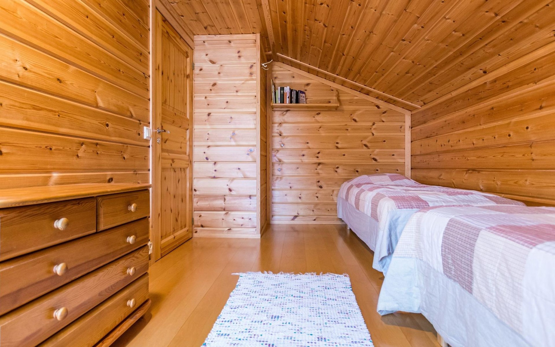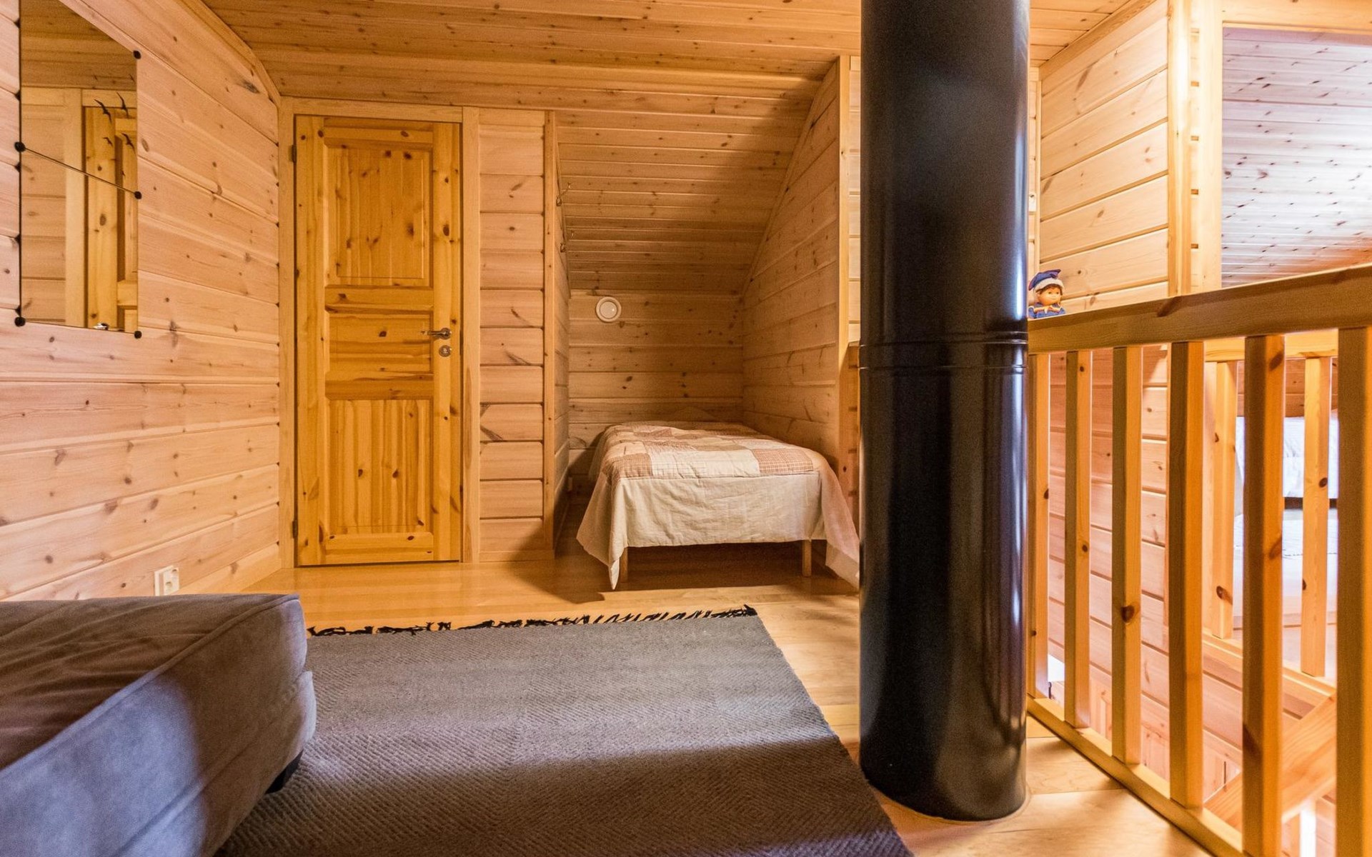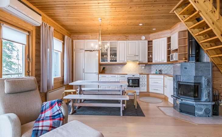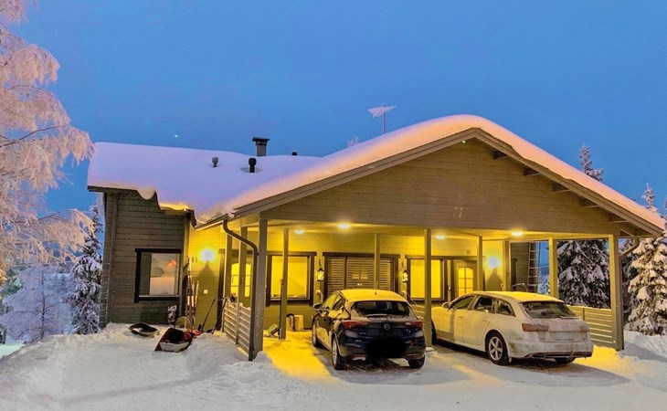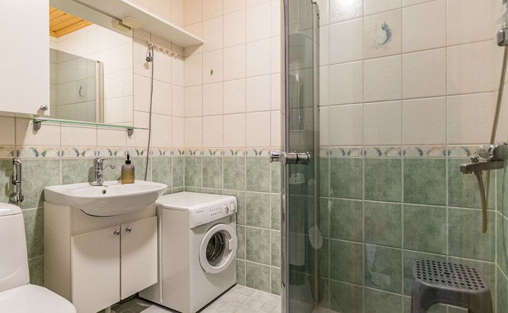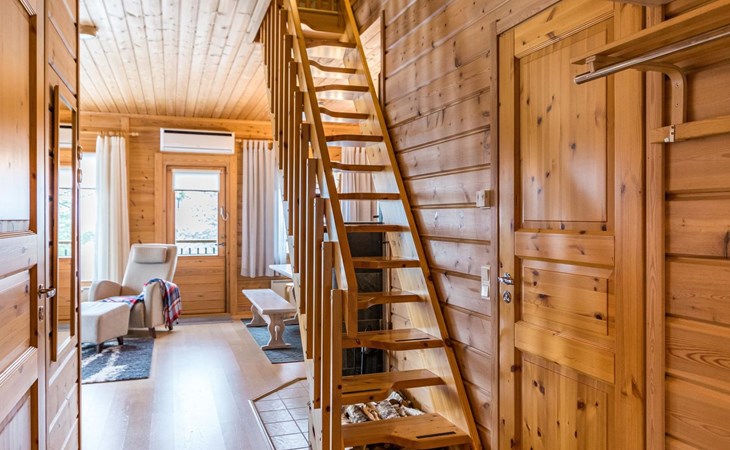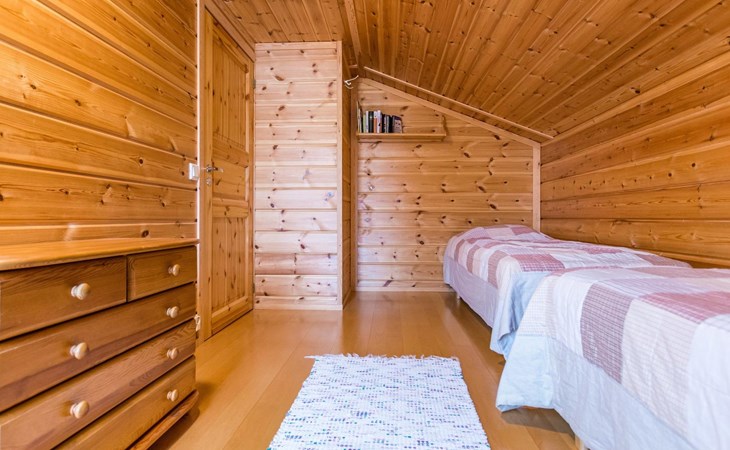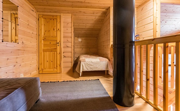 A semi-detached house built with love in 2002. Master bedroom with double bed downstairs. Bedrooms 2 and 3 upstairs. One bedroom has two beds and the other bedroom has a 120 cm wide bed. There is a bed in the upstairs hall and and sofabed/mattress. The room height upstairs is partly lower than normal. Open kitchen, living room, pantry, washroom, two toilets, electric sauna. Note: the refrigerator includes a freezer compartment.