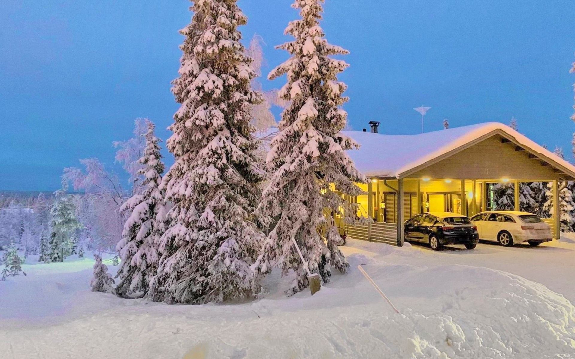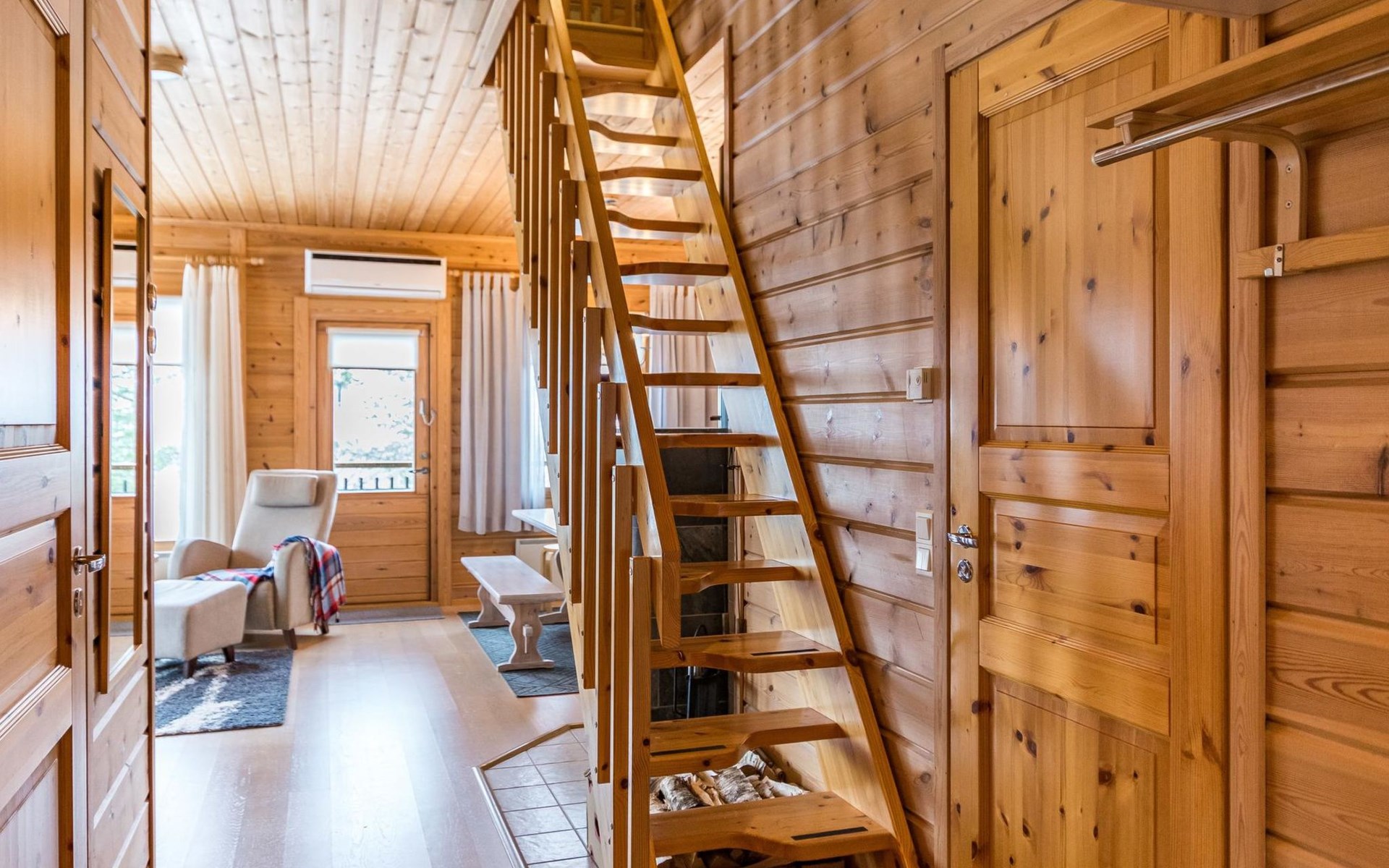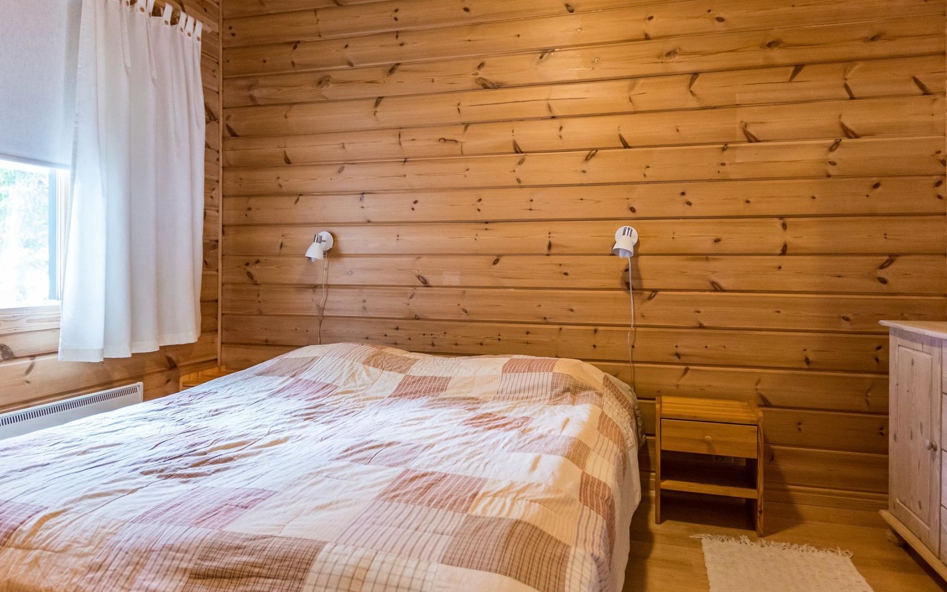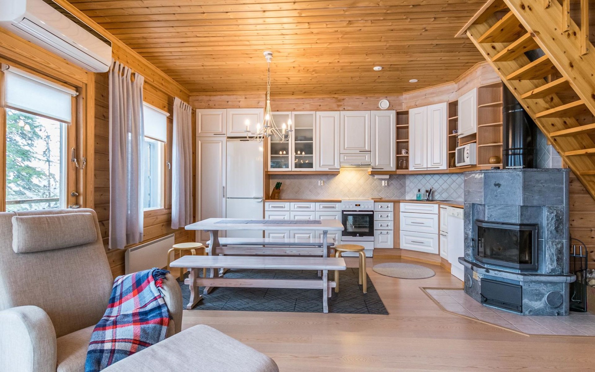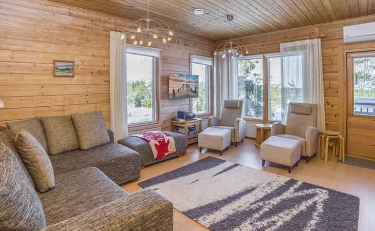 A semi-detached house built with love in 2002. Master bedroom with double bed downstairs. Bedrooms 2 and 3 upstairs. One bedroom has two beds and the other bedroom has a 120 cm wide bed. There is a bed in the upstairs hall and and sofabed/mattress. The room height upstairs is partly lower than normal. Open kitchen, living room, pantry, washroom, two toilets, electric sauna. Note: the refrigerator includes a freezer compartment.