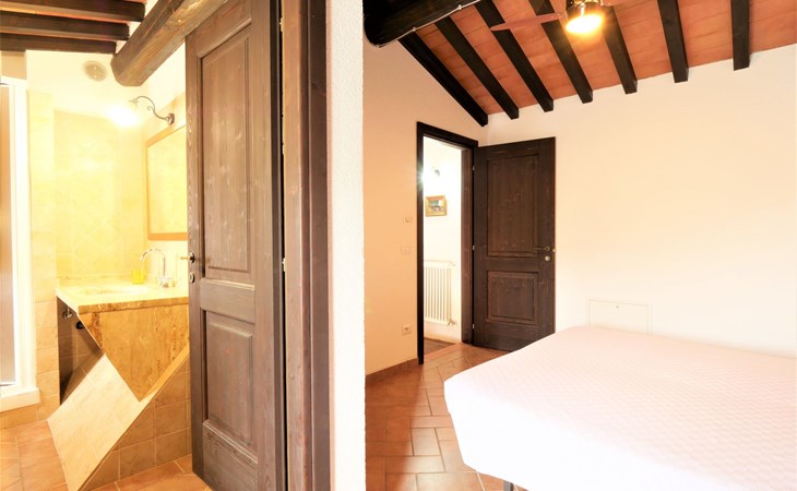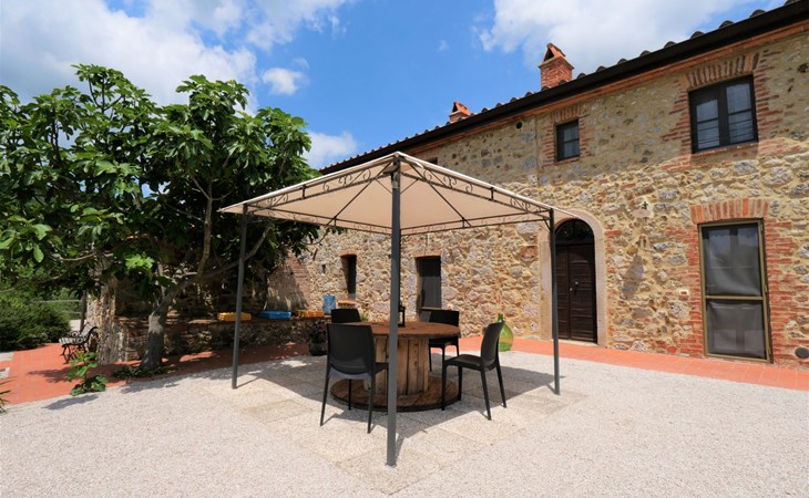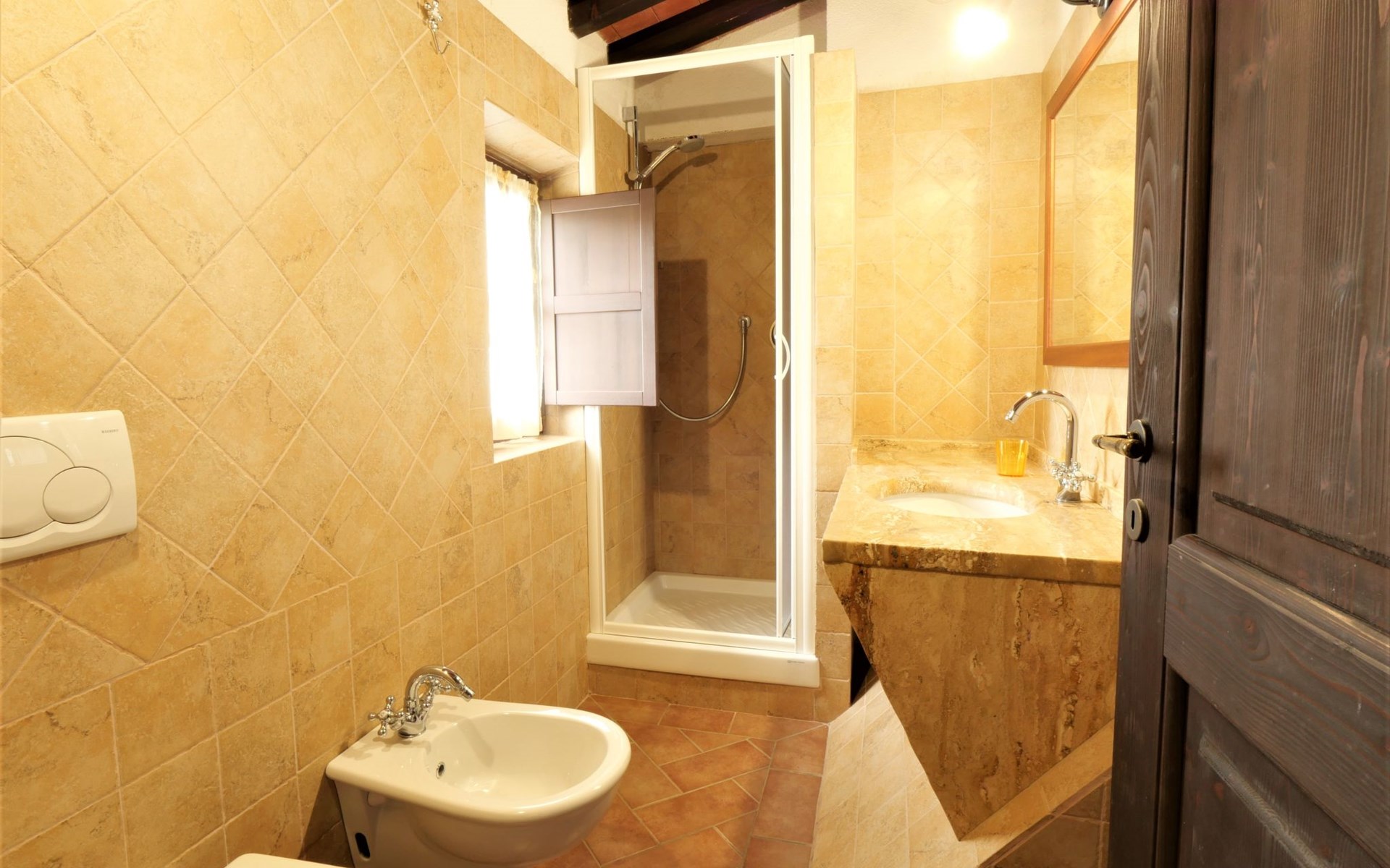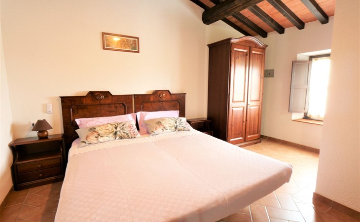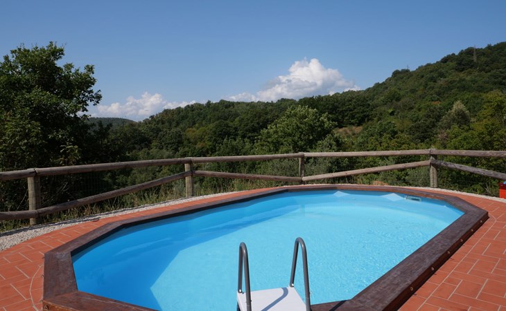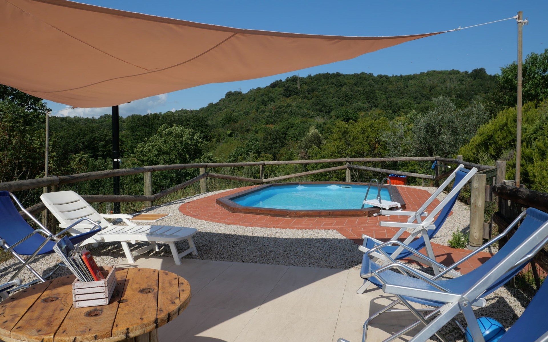 Country house "Podere Pian dei Carpini", 435 m a.s.l., detached, surrounded by trees and fields. 4 apartments in the residence. Below Prata 2.6 km from the centre of Prata, 10 km from the centre of Massa Marittima, in a secluded, quiet position, 30 km from the sea, in the countryside. For shared use: natural state property 2'000 m2 (fenced), garden with flowers and trees, meadow, swimming pool fenced (6 x 4 m, depth 120 - 130 cm, seasonal availability: 28.May. - 30.Sep.) with salt-electrolysis pool-cleaning system. Unconventional pool shape. Outdoor shower, boccia, garden furniture, barbecue. Steep motor access (700 m via unmade road). Parking (for 3 cars) on the premises. Shop 2.6 km, supermarket 10 km, restaurant 2.6 km, bicycle rental 11 km, bus stop 2 km, sandy beach 30 km. Walking paths from the house 50 m. Nearby attractions: San Galgano Abbey 22 km, Giardino dei suoni 11 km, Siena 60 km. Well-known lakes can easily be reached: Accesa 20 km. Hiking paths: Mountain-bike 7 km. Please note: the owner lives in the same residence. The owner has a dog. Small house for children and swing. The pool can be reached via an external staircase.